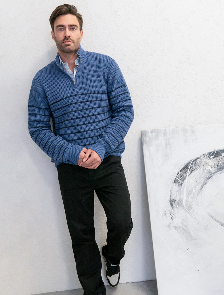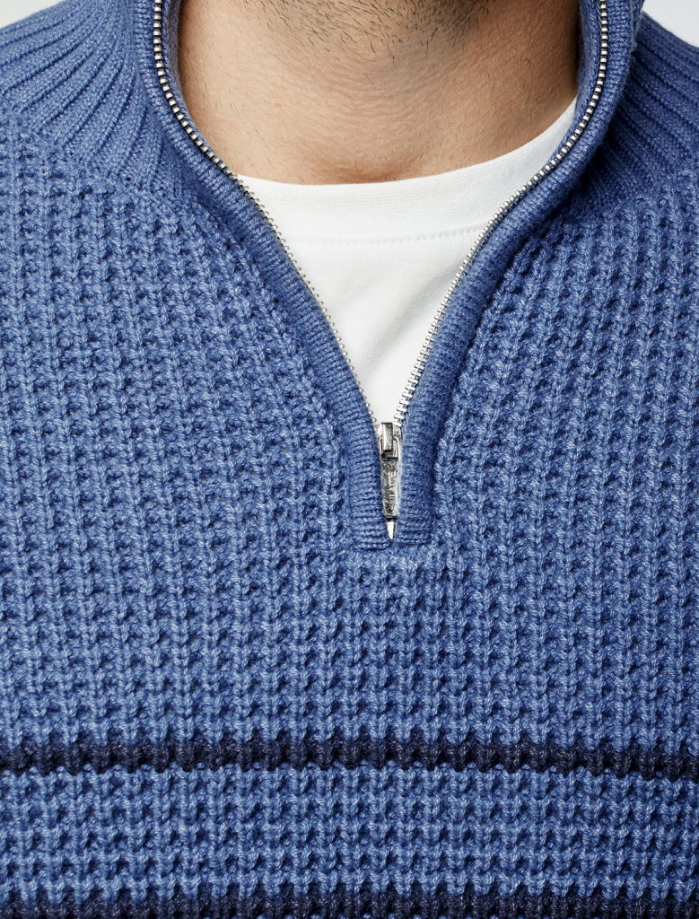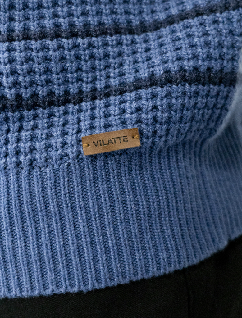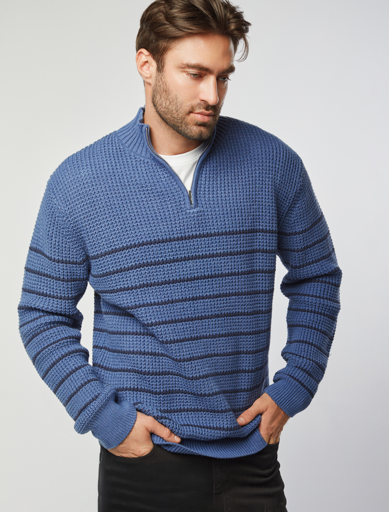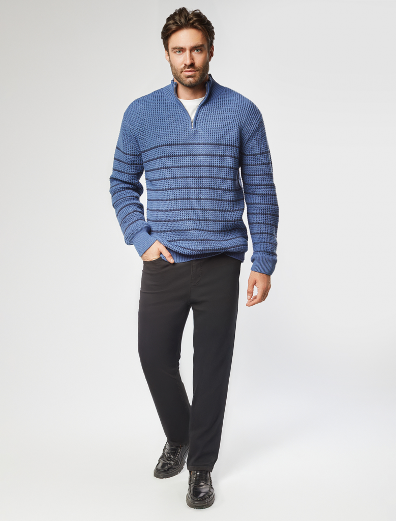 Свитер с узором полосы выполнен из хлопковой пряжи с добавлением акрила. Теплая модель фактурной крупной вязки с воротом, застегивается металлической молнией. Регулируя ворот можно носить с рубашками, футболками и водолазками. Кроме того, свитер совершенно не колется, поэтому его комфортно носить даже на голое тело. Внизу изделия нашивка бренда из эко-кожи.