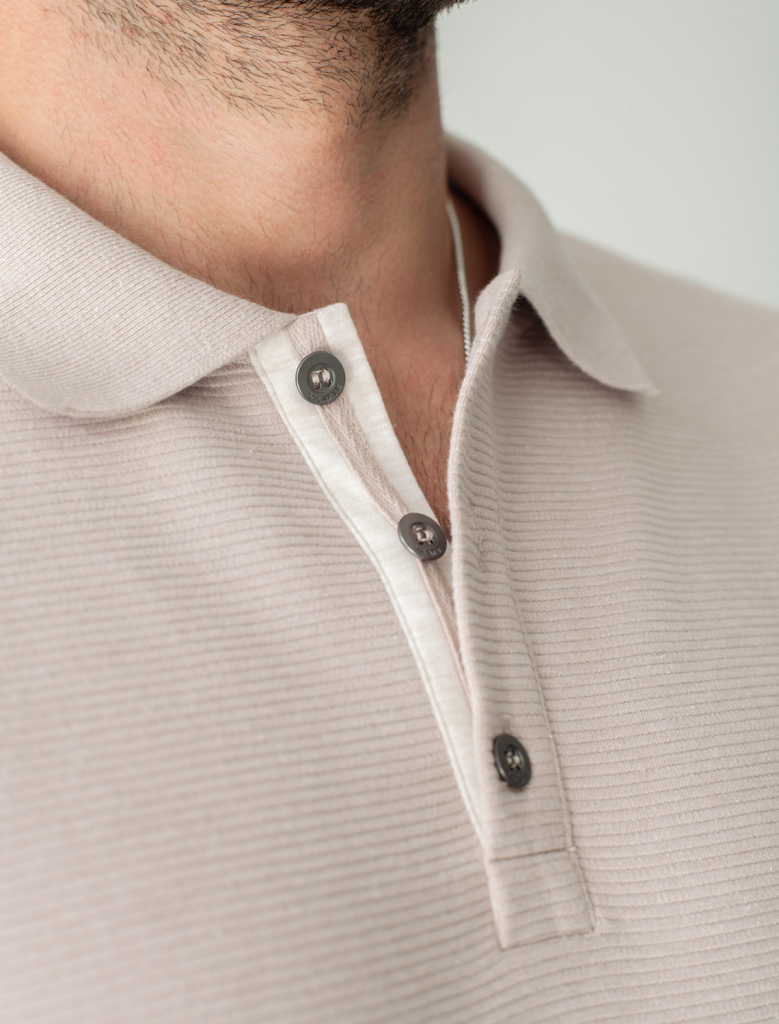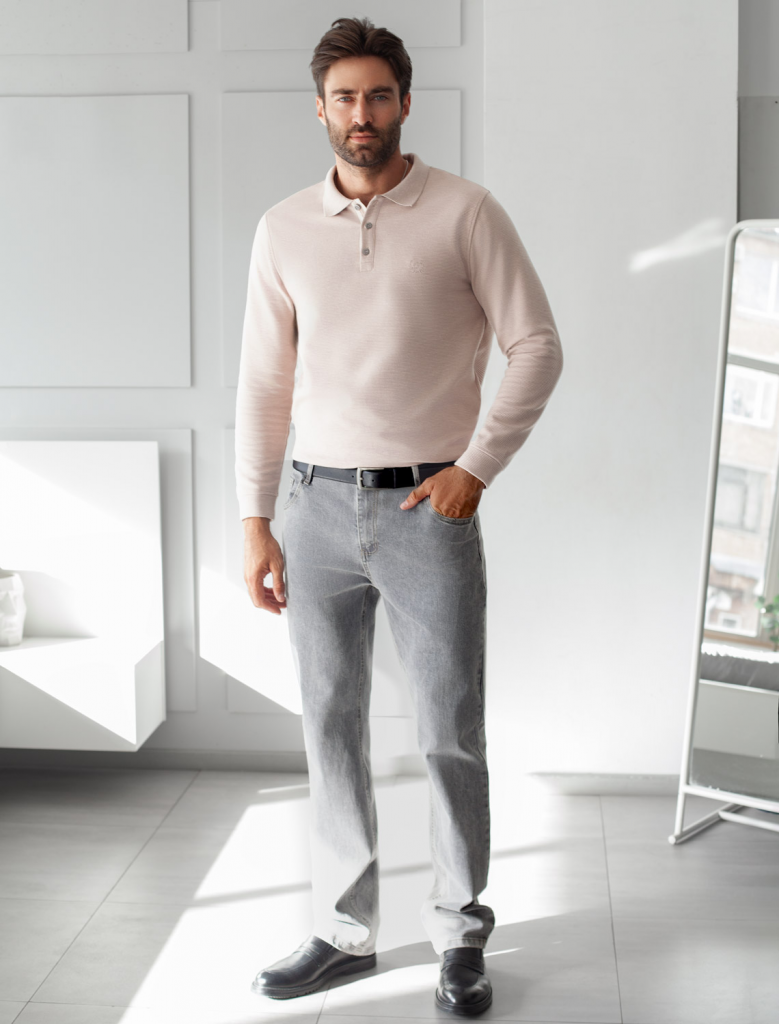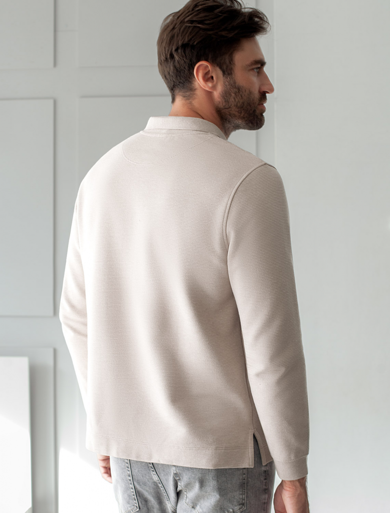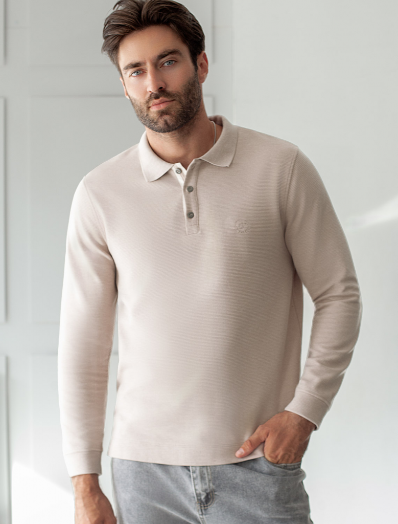 Стильный лонгслив светло-кофейного цвета с эффектом меланж с плетеным воротником поло с застежкой на металлические пуговицы выполнен из премиального хлопка в сочетании с эластаном .Невероятно мягкая ткань из натуральных волокон - она едва ощутима на коже и словно обнимает тело. Материал при касании кажется бархатистым, при движении он словно повторяет все мельчайшие линии фигуры. По свойствам материал сочетает в себе практичность и нежность: отлично провускает воздух, сохраняя ощущение свежести в течение всего дня, при этом созраняет тепло в прохладную погоду.Идеально подходит для чувствительной кожи, не вызывает раздражения и дискомфорта. Удобный отложной воротник с контрастной отделкой делает образ современным и стильным, а длинные рукава с манжетами защищают руки при ветреной погоде. Поло хорошо садится по фигуре благодаря добавлению эластичных волокон — такой вариант подходит для мужчин любого роста и размеров, не стесняет движений и создает ощущение свободы и легкости. Лонгслив с пуговицами дополнен