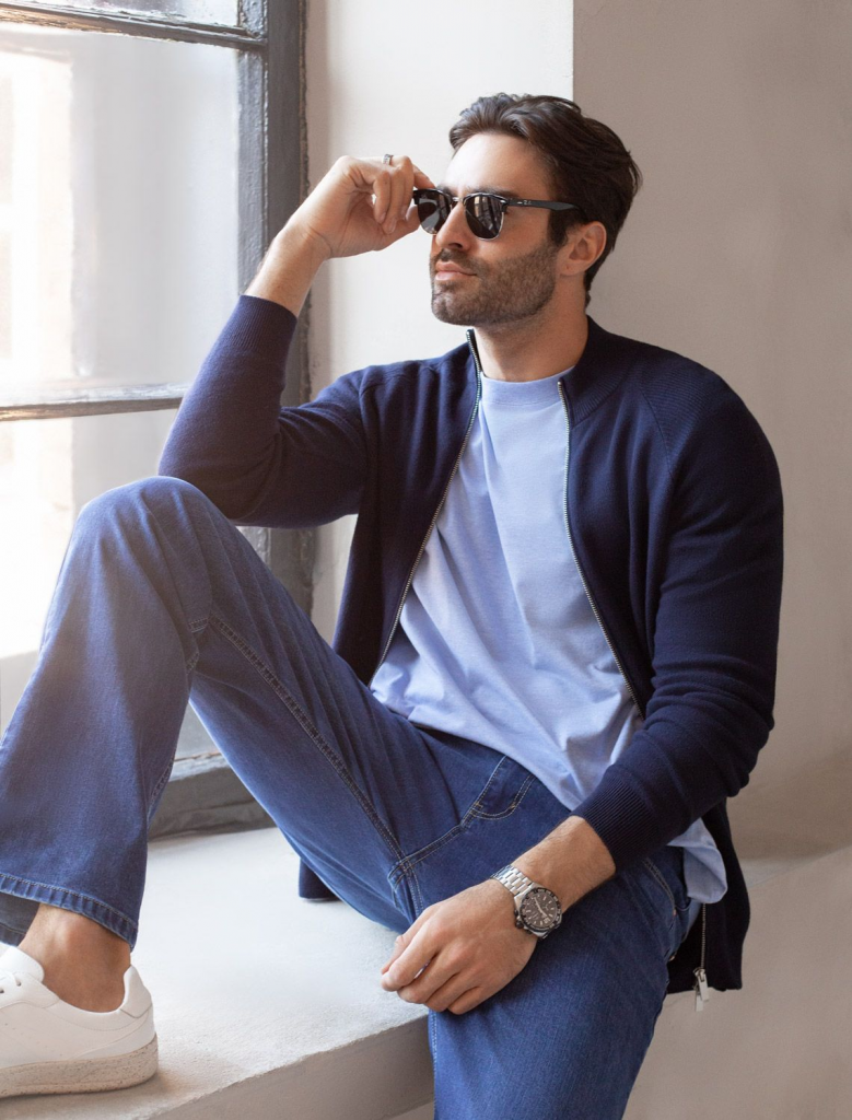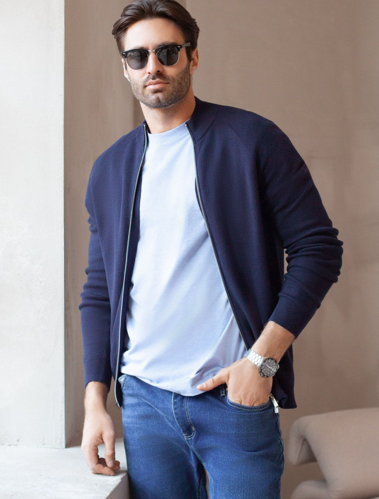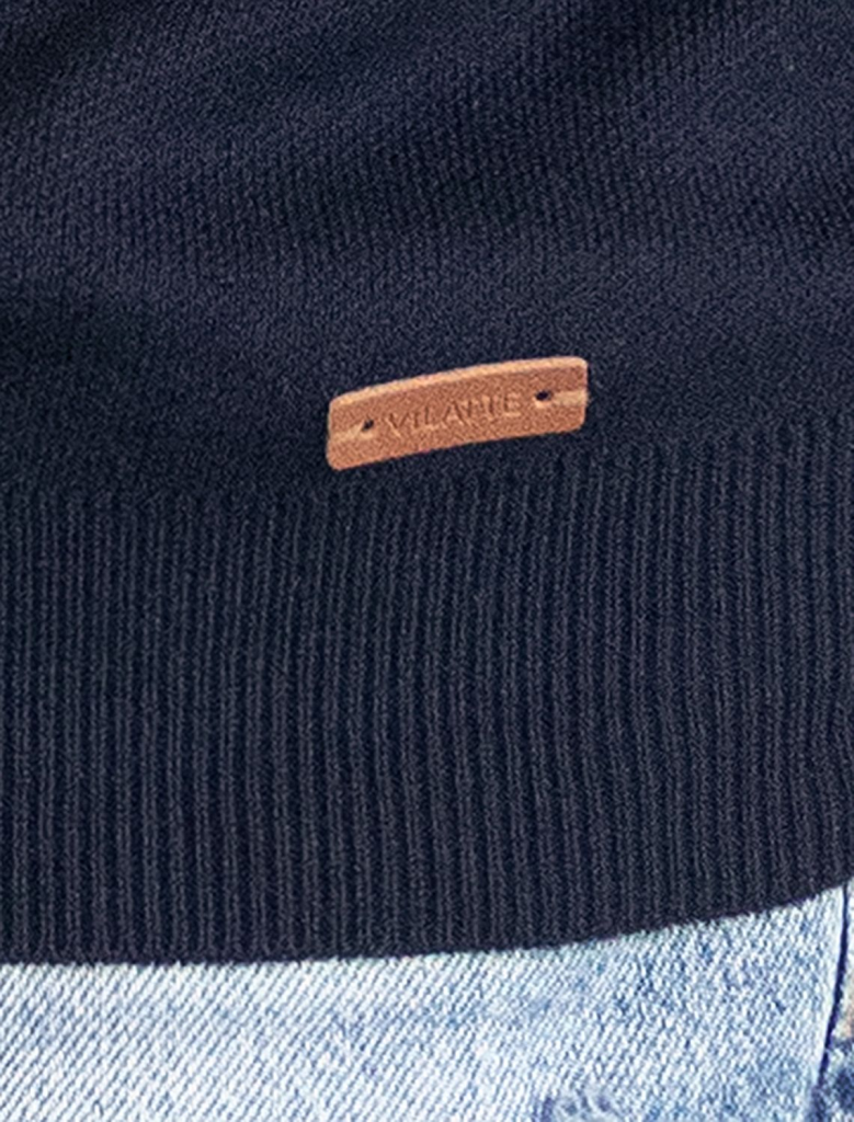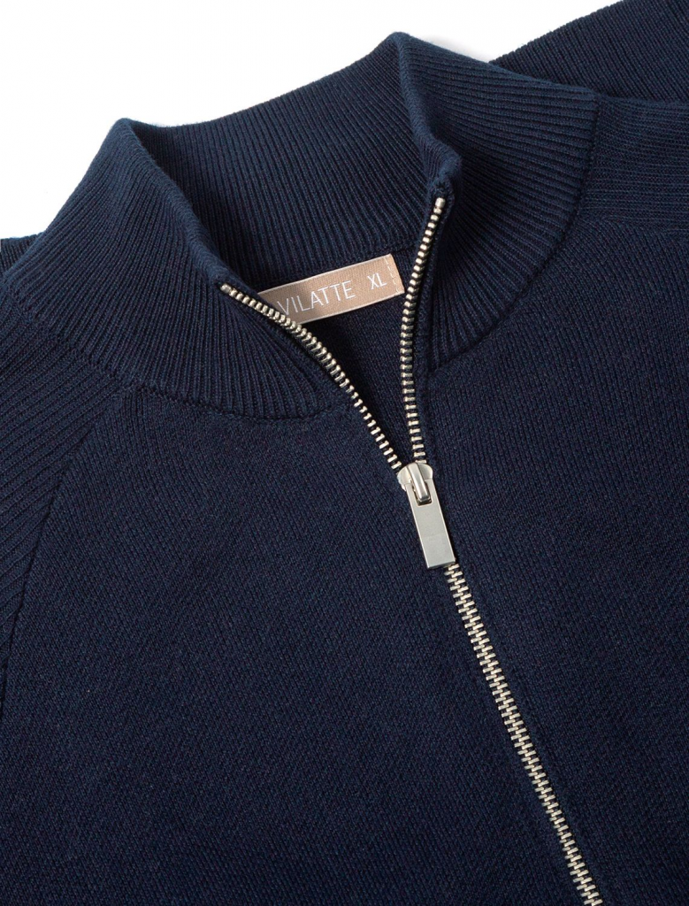 Темно-синий джемпер с длинными рукавами поддержит образы любой палитры и сложности. За многофункциональность отвечают лаконичный крой и застежка на молнию. Изделие связано из премиального хлопка с добавлением акрила, которые не дадут замерзнуть в прохладный день на улице, но при этом не перегревает в помещении.