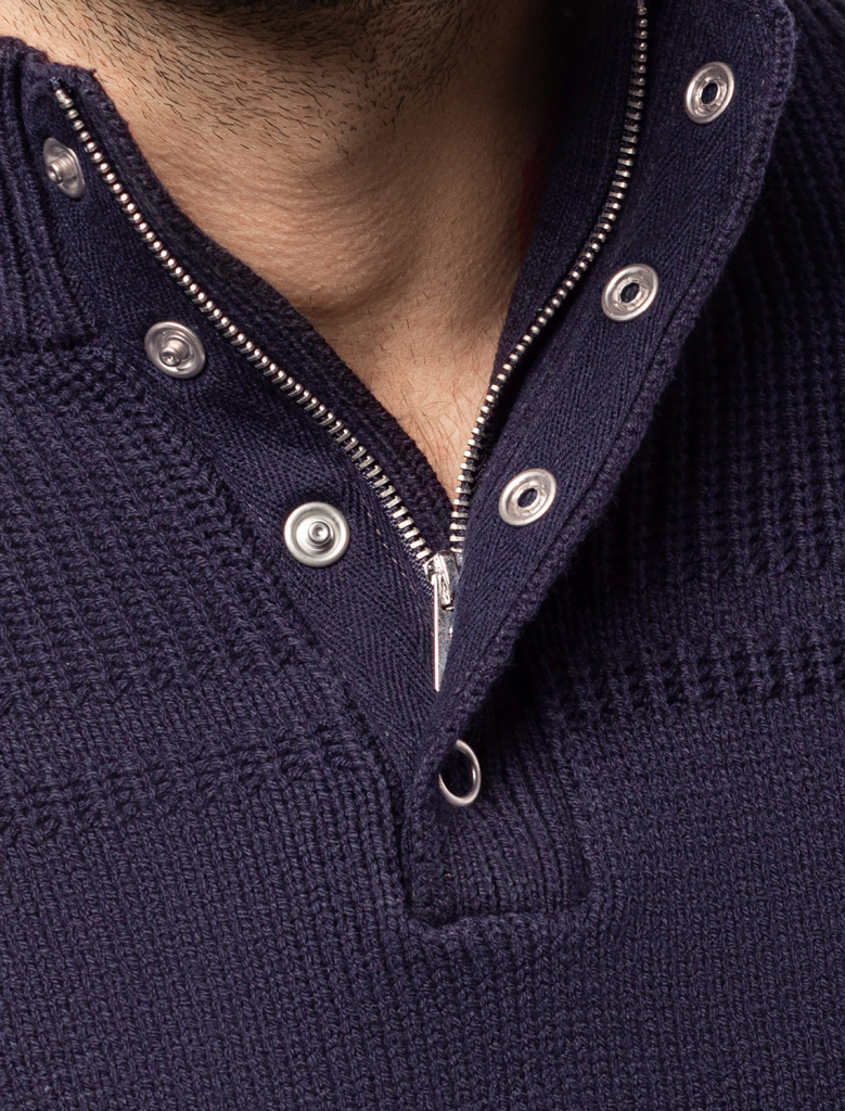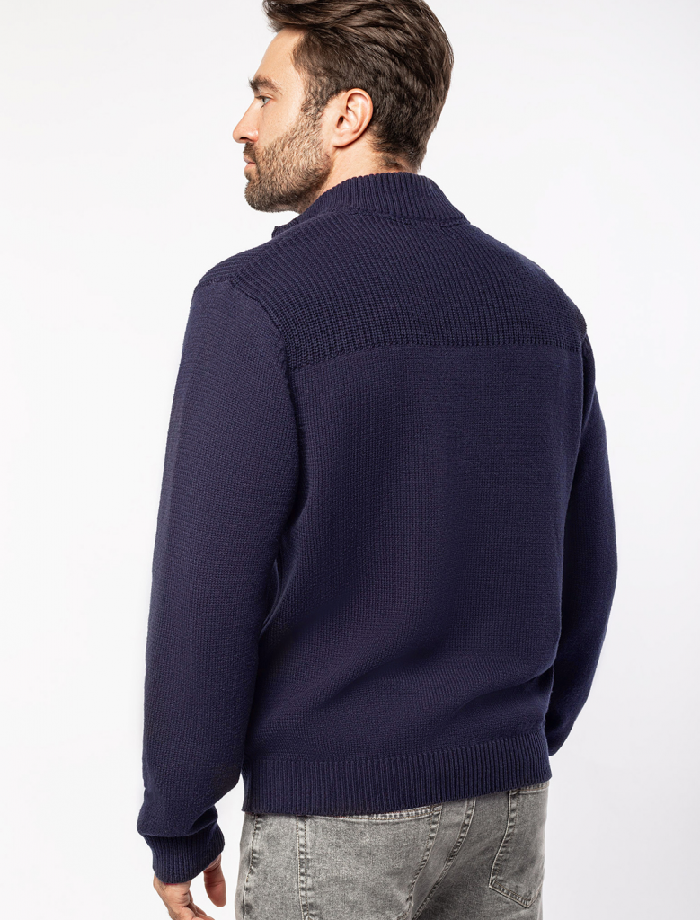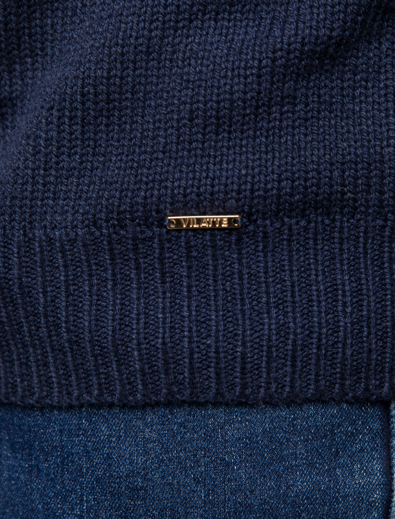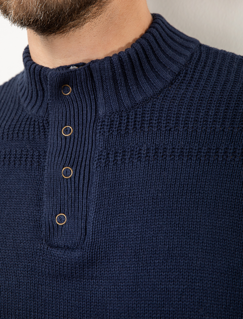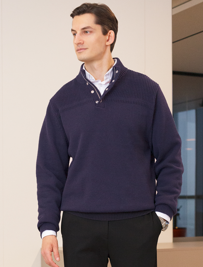 Свитер фактурной вязки с застежкой на крупные кнопки выполнен из мягкой хлопковой пряжи с добавлением акрила. Модель из такого материала не препятствует циркуляции воздуха, но при этом хорошо сохраняет тепло и не колется, поэтому ее комфортно носить на голое тело. С помощью кнопок можно регулировать высоту воротника и носить свитер по-разному. Внизу изделия нашивка бренда из эко-кожи.