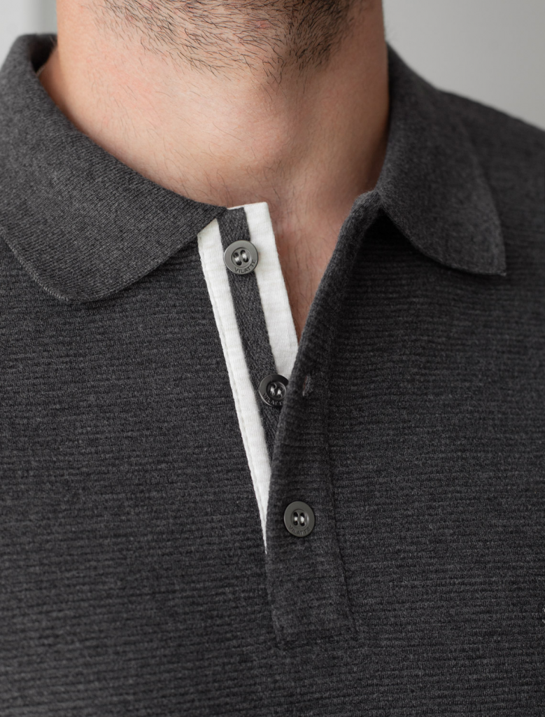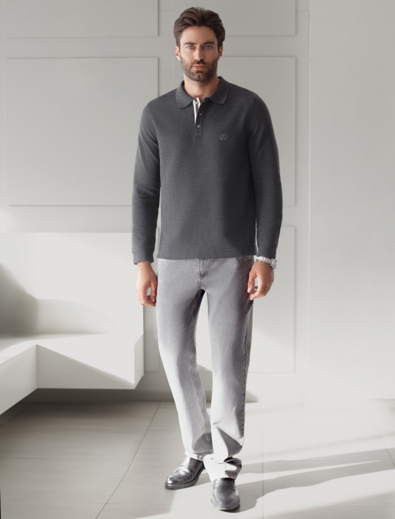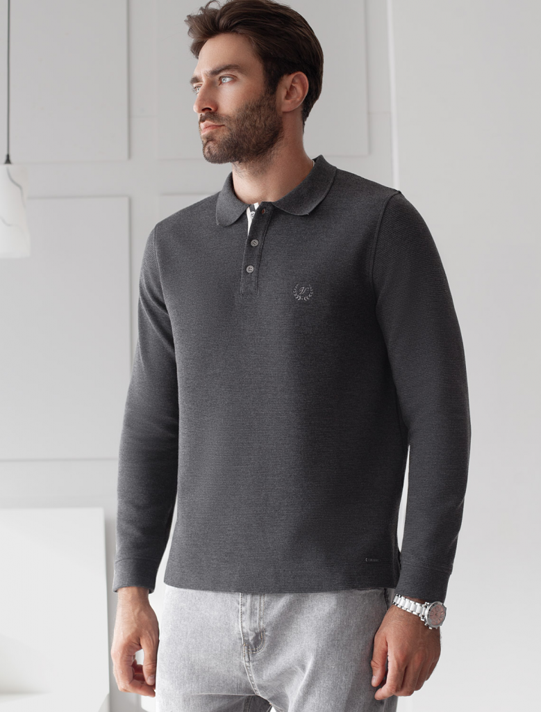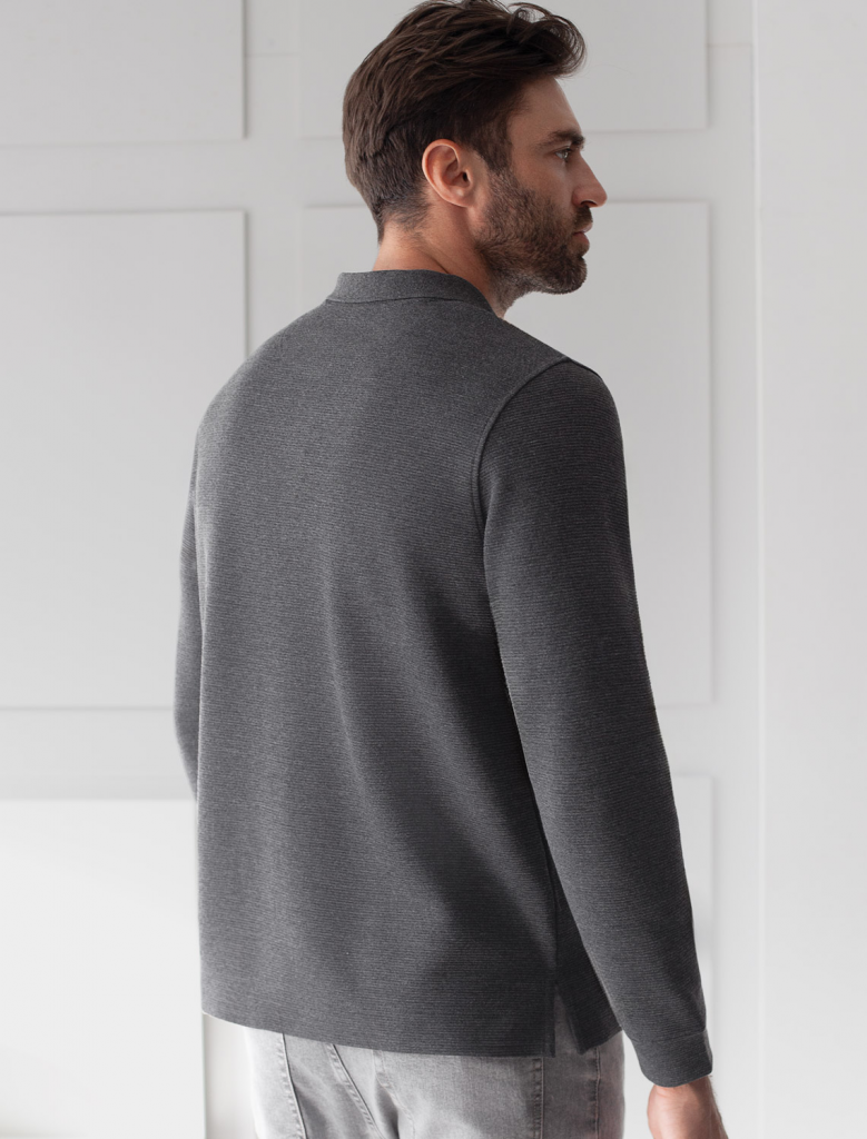 Стильный лонгслив темно-серого цвета с эффектом меланж с плетеным воротником поло с застежкой на металлические пуговицы выполнен из премиального хлопка в сочетании с эластаном . Невероятно мягкая ткань из натуральных волокон - она едва ощутима на коже и словно обнимает тело. Материал при касании кажется бархатистым, при движении он словно повторяет все мельчайшие линии фигуры. По свойствам материал сочетает в себе практичность и нежность: отлично провускает воздух, сохраняя ощущение свежести в течение всего дня, при этом созраняет тепло в прохладную погоду.Идеально подходит для чувствительной кожи, не вызывает раздражения и дискомфорта. Удобный отложной воротник с контрастной отделкой делает образ современным и стильным, а длинные рукава с манжетами защищают руки при ветреной погоде. Поло хорошо садится по фигуре благодаря добавлению эластичных волокон — такой вариант подходит для мужчин любого роста и размеров, не стесняет движений и создает ощущение свободы и легкости. Лонгслив с пуговицами дополнен н