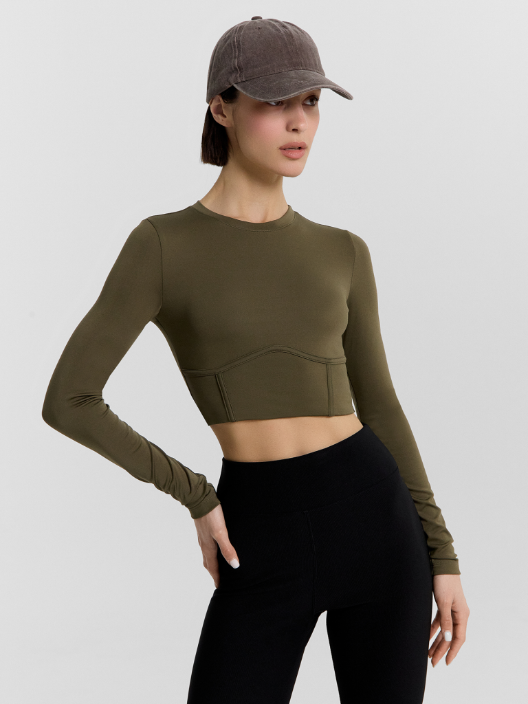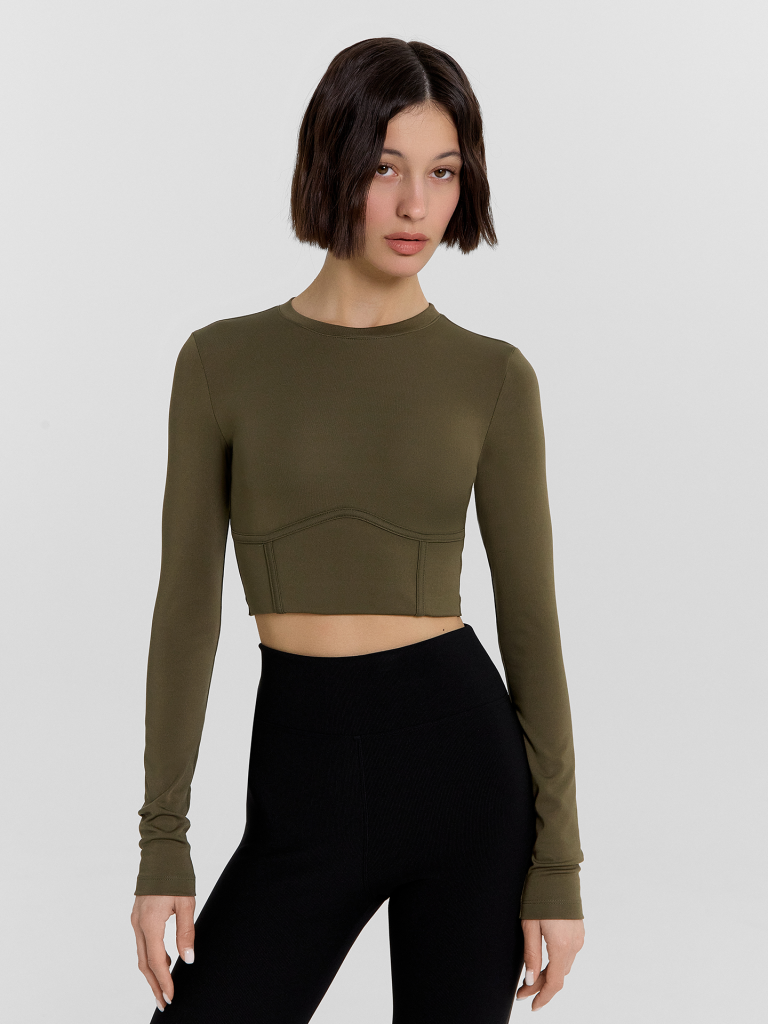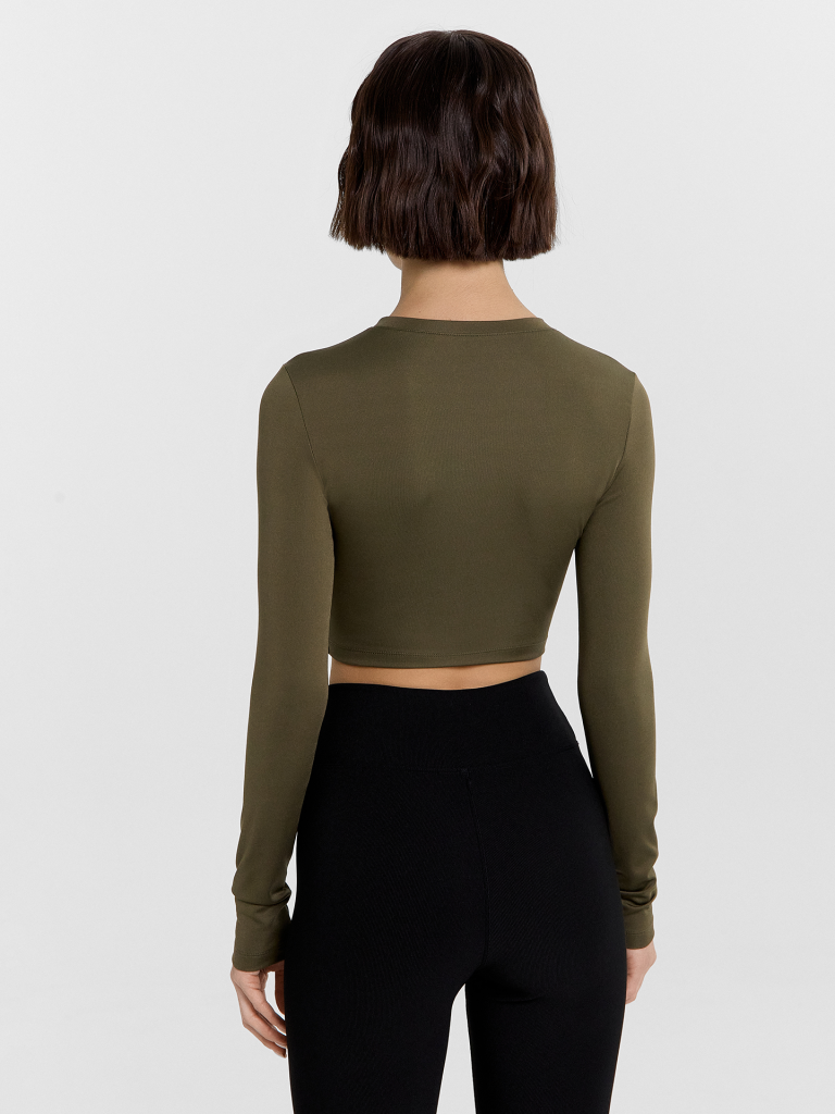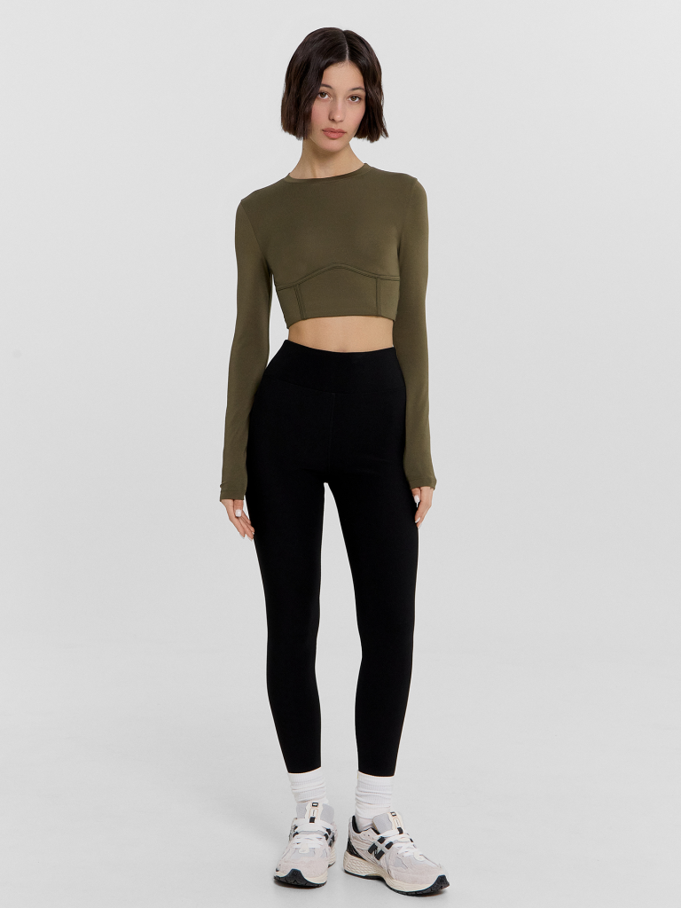 Джемпер облегающего силуэта, укороченный. Горловина округлой формы, обработана обтачкой из основного полотна.