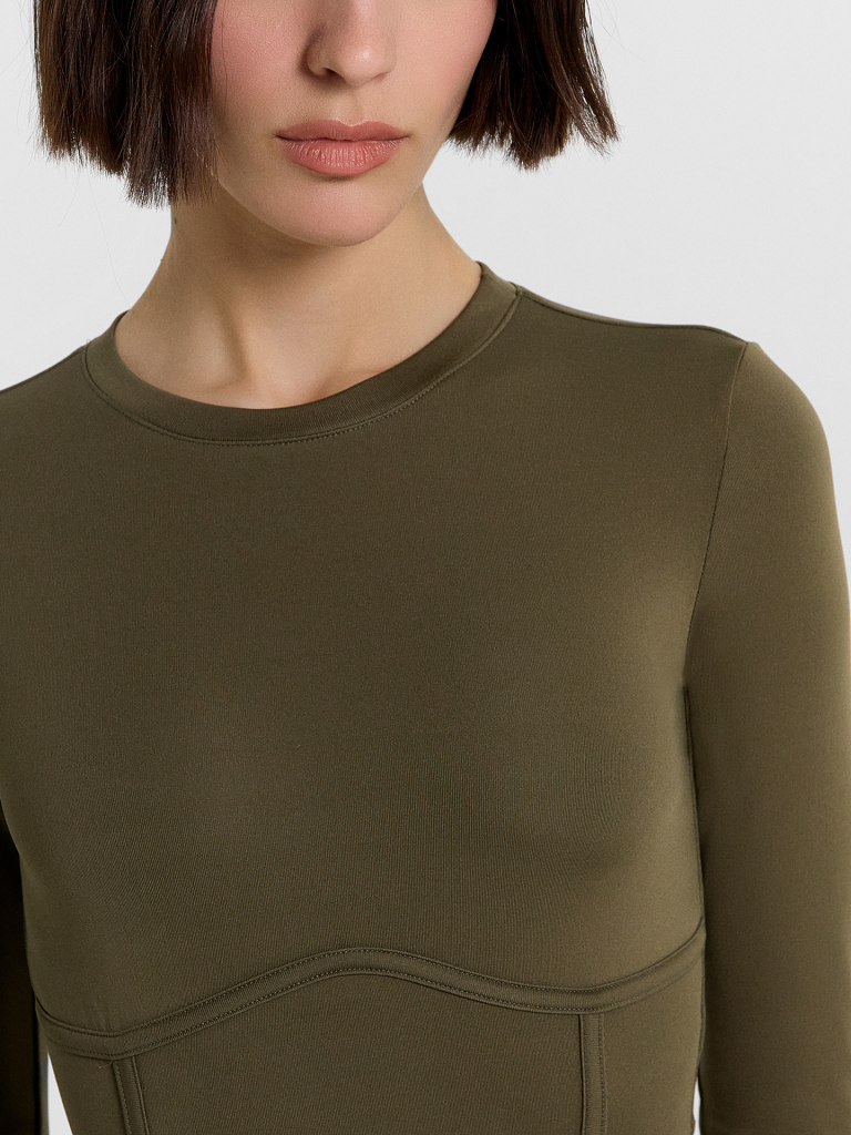 Джемпер с фигурным подрезом под грудью. Нижняя часть переда на подкладке из основного полотна. На нижней части и по фигурному подрезу настрочены лампасы из основного полотна.