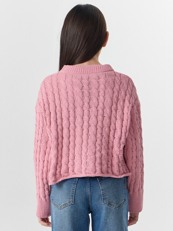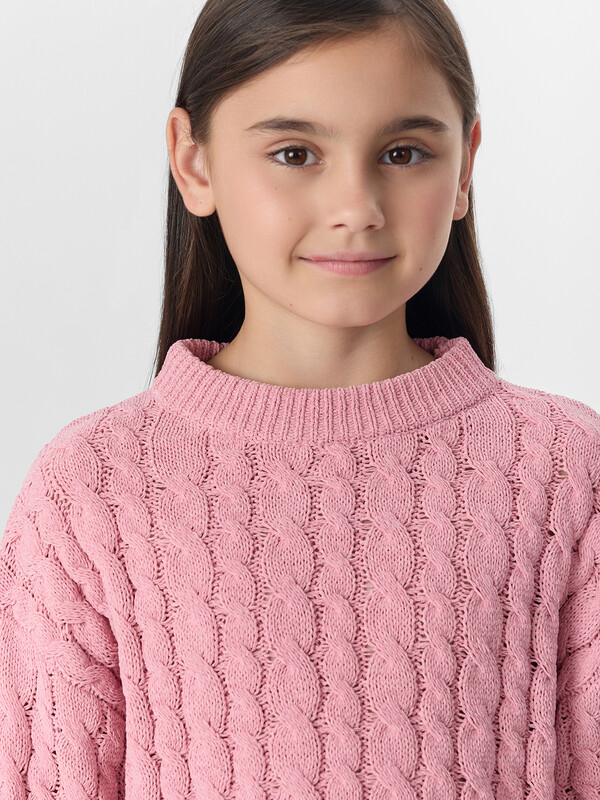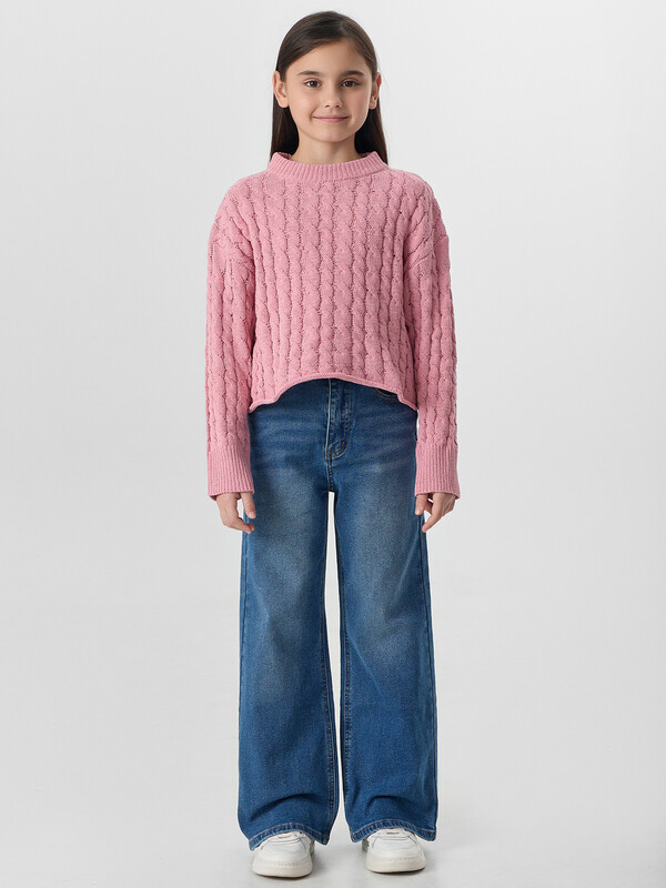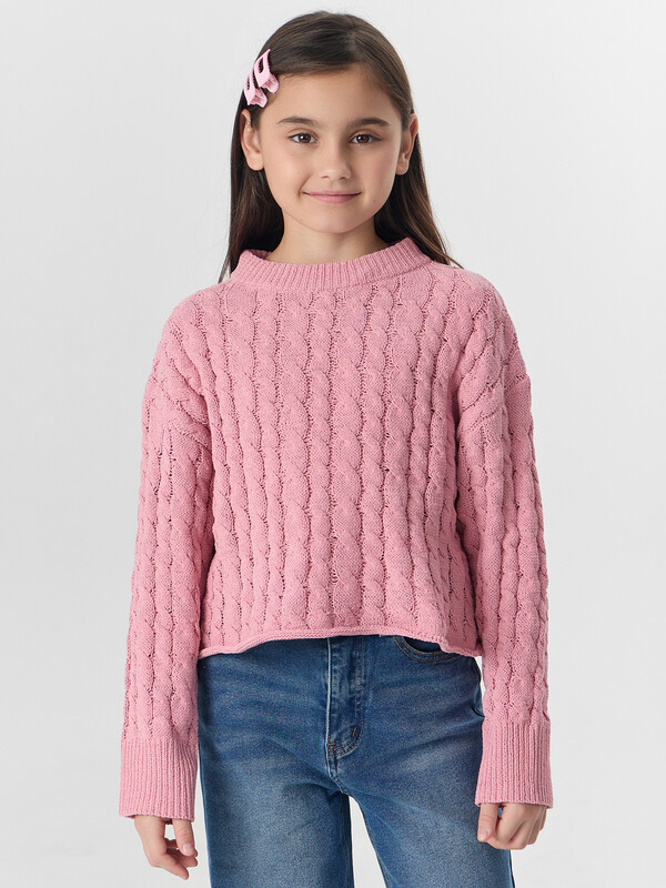 Розовый джемпер для девочек с рельефным узором «косичка» — уютная и стильная модель для повседневной носки. Укороченный прямой силуэт и длинные рукава создают современный силуэт, который хорошо сочетается с высокими брюками или юбками.