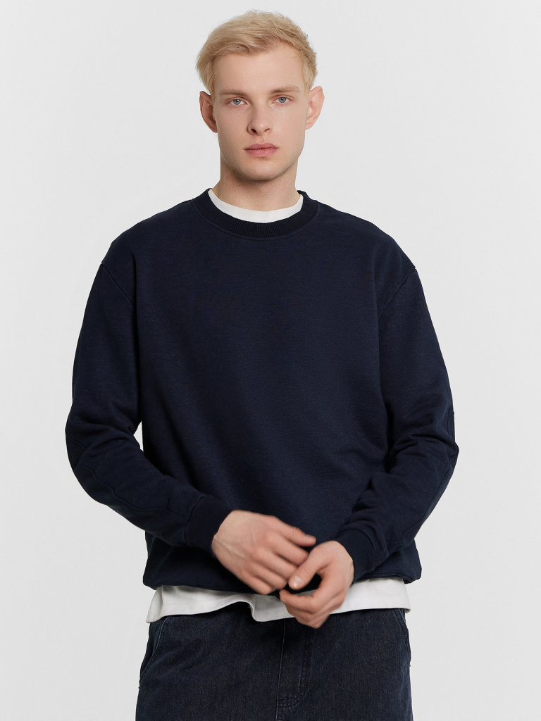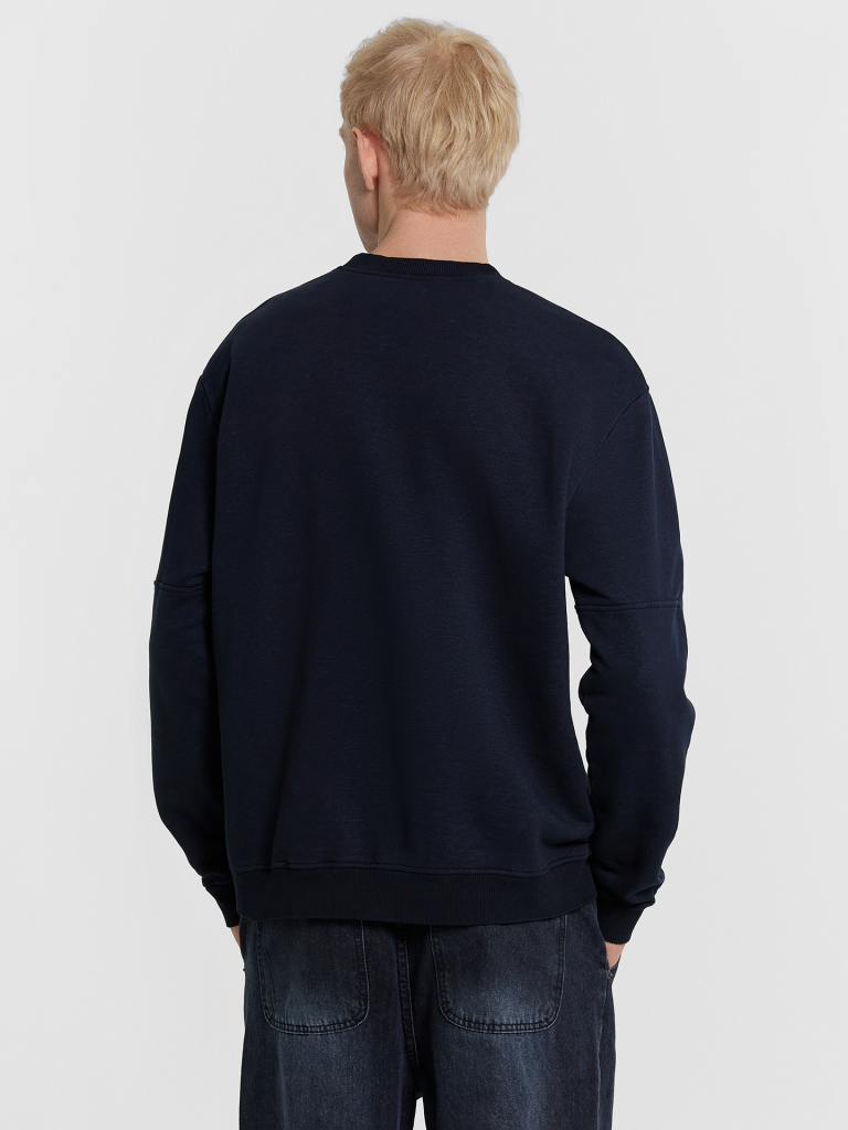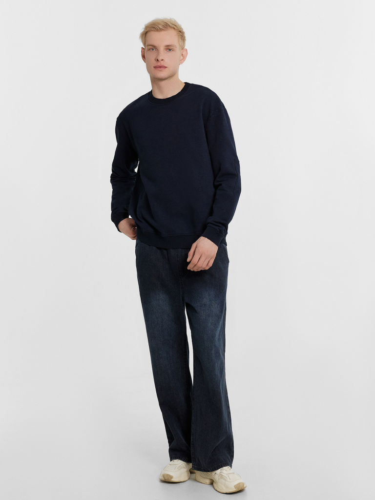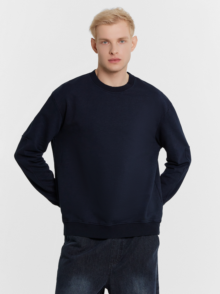 Однотонный мужской джемпер из трикотажного футера. Силуэт прямой, свободный. Вырез круглый, не глубокий, с окантовкой из рибаны. Рукава длинные, с необычной деталью сзади. Спущенная линия плеча дарит свободу движений. Манжеты и пояс сделаны из рибаны. Рекомендуем для стильных расслабленных образов!