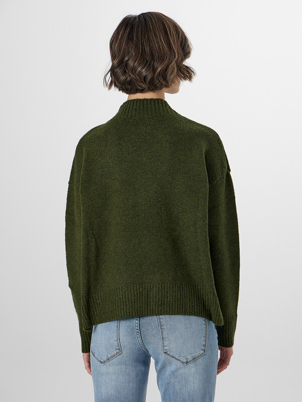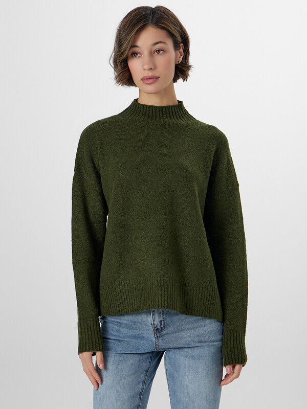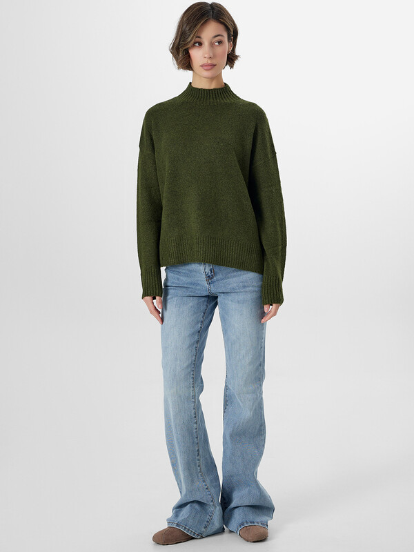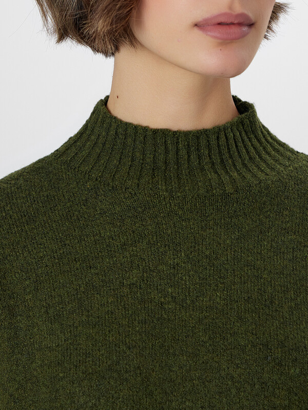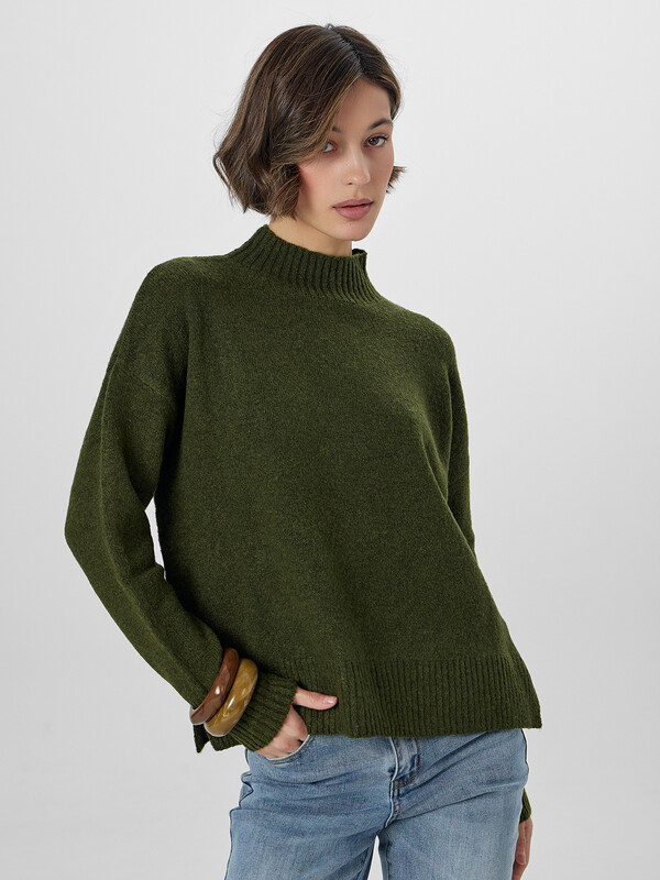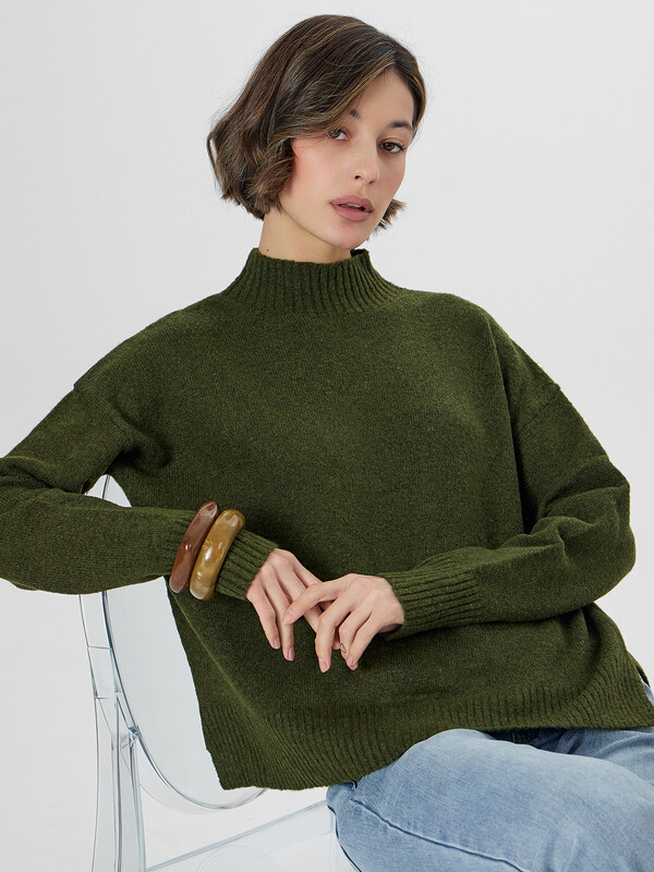 Женский джемпер для межсезонья с прямым силуэтом и уютным воротником-стойкой. Модель из мягкого трикотажа с добавлением шерсти обеспечивает комфорт в прохладные дни. Длинные рукава и лаконичный дизайн делают его подходящим для разных ситуаций, а классический покрой подчеркивает элегантность образа.