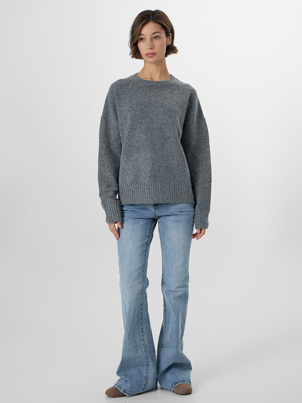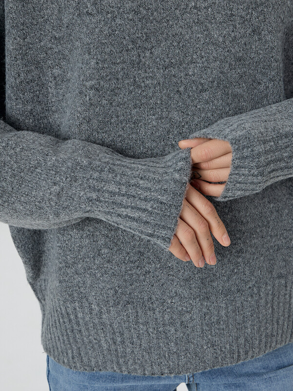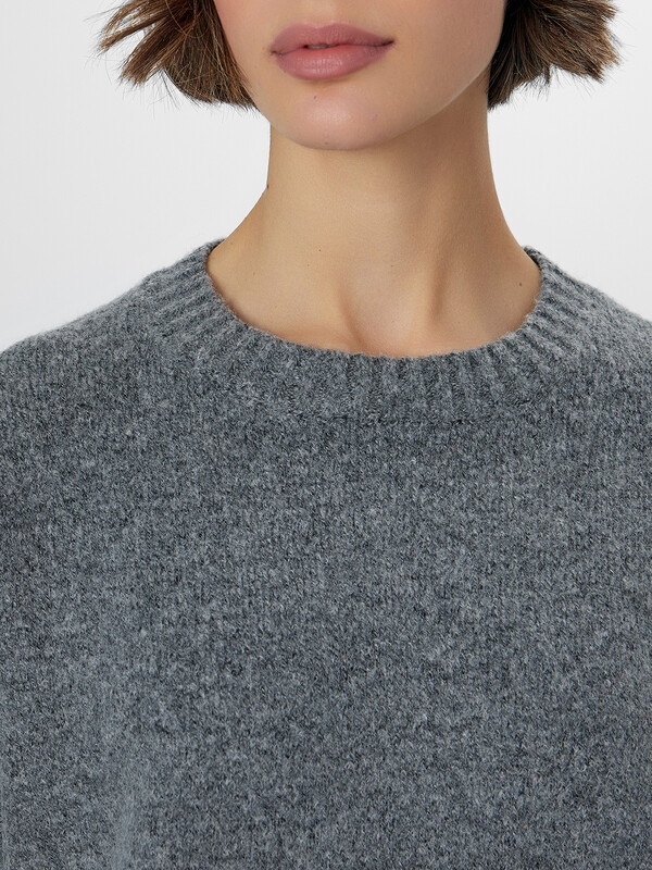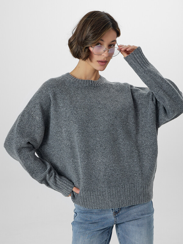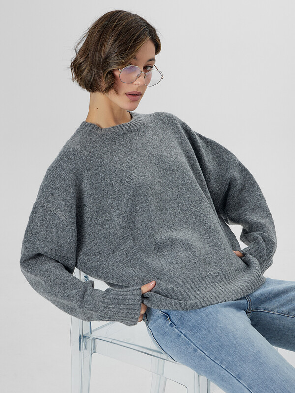 Серый женский джемпер, созданный из мягкого вязаного трикотажа с добавлением шерсти, станет источником уюта и тепла в прохладную погоду. Модель прямого силуэта обеспечивает комфортную свободу движений, позволяя легко сочетать его с различными элементами гардероба — джинсами, юбками или брюками. Длинные рукава и классическая круглая горловина придают образу сдержанную элегантность.