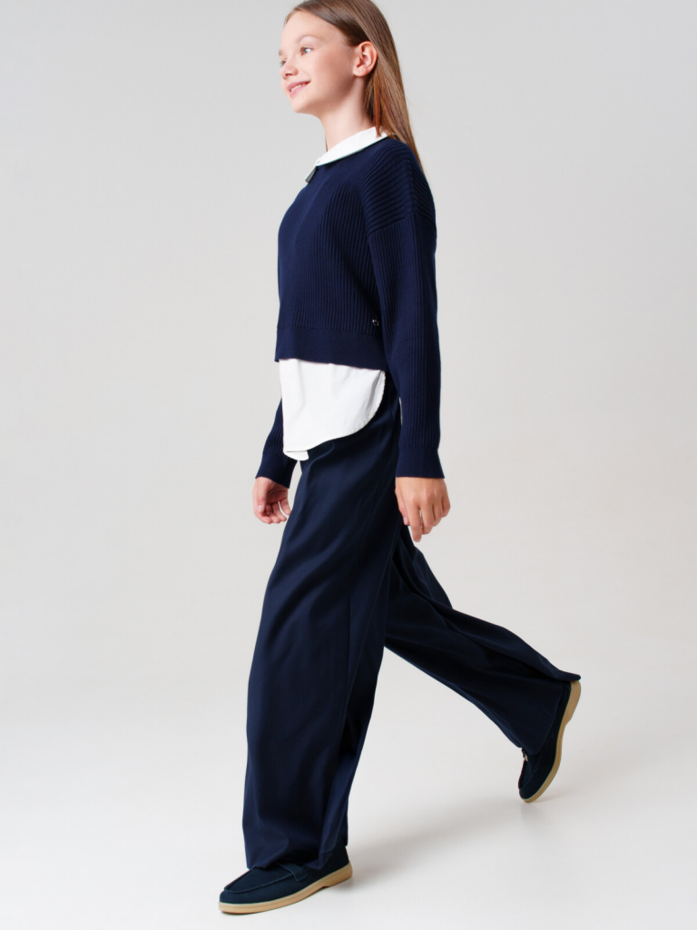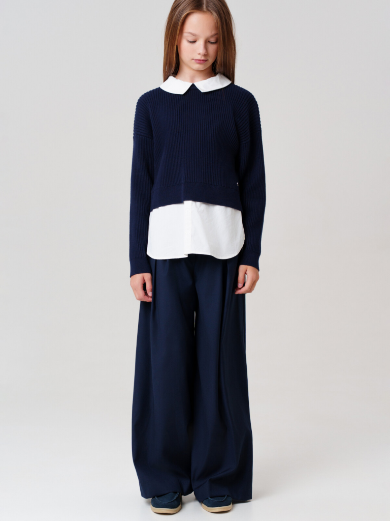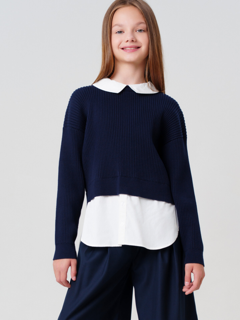 Стильный школьный синий джемпер для девочки-подростка.Этот модный джемпер для школы станет универсальным элементом гардероба юной модницы. Модель выполнена в оверсайз силуэте - свободный крой обеспечивает комфорт в движении и современный внешний вид.Ключевые особенности:+ Застежка на спинке на кнопки+ Имитация многослойностиПочему стоит выбрать:Идеально подходит для школы - сочетает удобство и аккуратный внешний видУдобный классический крой не сковывает движенияСтильный дизайн понравится подросткам, следящим за модойОтличный вариант для повседневной носки и школьных будней. Качественные материалы и продуманный крой делают этот джемпер практичным выбором для девочки-школьницы.