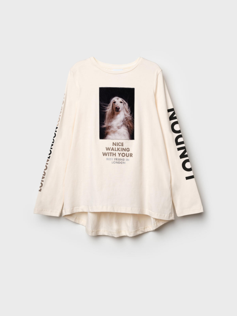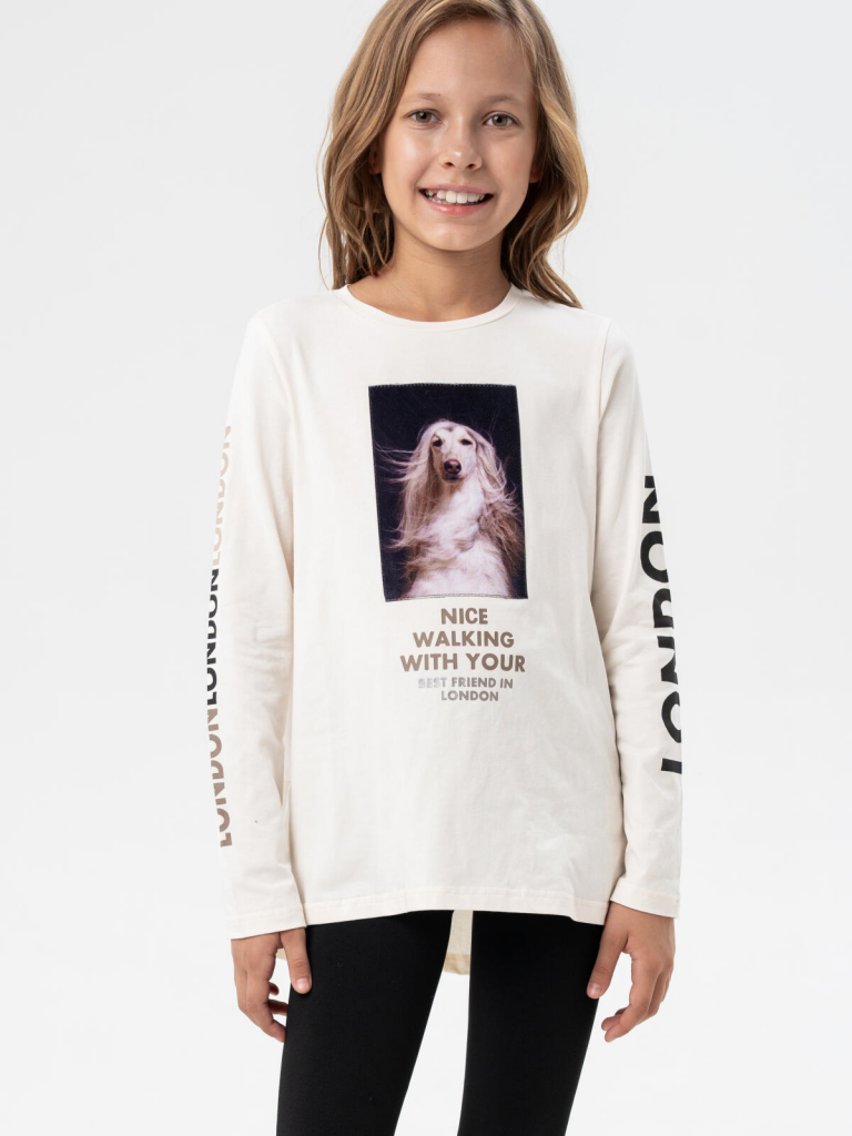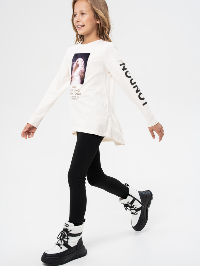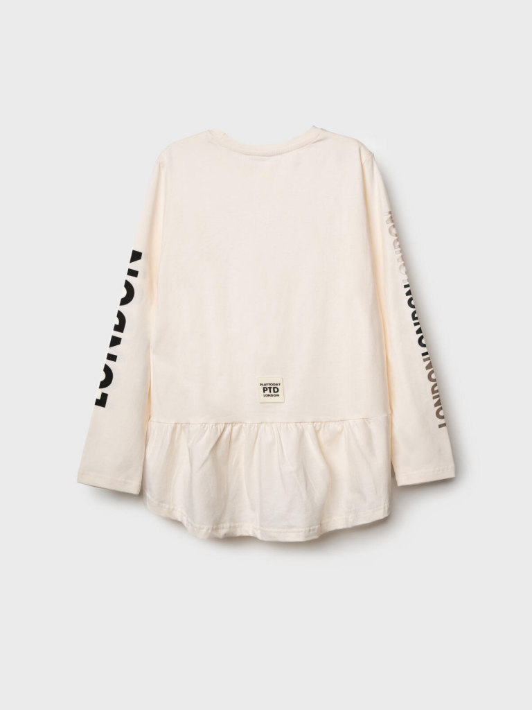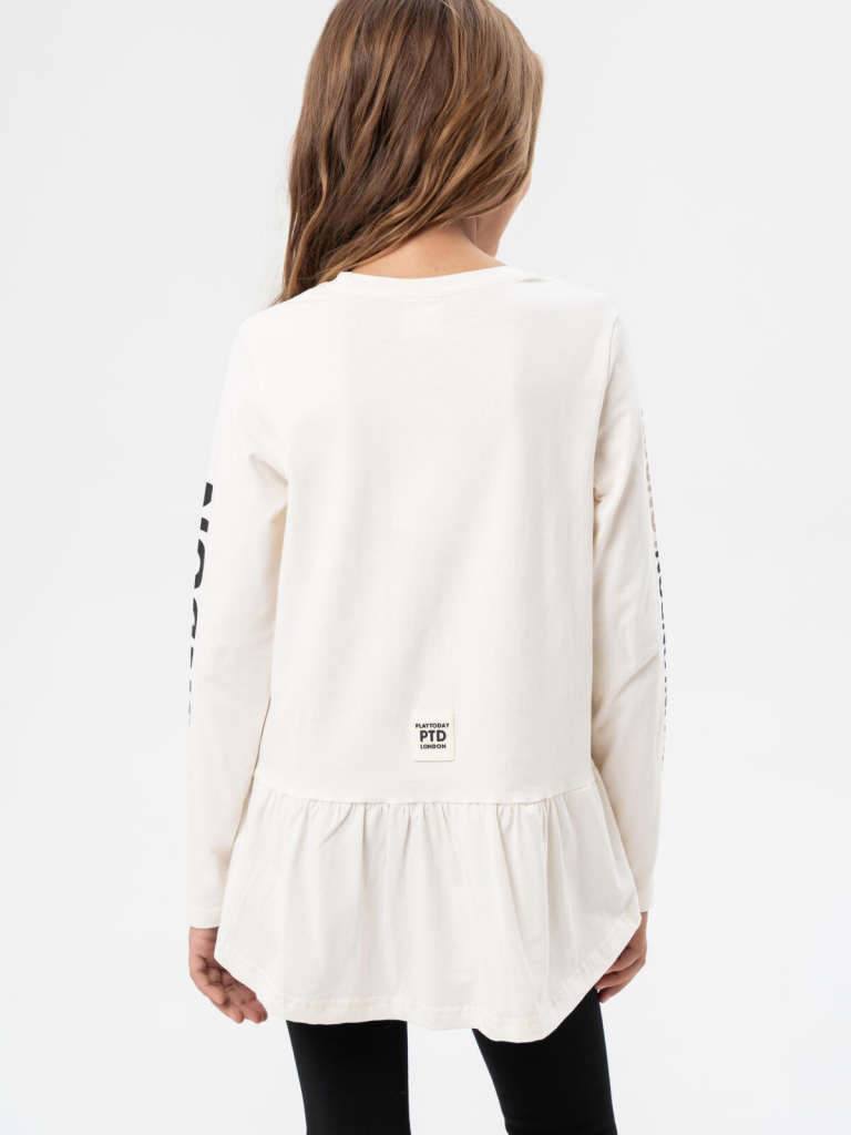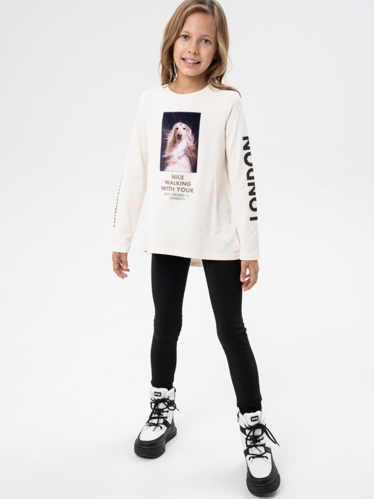 Трикотажный лонгслив оверсайз от PlayToday для девочки подростка — модная футболка с длинным рукавом и декоративной баской. Преимущества модели:+ модный лонгслив оверсайз с длинным рукавом — свободная посадка и трендовый силуэт+ декоративная баска по низу — нежный акцент и модная деталь+ яркий принт на велюре — плотный, долговечный и эффектный+ эластичный трикотаж — мягкий, дышащий, комфортныйОбъёмный силуэт, трендовый принт на велюре и надписи на рукавах делают эту модель стильным акцентом подросткового гардероба. Лонгслив выполнен из приятного к телу эластичного трикотажа и не сковывает движения.Когда и как носить:Идеальный вариант для повседневной носки: в школу, на прогулку, в гости или в торговый центр. Уместен в демисезон или зимой как первый слой под свитшот или худи.Советы по стилю:Сочетайте с джинсами, леггинсами, юбками или брюками. Идеально смотрится с обувью на платформе или массивными кроссовками. Баска добавляет романтичности образу, а оверсайз-силуэт делает лук расслабленным и модным. Отличный вариант для городской подростковой моды. Подходит для девочек от 8 до 16 лет.