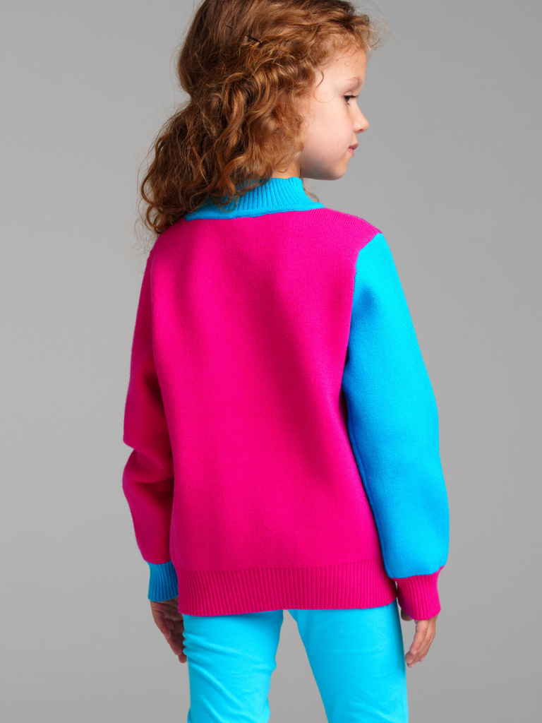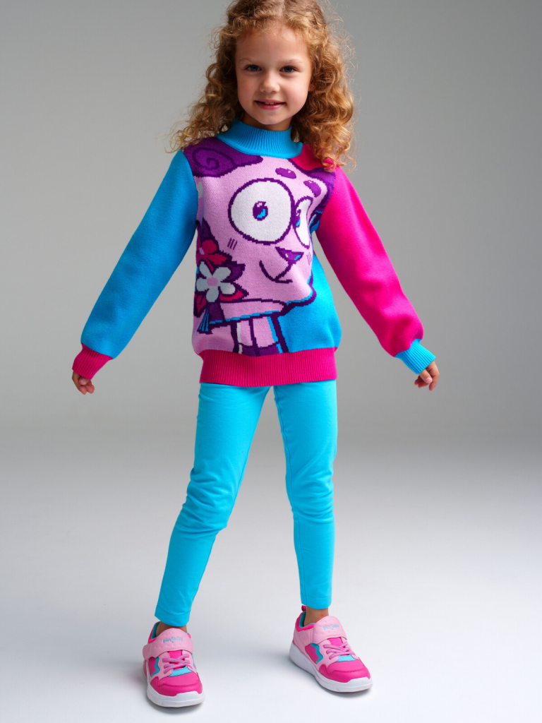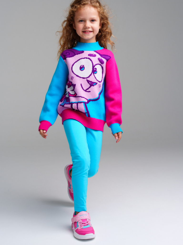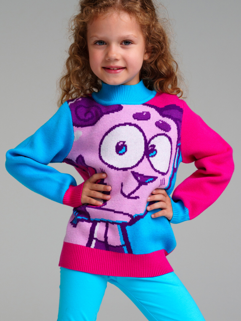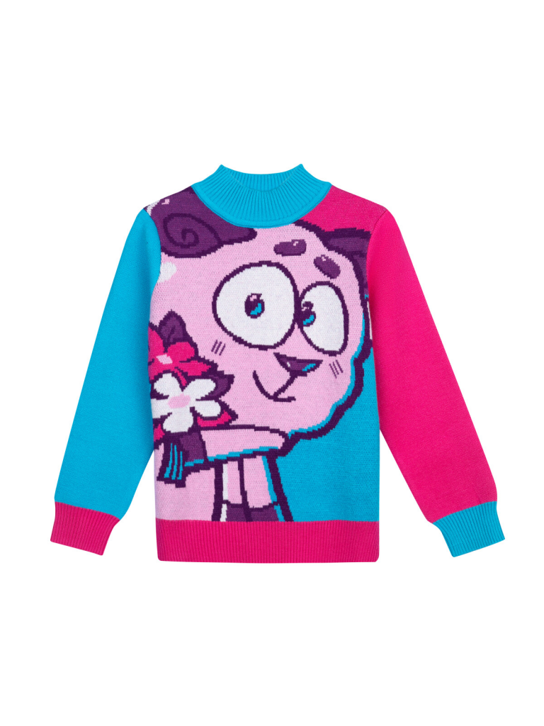 Свитер Смешарики из вязаного трикотажа. Высокое содержание вискозы 50%. Вискоза отличается высокой гигроскопичностью - она впитывает влагу и отлично сохраняет тепло. Воротник-стойка. Горловина, манжеты и низ изделия в рубчик.