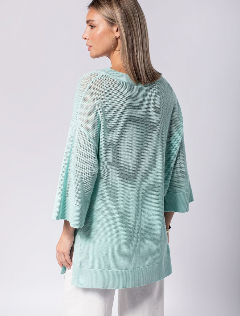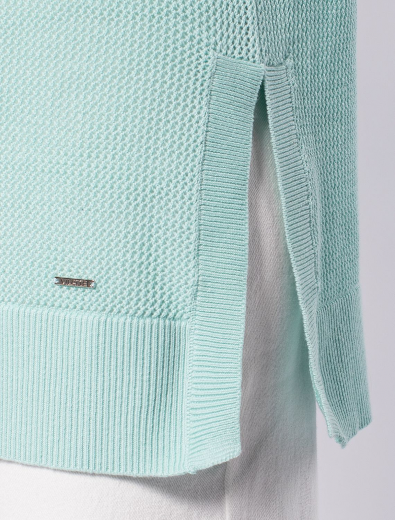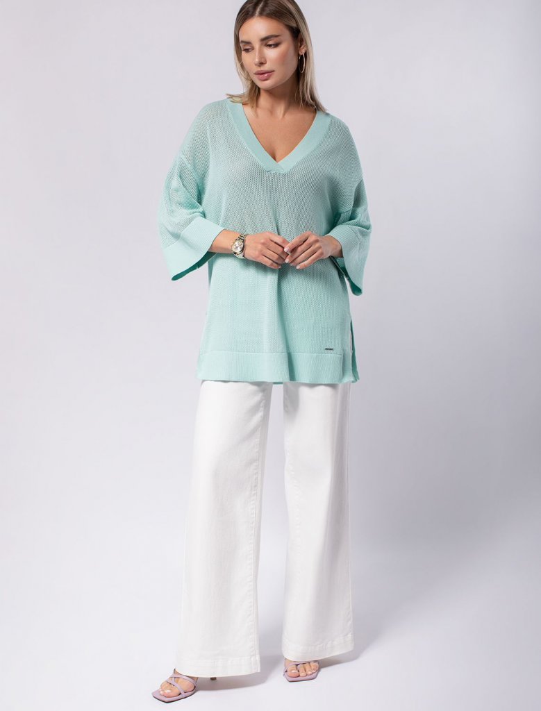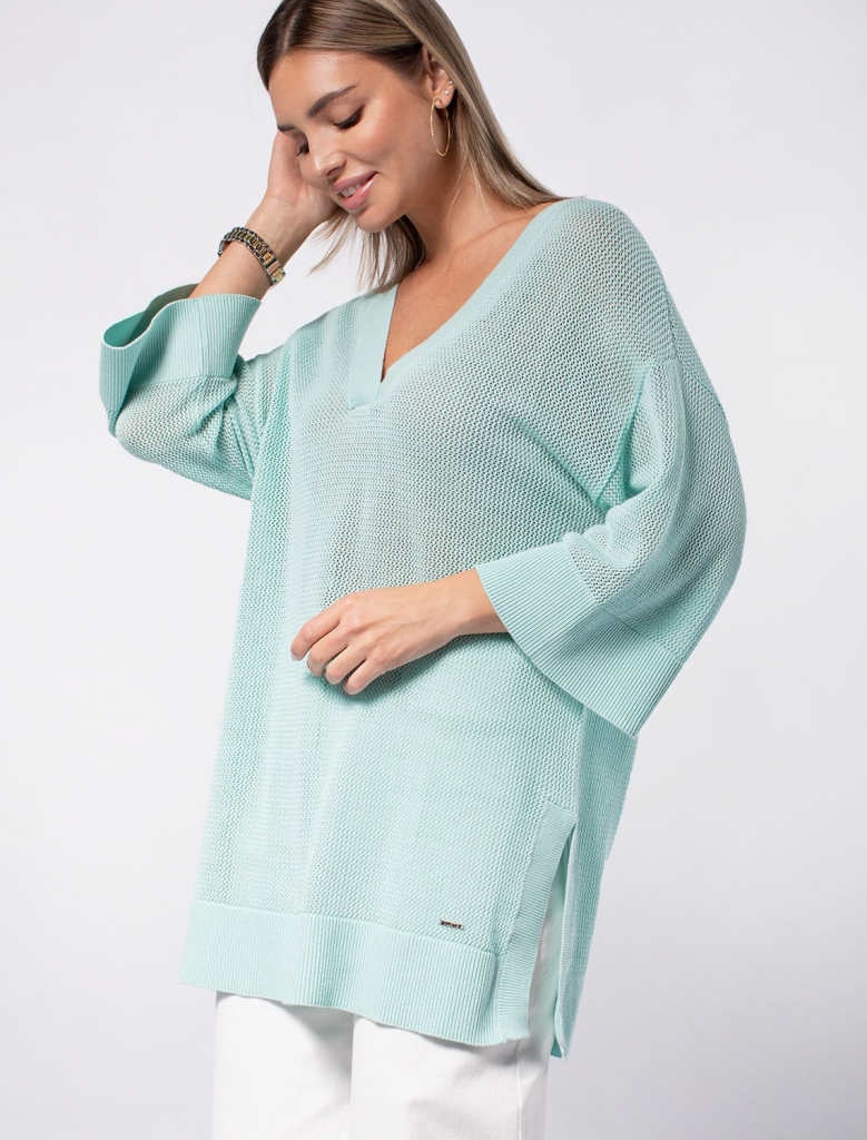 Туника полупрозрачной вязки выполнена из мягкой пряжи на основе хлопка с вискозой. Идеально подойдет в жару, защитит от палящего солнца и при этом не будет перегревать тело. Отлично сочетается с мини-топом или с купальником. В обычной жизни хорошо аккомпанирует с денимом и льном. Изделие дополнено металлическим логотипом бренда.
