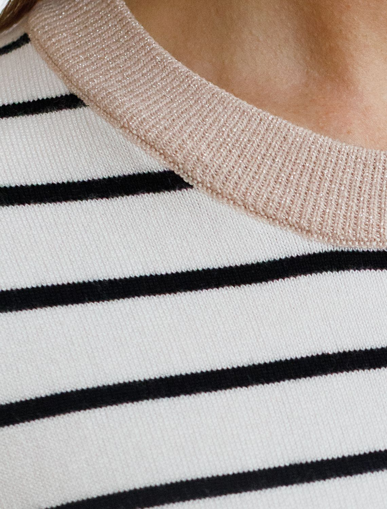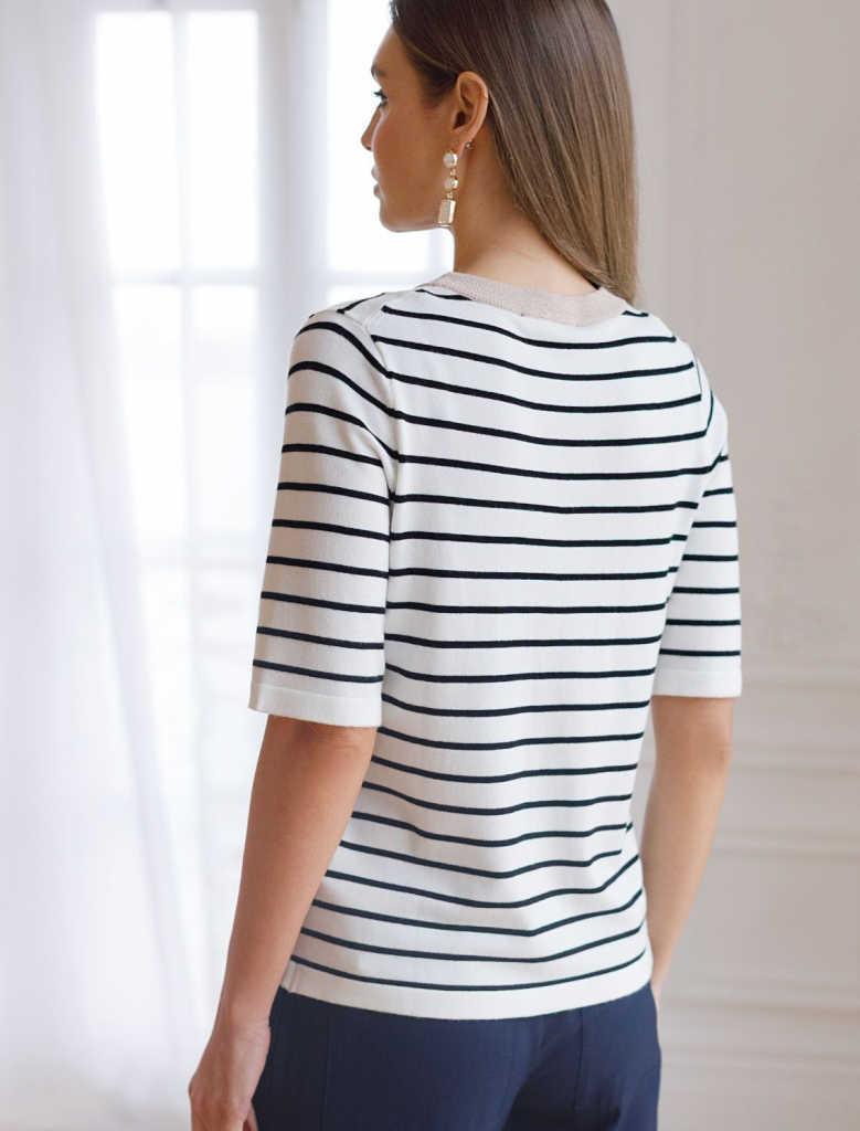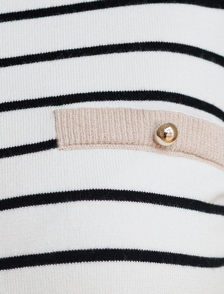 Свободный джемпер белого цвета в контрасную полоску из вискозы – выбор для тех, кто ценит стильный и современный образ. Благодаря средней длине и свободному крою джемпер гармонично смотрится на разных типах фигуры, а так же подходит на большие размеры, подчеркивая достоинства фигуры и скрывает возможные недостатки. Мягкая вискоза обеспечивает приятные ощущения к телу и подходит для ежедневной носки. Круглый ворот аккуратно подчеркивает линию шеи и подходит для разных вариантов укладки волос. Мягкий люрекс на контрастной отделке придает легкое мерцание, делая джемпер подходящим не только для повседневных выходов, но и для особых случаев. Принт выполнен в виде полосок, что делает классический джемпер актуальным в любом сезоне и который легко сочетается с разными стилями одежды. Рукав средней длины обеспечивает удобство и практичность в носке, позволяя использовать джемпер в прохладную погоду или для создания многослойных образов. Этот джемпер станет отличным дополнением гардероба, подчеркивая стиль и создавая легкую атмосферу непринужденности..