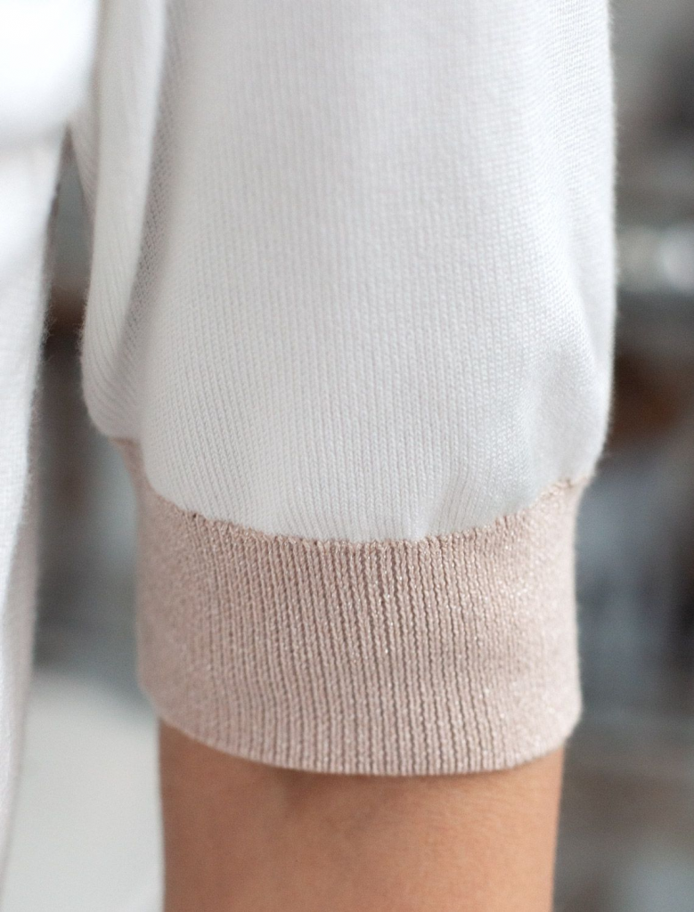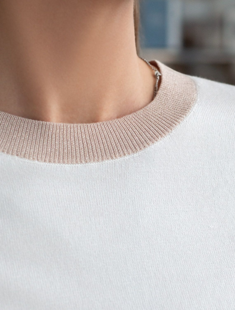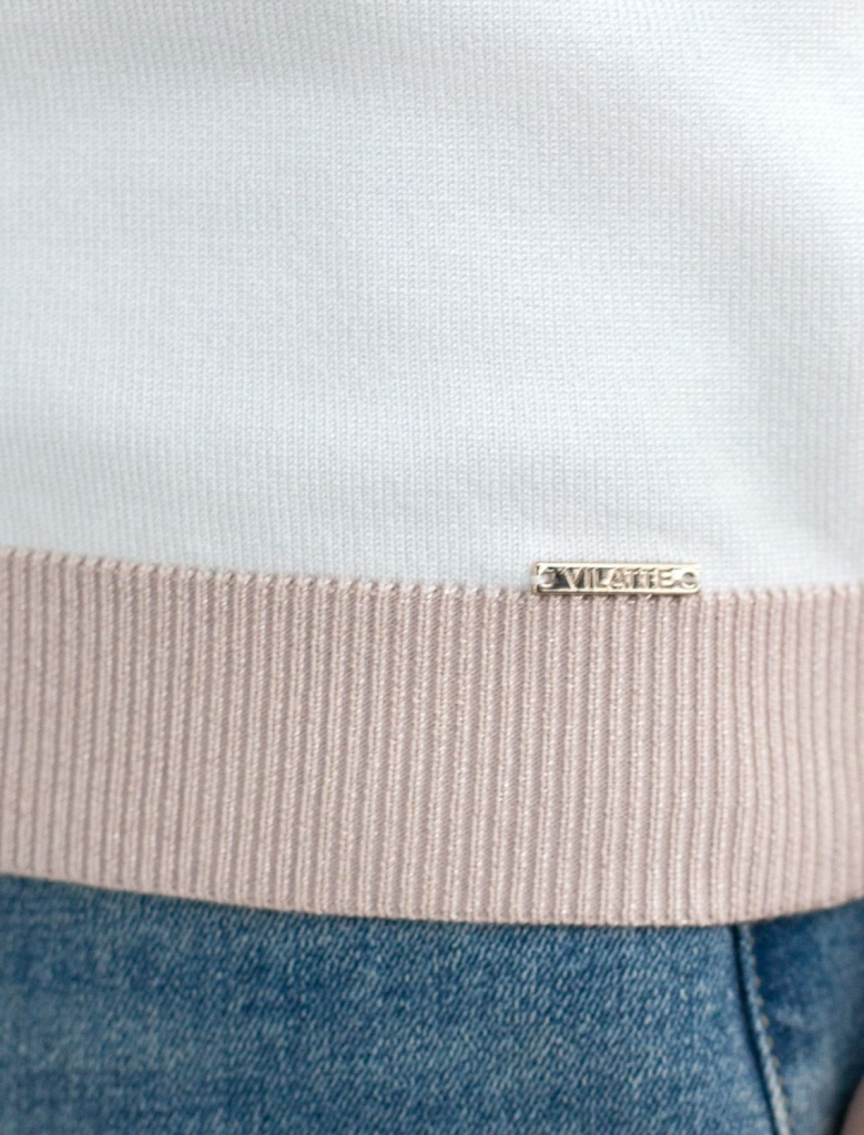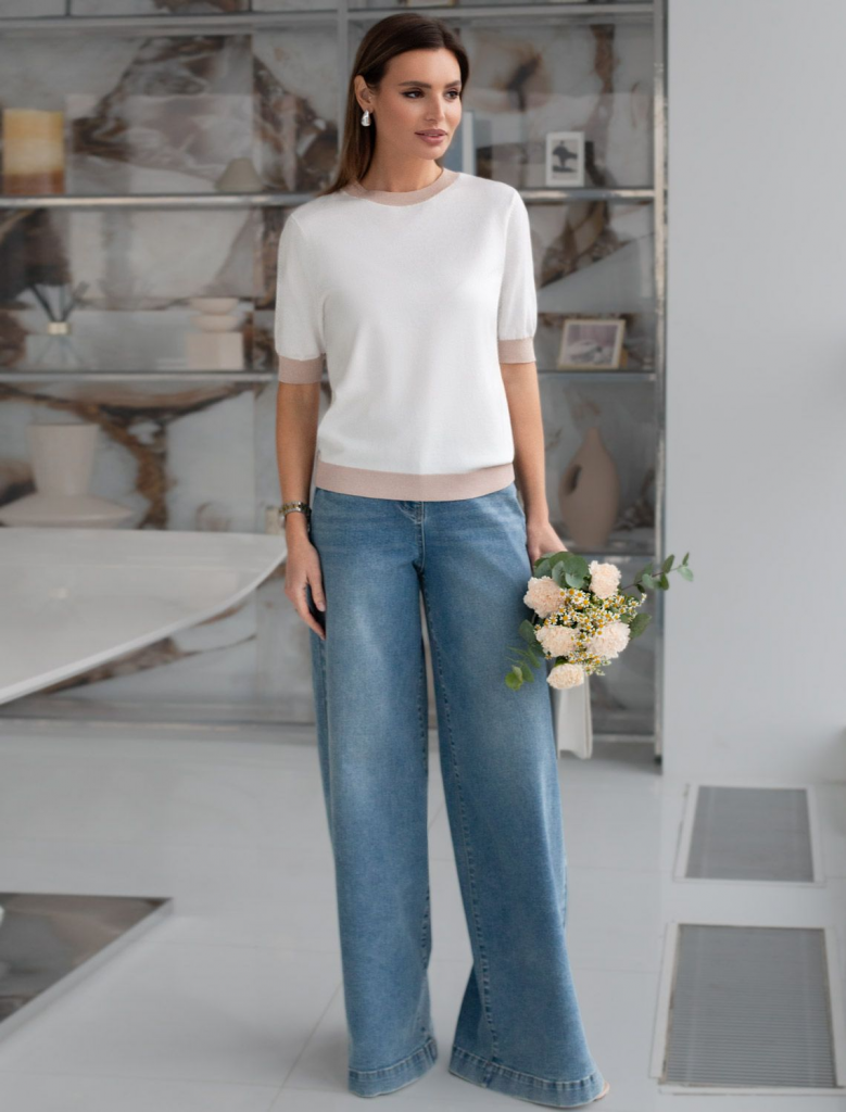Легкий джемпер белого цвета с круглым вырезом идеально подходит на весну и лето. Тонкая вязка из вискозы дарит приятный комфорт и ощущение свежести в теплую погоду. Полуприлегающий крой подчеркивает силуэт, а универсальная длина позволяет сочетать джемпер с разными элементами гардероба. Контрастная отделка с мягким люрексом добавляет стильный акцент, создавая выразительный образ. Деликатное мерцание придает праздничное настроение, но не выглядит слишком ярко или вызывающе. Такой элемент украшения позволяет носить нарядный джемпер и на особых мероприятиях. Джемпер отлично смотрится на больших размерах благодаря продуманному крою и полуприлегающему фасону. Этот джемпер с коротким рукавом станет незаменимой частью гардероба в сезоны, когда хочется легкости и элегантности одновременно. Лаконичный дизайн обеспечивает простоту комбинирования с другими вещами и будет универсальной базой для создания разнообразных комплектов — от офисного до непринужденного городского стиля.
