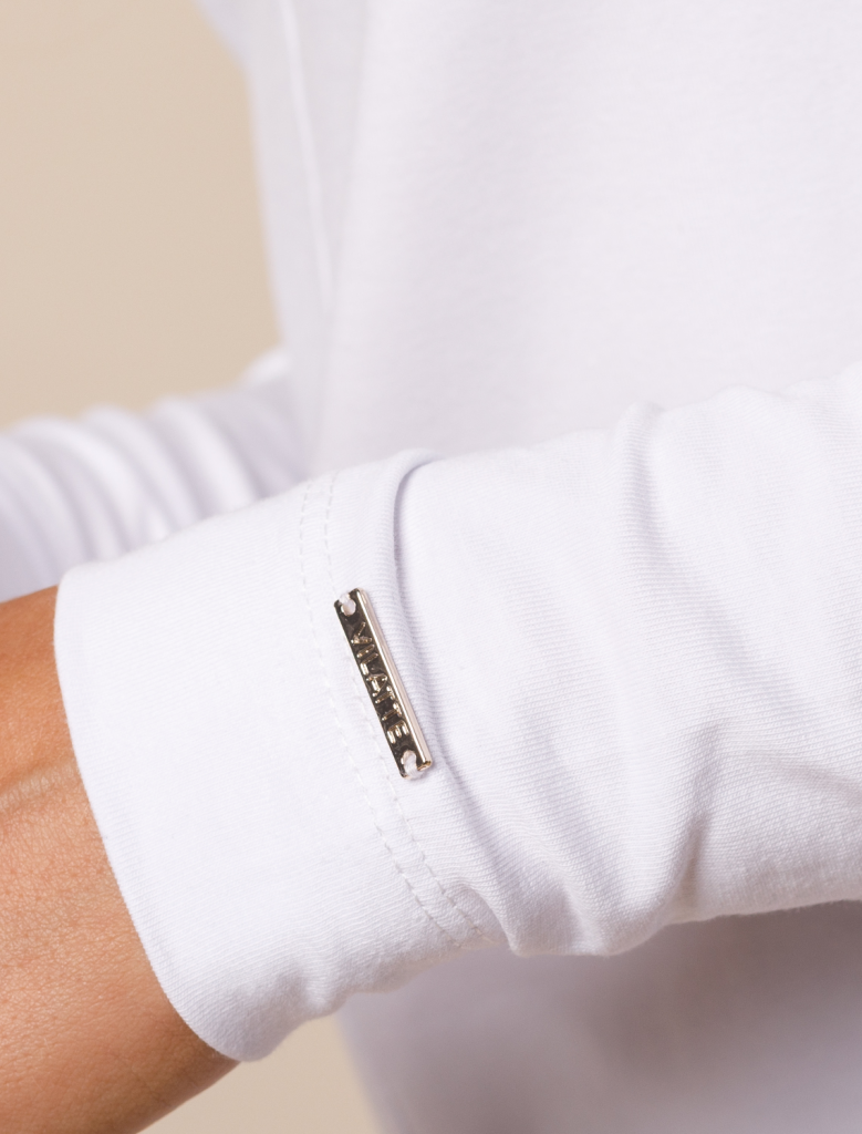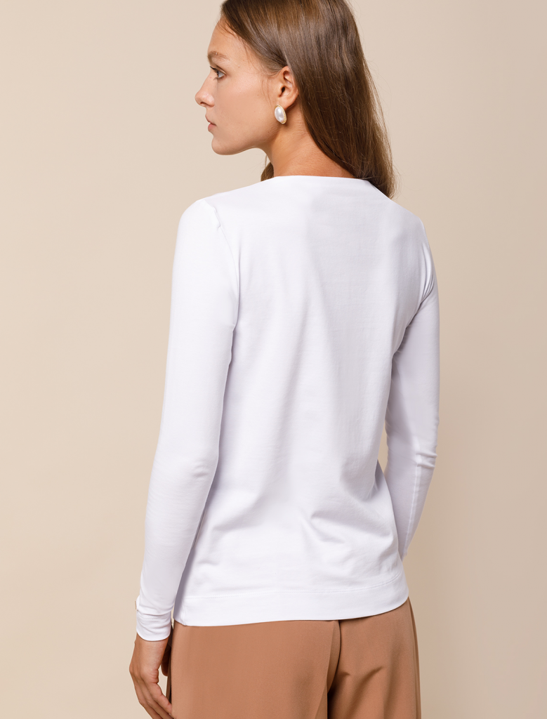 Джемпер прямого силуэта с цельнокроеным воротом выполнен из премиального хлопка. Наличие эластана в составе гарантирует комфорт и формоустойчивостиь изделия. Вертикальный декоративный шов спереди, визуально вытягивает силуэт. Базовая модель хорошо впишется в любой гардероб и подойдет для офисного дресс-кода. На рукаве металлический логотип бренда.