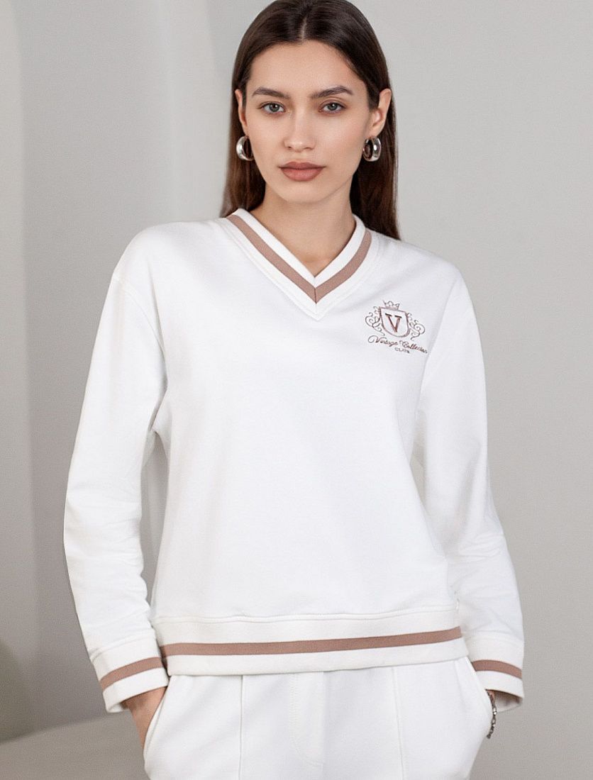Перевод принта: Теннисный клуб. Джемпер умеренного объема с V-вырезом выполнен из эластичного футера двухнитки. Горловина, манжеты и пояс выполнены из эластичного хлопка с контрастной полосой. Изделие дополнено золотистым логотипом бренда. Сочетается в костюме с брюками D44.141, D44.142, шортами D48.009 и юбкой-шортами D46.041