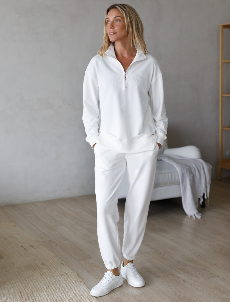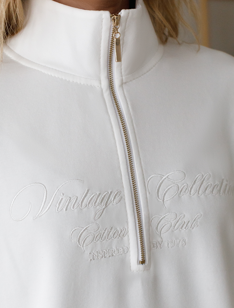 Уютный и комфортный вариант для прохладной погоды – стильный джемпер белого цвета с воротом на молнии. Изготовлен из премиального футера трехнитки с добавлением эластана. Материал сохраняет форму при длительном ношении и после многократных стирок, его мягкая текстура дарит ощущение уюта и тепла. Минималистичная вышивка в тон изделия в виде надписи. еревод надписи: Vinlage collection cotton club - Винтажная коллекция Хлопковый клуб. Свободный крой джемпера позволяет не ограничивать движения, что особенно важно для активного образа жизни. Подойдет на любую женскую фигуру, представлена широкая размерная линейка, большие размеры, легко комбинируется с другими вещами, создавая модные образы в стиле спорт-шик. Этот повседневный джемпер сочетает в себе удобство и актуальность, будет универсальным выбором для отдыха или прогулок.
