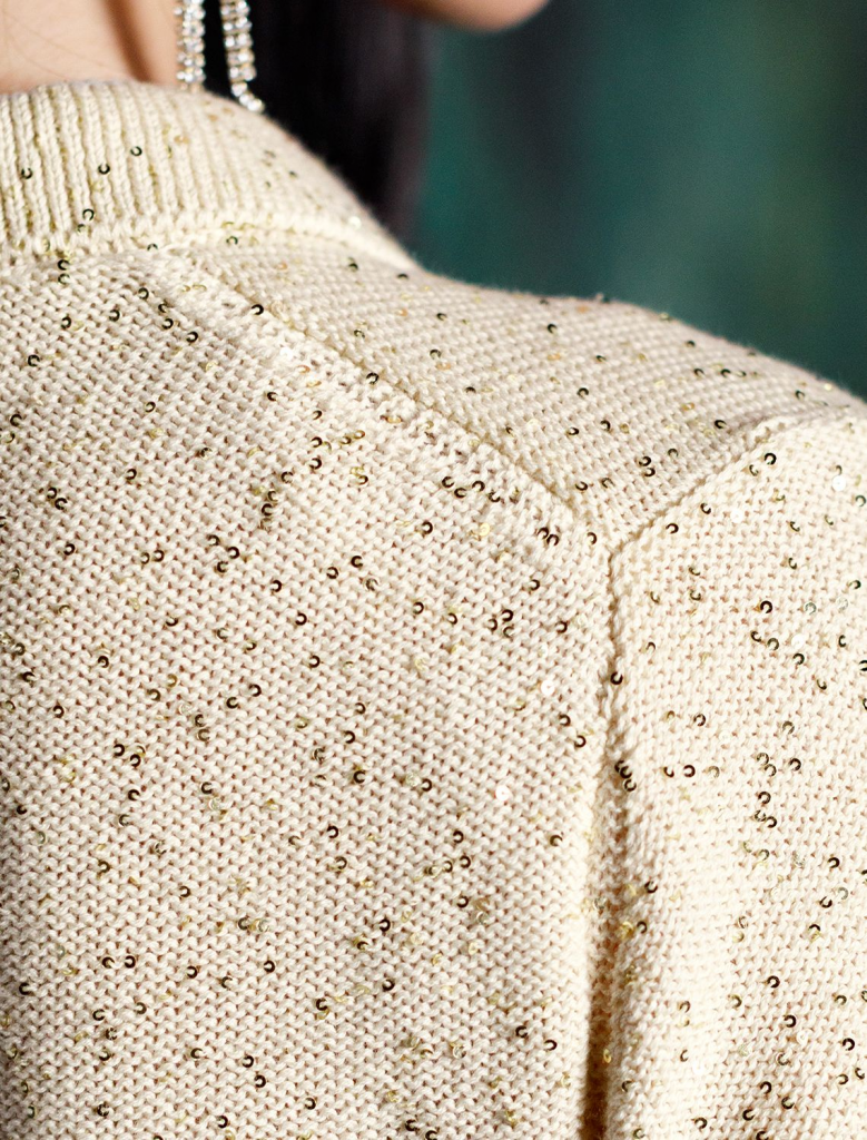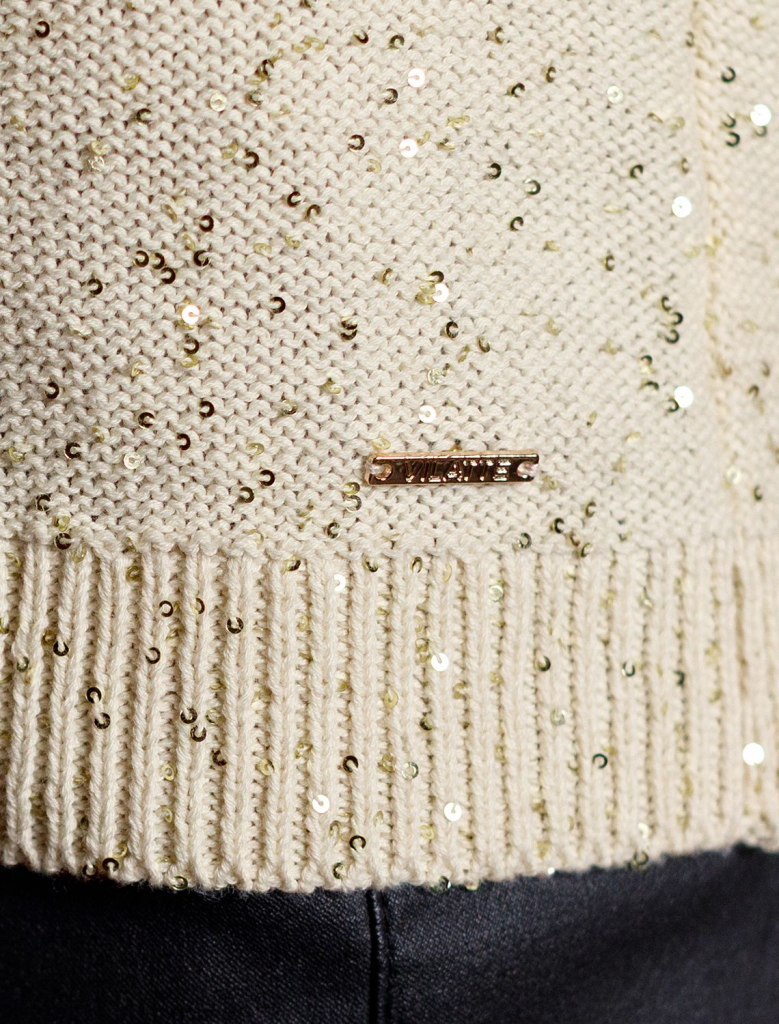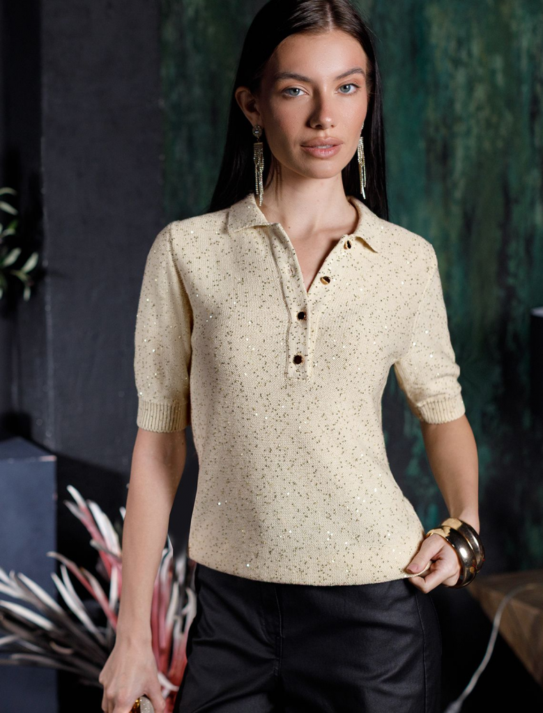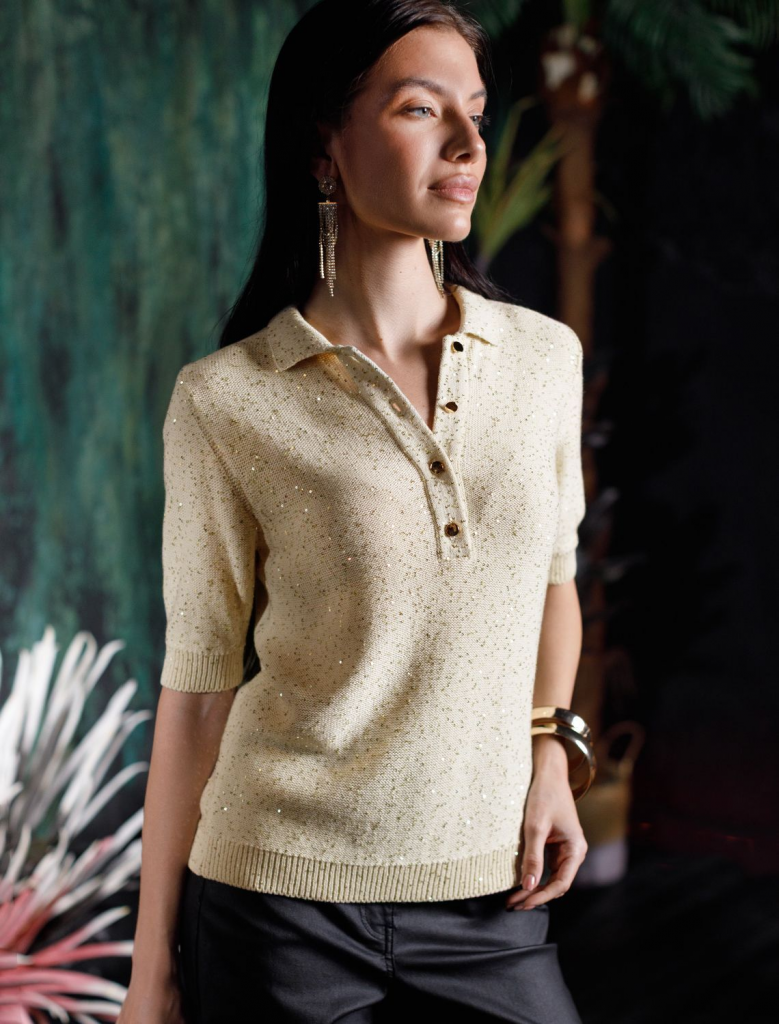 Легкий джемпер поло бежевого цвета с коротким руковом выполнен из хлопковой пряжи с вкраплением сияющих пайеток, что придает особую изысканность. Стильный джемпер связан изнанкой, пряжа отличается легкостью и приятной текстурой, совершенно не колется, обеспечивает комфорт даже при длительном использовании, а натуральные волокна поддерживают оптимальный температурный баланс. Крой полуприлегающий, подчеркивает женственный силуэт, а отложной воротничок с застежкой на золотистые пуговицы и манжеты на рукавах гармонично завершают дизайн, создающий аккуратный образ. Нарядный джемпер подойдет девушкам и женщинам больших размеров, в нем вы будете чувствовать себя уверенно и свободно в любой ситуации. Мерцающий эффект пайеток добавляет образу выразительности и индивудуальности. Сочетайте джемпер в романтическом образе с пышной юбкой, в более строгом с широкими брюками. С этим поло легко создать премиальный лук в стиле old money. Мерцающее полотно добавляет особого шарма вашему образу, делая его уместным как на праз