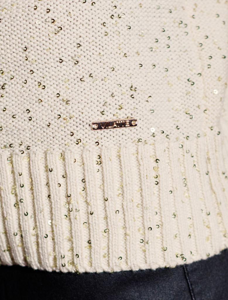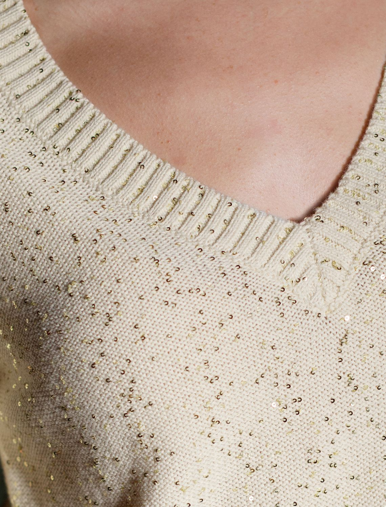 Легкий джемпер бежевого цвета с V вырезом и коротким рукавом выполнен из хлопковой пряжи с вкраплением сияющих пайеток, что придает особую изысканность. Нарядный джемпер связан изнанкой, пряжа отличается легкостью и приятной текстурой, совершенно не колется, обеспечивает комфорт даже при длительном использовании, а натуральные волокна поддерживают оптимальный температурный баланс. Полуприлегающий крой подчеркивает женственный силуэт, а манжеты на рукавах и по низу гармонично завершают дизайн, создающий аккуратный образ. Умеренно открытое декольте вытягивает шею и подчеркивает ее изящество. Стильный джемпер подойдет девушкам и женщинам больших размеров, в нем вы будете чувствовать себя уверенно и свободно в любой ситуации. Мерцающий эффект пайеток добавляет образу выразительности и индивудуальности. Сочетайте джемпер в романтическом образе с пышной юбкой, в более строгом с широкими брюками. Мерцающее полотно добавляет особого шарма вашему образу, делая его уместным как на праздник, так и для повседневного вы