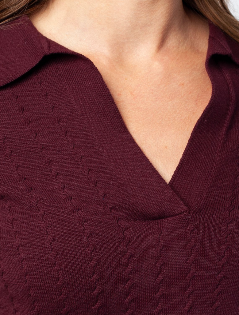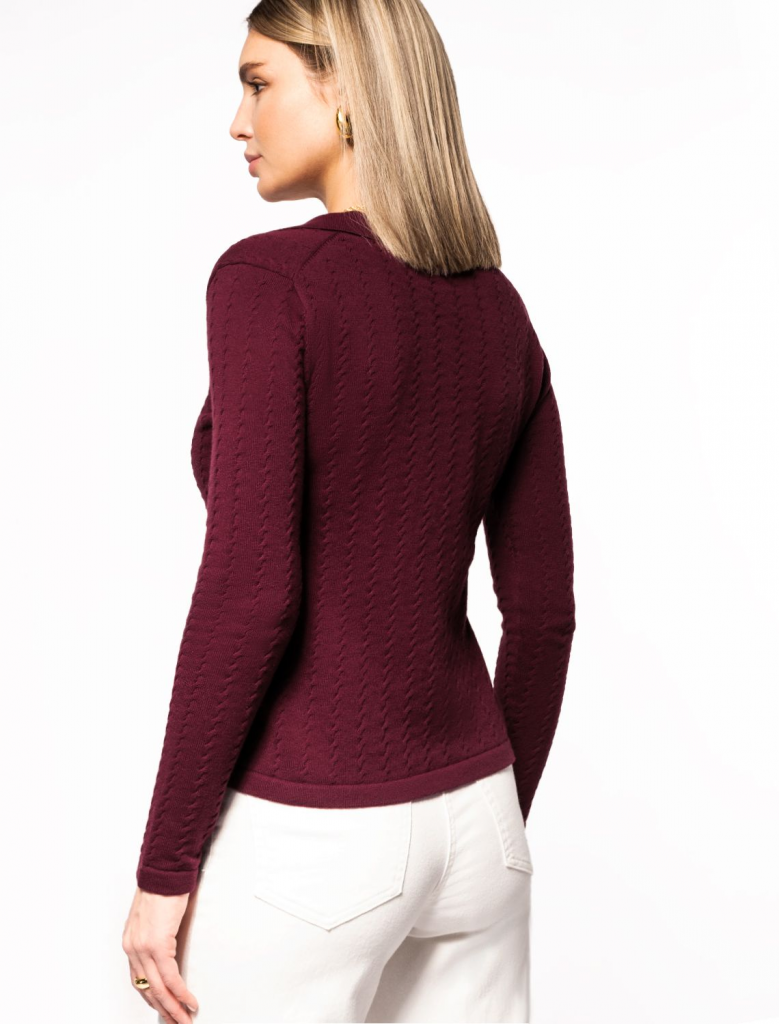 Трикотажный джемпер с воротником поло выполнен из эластичного мягкого хлопка с небольшим ворсом, создающим эффект теплого кашемира. Вертикальный орнамент косичка визуально вытягивает и стройнит силуэт. Джемпер хорошо впишется в базовый гардероб, а белый цвет сделает любой образ роскошным.