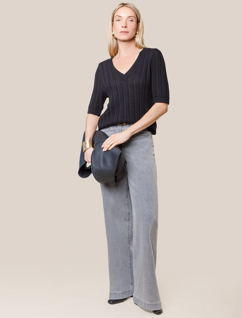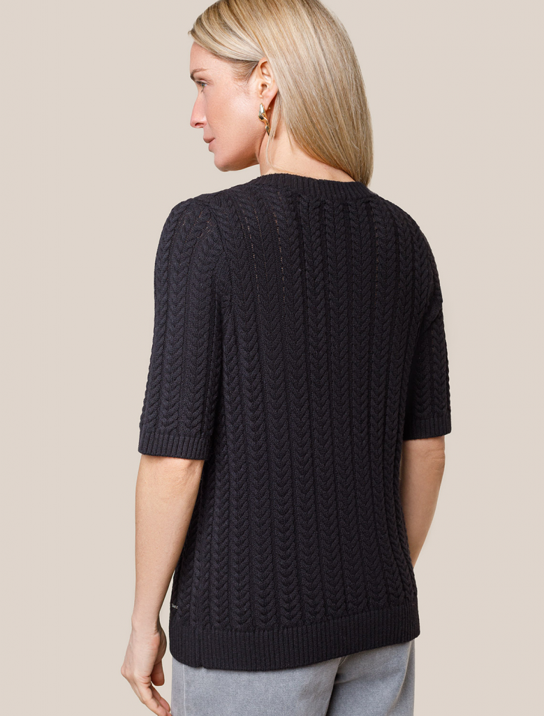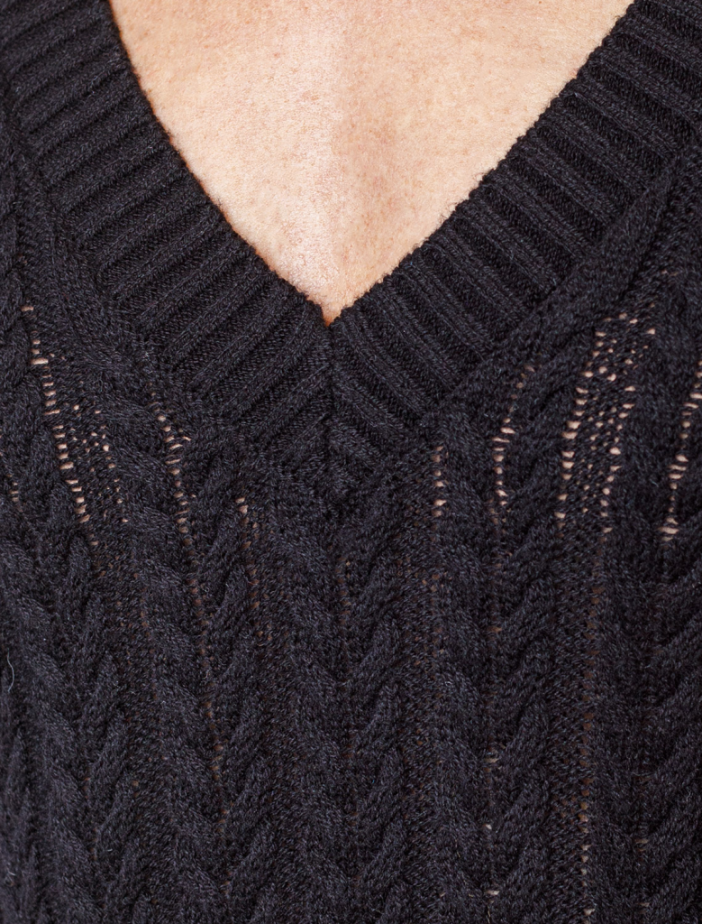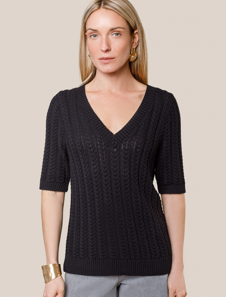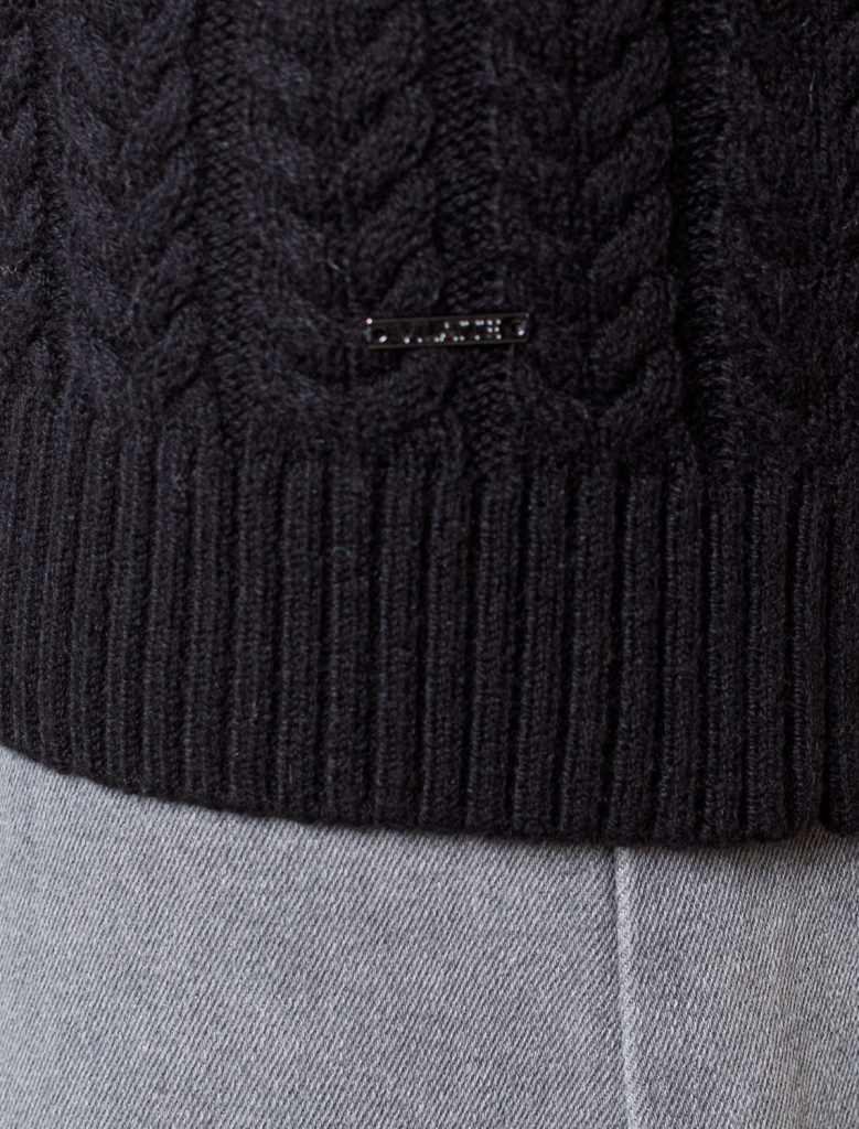 Джемпер фактурной вязки выполнен из хлопка с добавлением кашемира. Модель с V-вырезом с вывязанным орнаментом цепи. Мягкая и очень приятная пряжа совершенно не колется, сохраняет тепло при этом не перегревая, гарантируя безупречный комфорт.