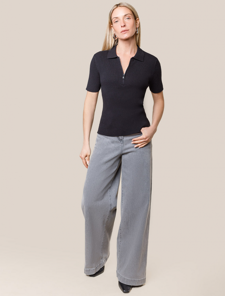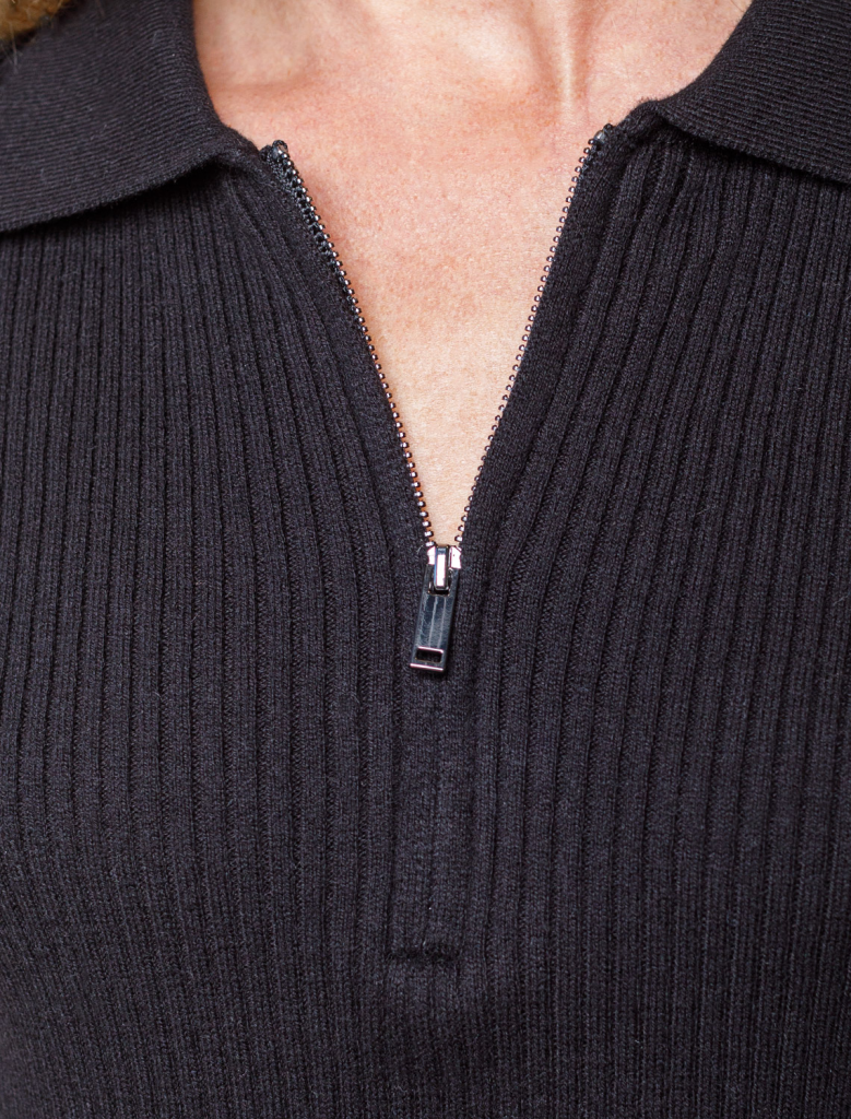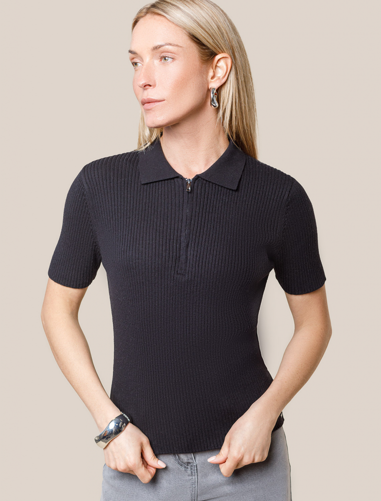 Джемпер-поло тонкой вязки выполнен из хлопка с добавлением кашемира. Модель с воротом как у поло дополнена застежкой на молнию и металлическим логотипом бренда. Мягкая и очень приятная пряжа в рубчик совершенно не колется, сохраняет тепло при этом не перегревая, гарантируя безупречный комфорт.