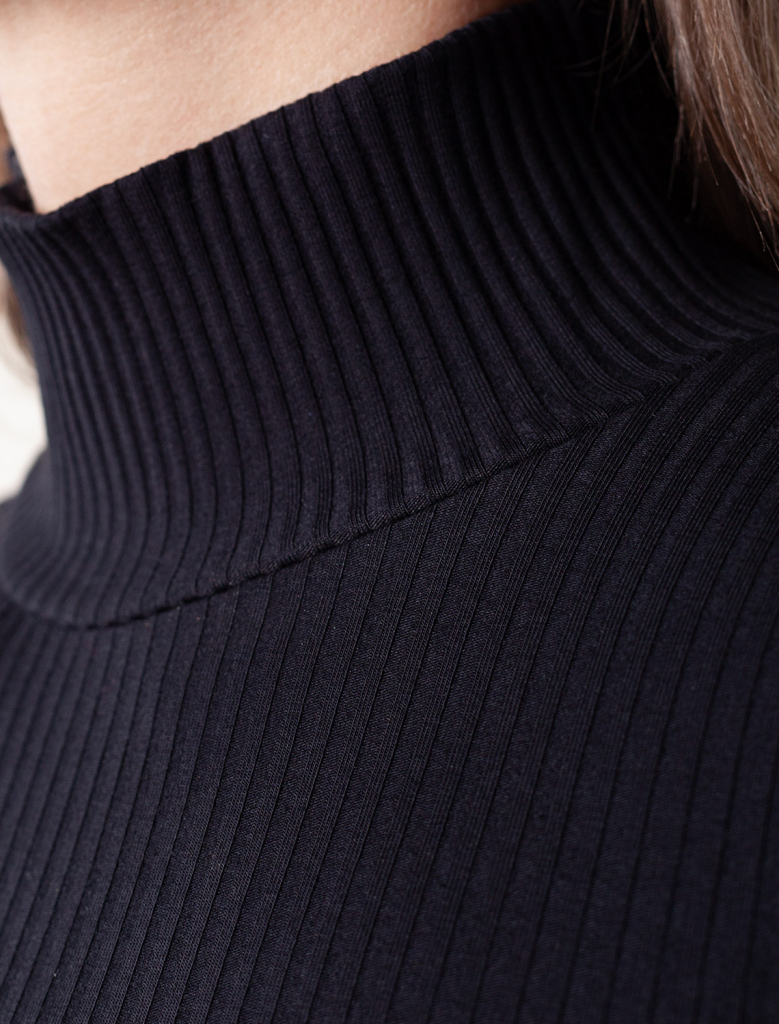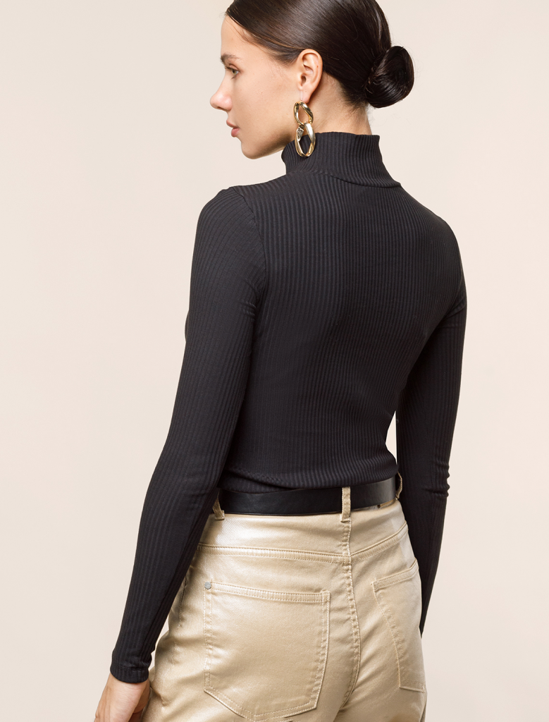 Водолазка выполнена из фактурного трикотажа в широкий рубчик. Модель с узким рукавом хорошо сидит по фигуре, подчеркивая достоинства. Полотно слаборастяжимое, рекомендуем брать изделие четко в соответствии с размером, а кто любит чуть свободнее — то на размер больше. Хлопковый трикотаж поддерживает оптимальную температуру тела, поэтому в изделии будет комфортно в течении всего дня. Наличие эластана в составе гарантирует формоустойчивости. Водолазка отлично впишется в деловой дресс-код и подойдет для повседневного аутфита.