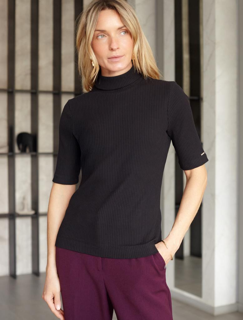 Водолазка с коротким рукавом выполнена из фактурного трикотажа в рубчик. Модель идеально сидит по фигуре не сковывая движения. Хлопковый трикотаж поддерживает оптимальную температуру тела, поэтому в изделии будет комфортно в течении всего дня. Наличие эластана в составе гарантирует формоустойчивости. Водолазка отлично впишется в деловой дресс-код и подойдет для повседневного аутфита.