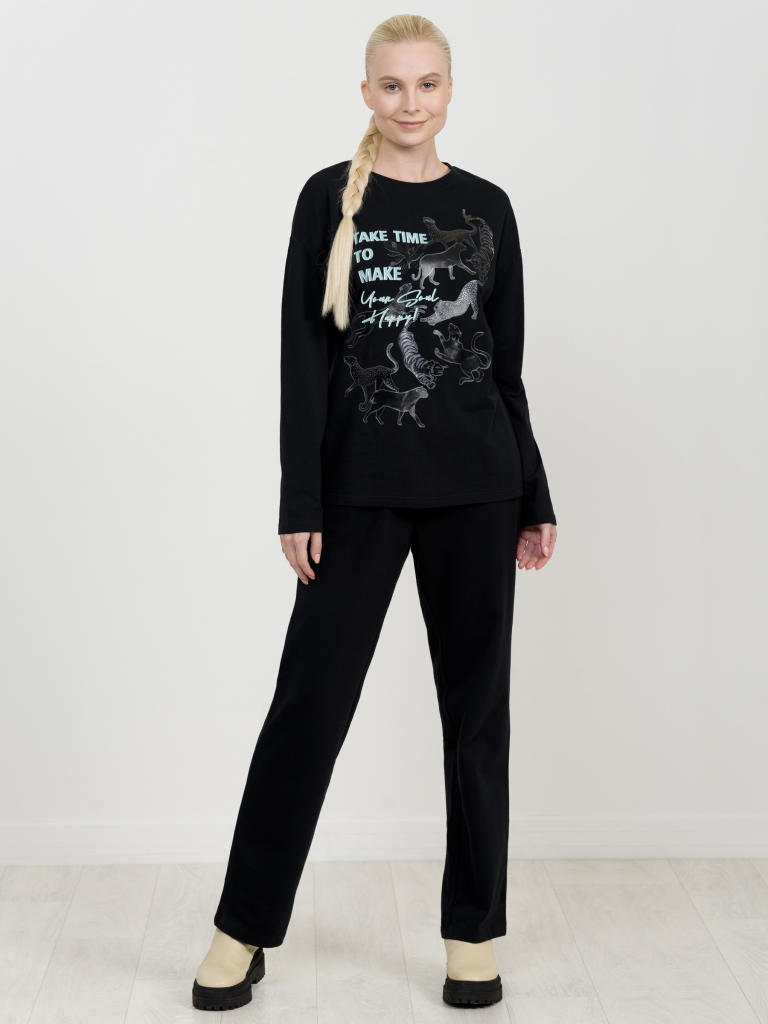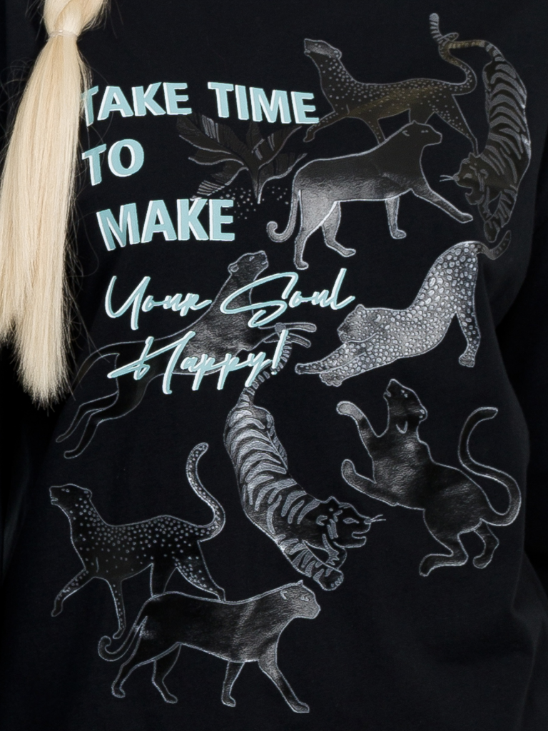 Лонгслив среднего объема. Крупный эластичный glossy принт на полутонах. Перевод Найдите время, чтобы сделать свою душу счастливой.