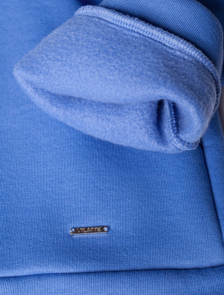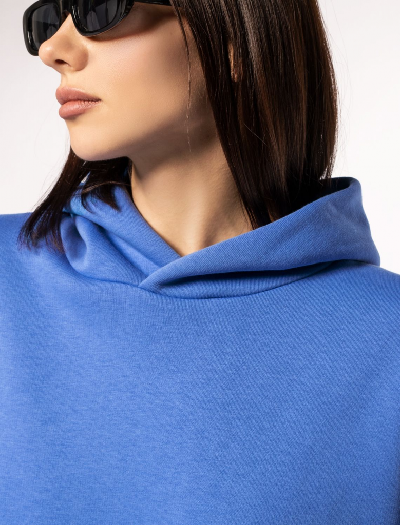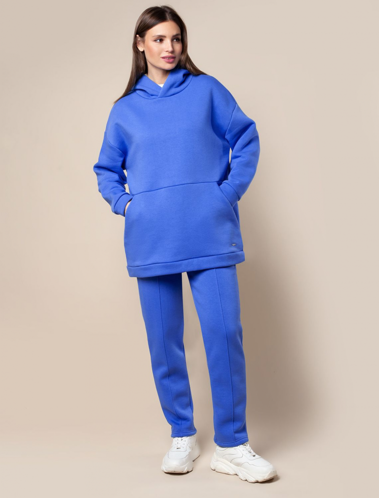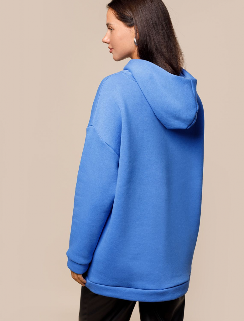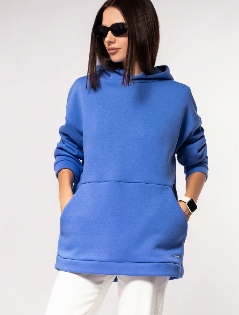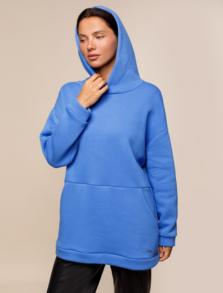 Свободное худи выполнено из футера-трехнитки с начесом. Модель over-size с классическим карманом-кенгуру, украшена металлическим логотипом бренда. Наличие эластана в составе изделия способствует меньшей сминаемости и формоустойчивости. Сочетайте в костюме с брюками D44.124 и D44.129