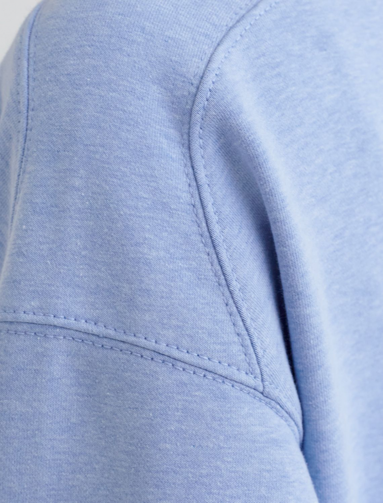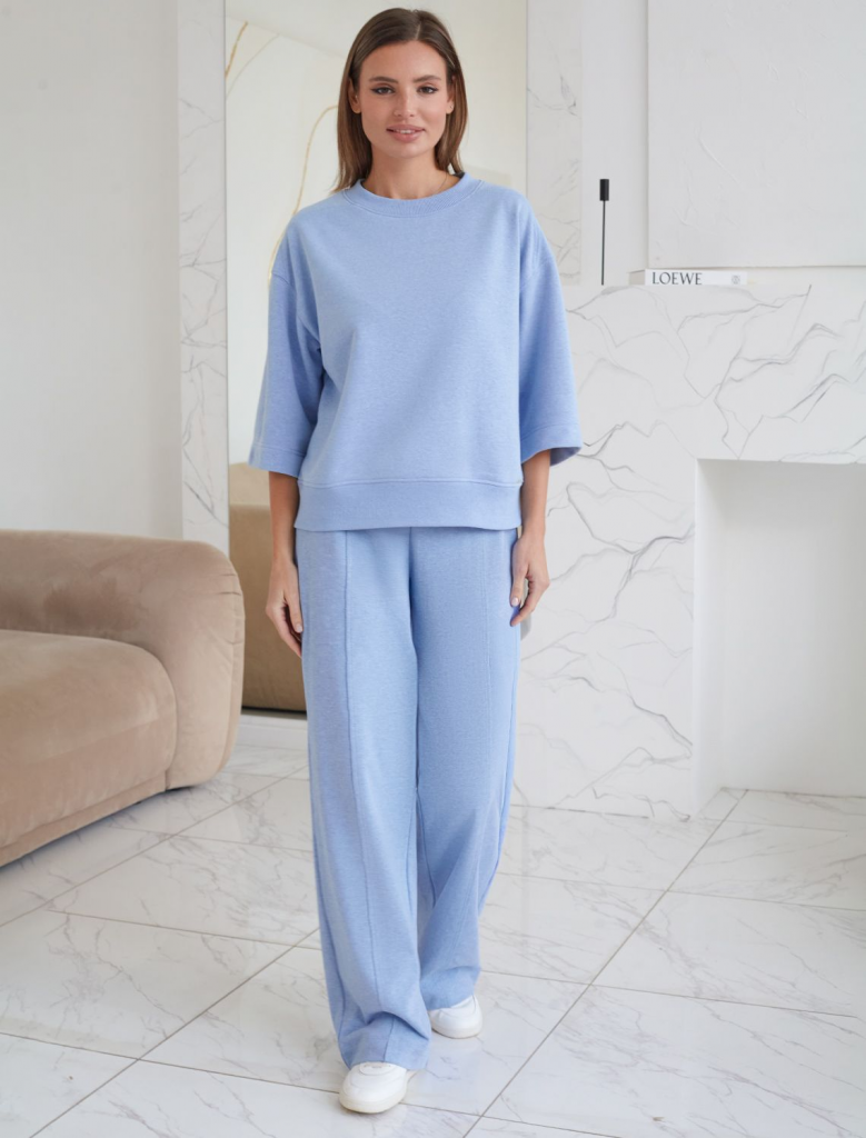 Свободный свитшот голубого цвета с эффектом меланж выполнен из мягкого петельчатого футера двухнитки с добавлением эластана, что обеспечивает комфортную посадку и комфорт. Материал отличается мягкостью и приятной текстурой, позволяя коже дышать и обеспечивая максимальное удобство при носке, а так же хорошей износостойкостью и сохраняет форму даже после многочисленных стирок. Круглый ворот и широкие рукава средней длины придают свитшоту стильный и современный вид и делают образ расслабленным и непринужденным, такой вариант отлично сядет на большие размеры, подчеркивая достоинства фигуры. .Джемпер идеально подходит для повседневной носки и отлично подойдет тем, кто ценит удобство и свободу движений без компромиссов по стилю. Этот свитшот станет отличным выбором в прохладную погоду в комплекте с бомбером D49,141 или уютным дополнением к домашнему образу в комплекте с брюками D44.157