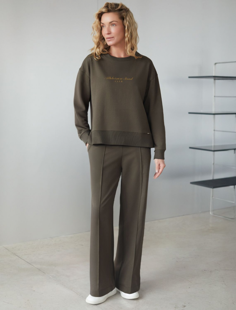 Стильный свитшот цвета хаки из премиального футера двухнитки с эластаном сочетает в себе комфорт и оригинальность. Джемпер выполнен из натурального хлопка, который обеспечивает мягкость и дышащие свойства ткани. Нежный материал дарит ощущение уюта в любое время года, а премиальное качество изготовления гарантирует долговечность и сохранение формы после множества стирок. Особенность изделия — спущенная линия плеча и аккуратные разрезы, которые добавляют современный акцент и делают образ более выразительным. Принт в виде надписи придает индивидуальность, позволяя выделиться без лишней вычурности. Перевод надписи Athleisure mood club - Клуб спортивного настроения. Дополнен металлическим логотипом бренда. Представлена широкая размерная линейка, включая маленькие и большие размеры, что позволяет подобрать идеальный вариант для разной фигуры и роста. Этот уютный свитшот отлично подходит для повседневной носки благодаря своей комфортной посадке и мягкой текстуре. Он станет универсальным элементом гардероба, легко сочетающимся с различными стилями одежды. Свободный джемпер из футера станет отличным выбором для активного отдыха, обеспечивая стильный внешний вид и удобство весной, летом или в прохладную погоду.Рекомендуем сочетать с артикулами: D44.135, D44.166
