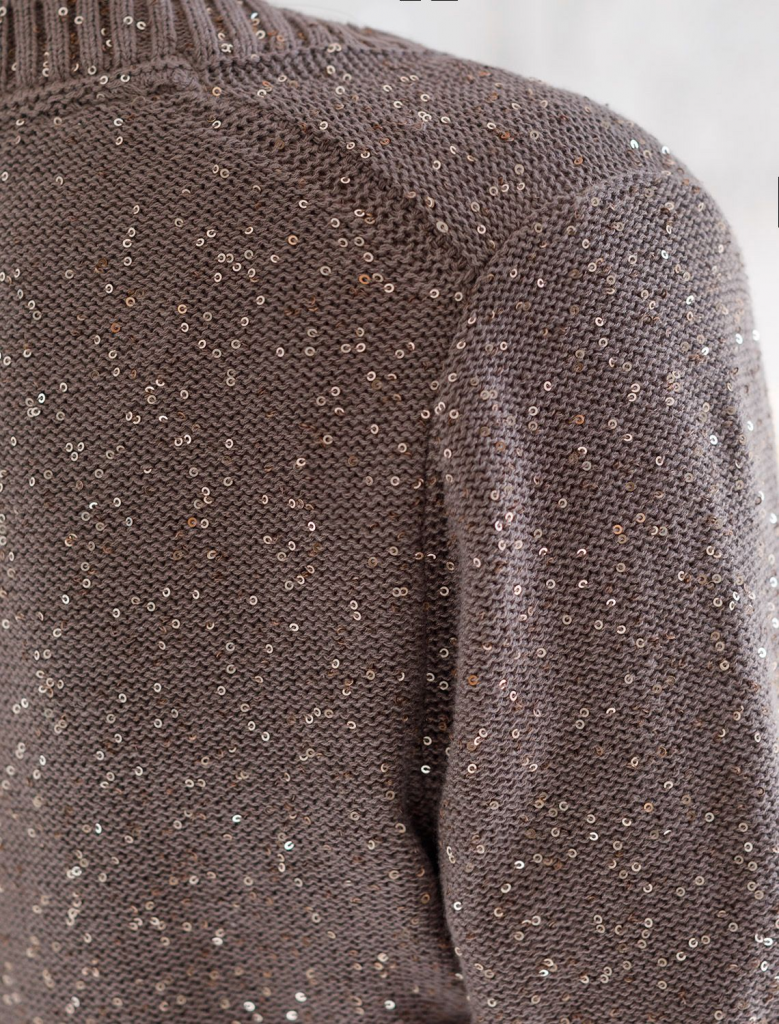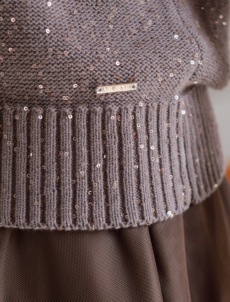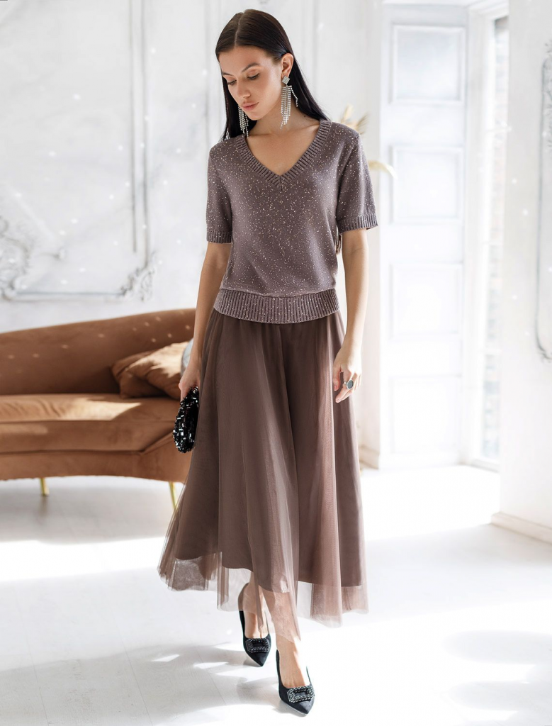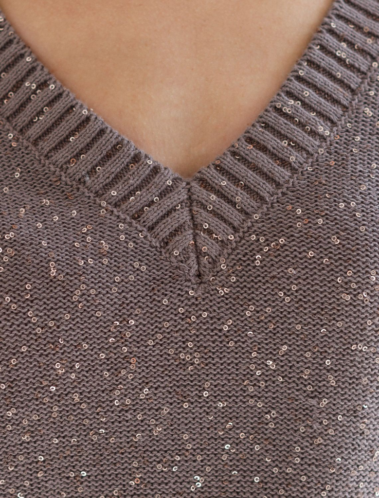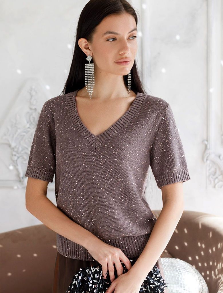 Легкий джемпер кофейного цвета с V вырезом и коротким рукавом выполнен из хлопковой пряжи с вкраплением сияющих пайеток, что придает особую изысканность. Нарядный джемпер связан изнанкой, пряжа отличается легкостью и приятной текстурой, совершенно не колется, обеспечивает комфорт даже при длительном использовании, а натуральные волокна поддерживают оптимальный температурный баланс. Полуприлегающий крой подчеркивает женственный силуэт, а манжеты на рукавах и по низу гармонично завершают дизайн, создающий аккуратный образ. Умеренно открытое декольте вытягивает шею и подчеркивает ее изящество. Стильный джемпер подойдет девушкам и женщинам больших размеров, в нем вы будете чувствовать себя уверенно и свободно в любой ситуации. Мерцающий эффект пайеток добавляет образу выразительности и индивудуальности. Сочетайте джемпер в романтическом образе с пышной юбкой, в более строгом с широкими брюками. Мерцающее полотно добавляет особого шарма вашему образу, делая его уместным как на праздник, так и для повседневного в