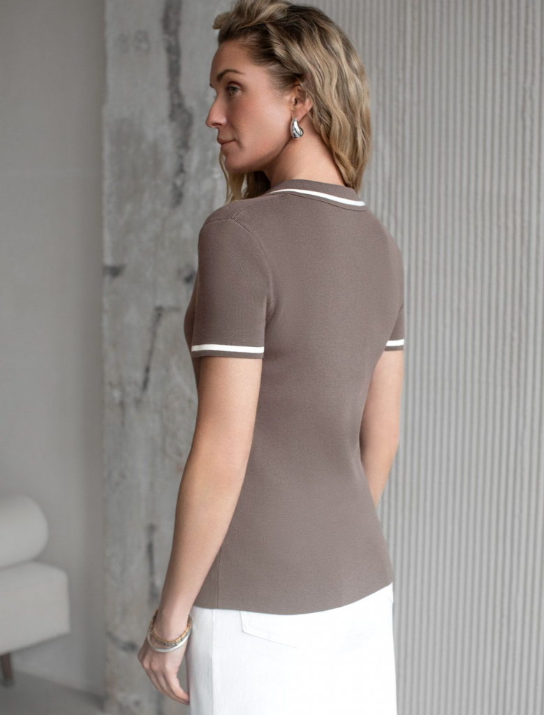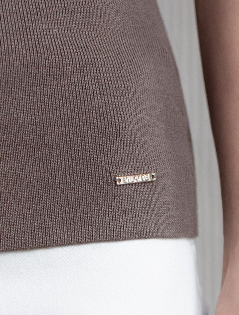 Легкий джемпер кофейного цвета с V-вырезом и отложным воротником идеально подходит на весну и лето. Вязка в тонкий рубчик из вискозы дарит приятный комфорт и ощущение свежести в теплую погоду. Полуприлегающий крой подчеркивает силуэт, а универсальная длина позволяет сочетать джемпер с разными элементами гардероба. Контрастная отделка в виде тонких полосок добавляет стильный акцент, создавая выразительный образ. V-вырез подчеркивает зону декольте и визуально вытягивает шею, делая фигуру более изящной, а классический отложной воротник делает внешний вид более аккуратным и завершенным. Джемпер отлично смотрится на больших размерах благодаря продуманному крою и полуприлегающему фасону. Этот джемпер с коротким рукавом станет незаменимой частью гардероба в сезоны, когда хочется легкости и элегантности одновременно. Лаконичный дизайн обеспечивает простоту комбинирования с другими вещами и будет универсальной базой для создания разнообразных комплектов — от офисного до непринужденного городского стиля.
