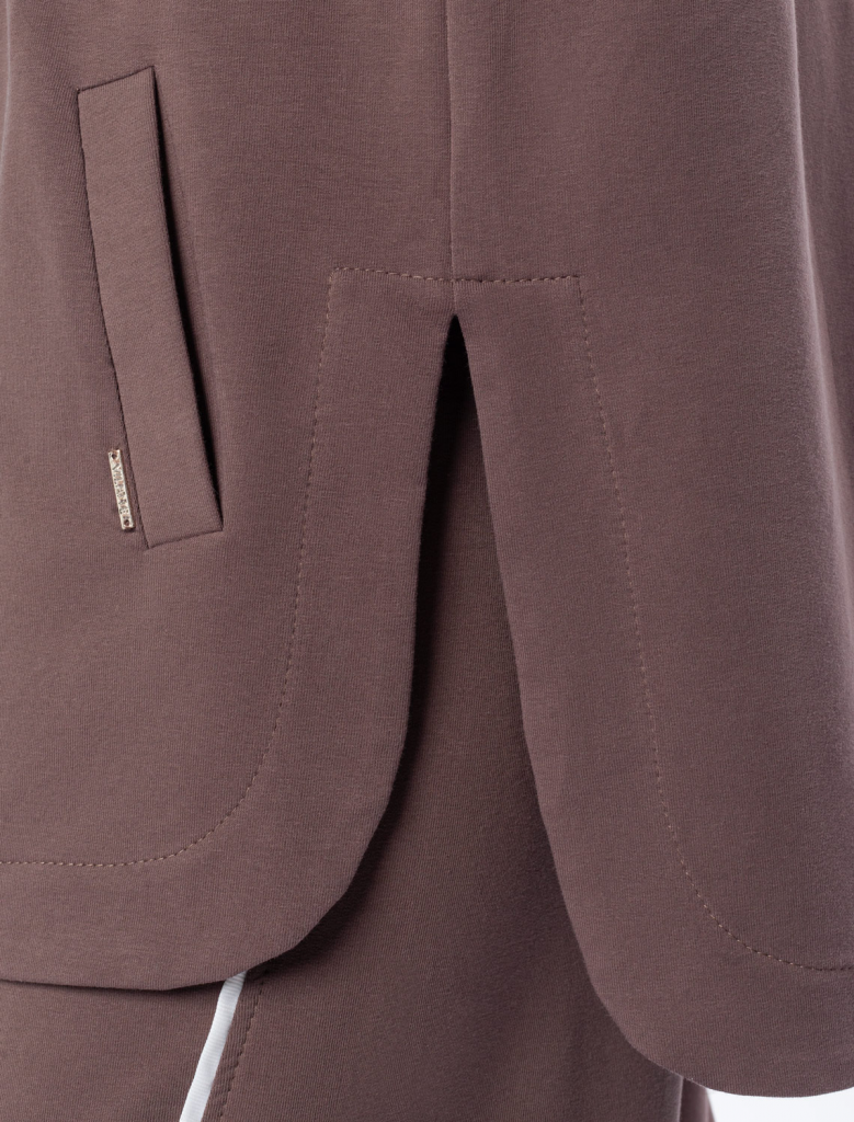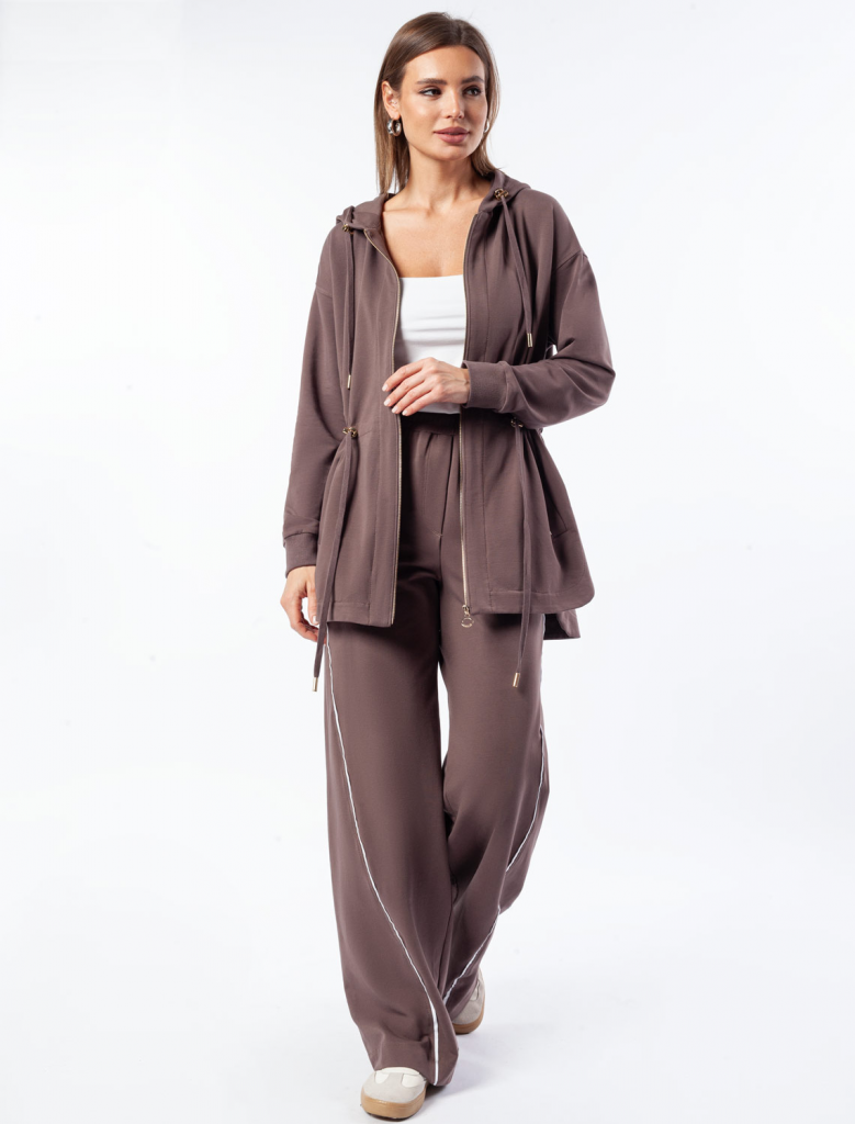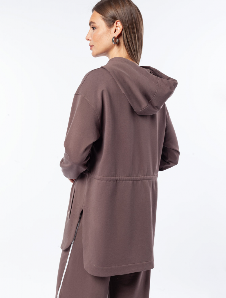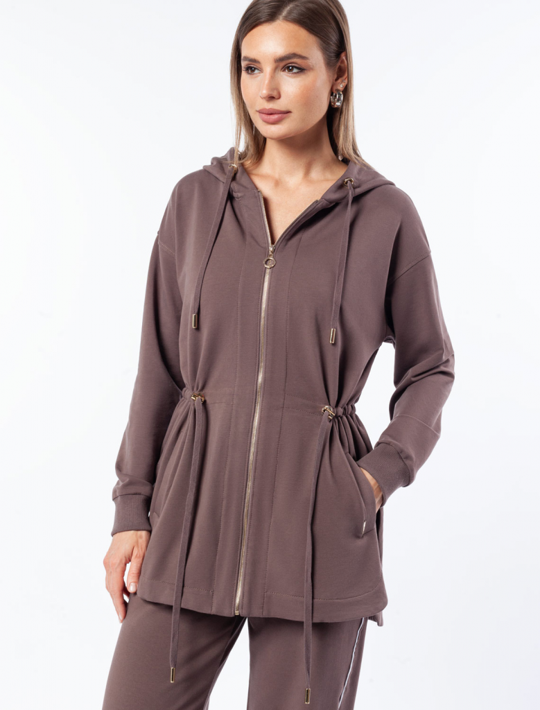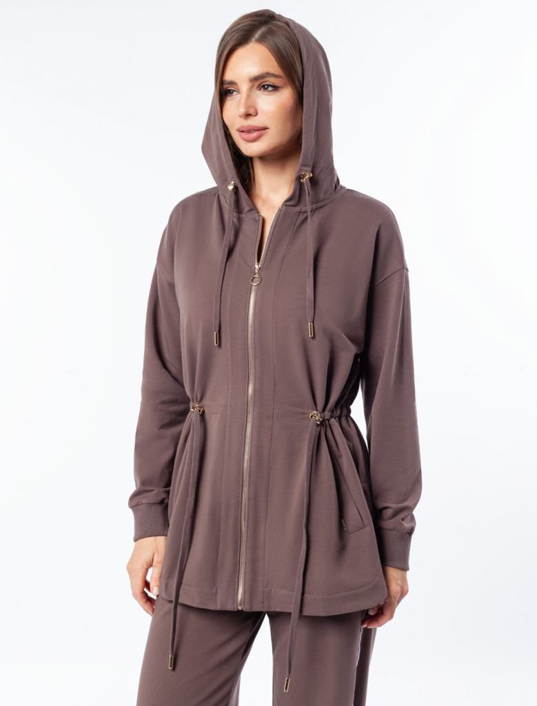 Парка выполнена из эластичного футера двухнитки. Модель дополнена золотистой фурнитурой высокого качества с логотипом бренда. Как у классической модели, изделие с капюшоном, боковыми карманами и регулируемым поясом на хлопковом шнурке. Сочетается в костюме с брюками D44.136, D44.137 и юбкой D46.034