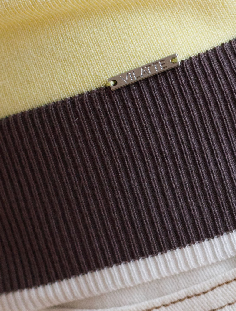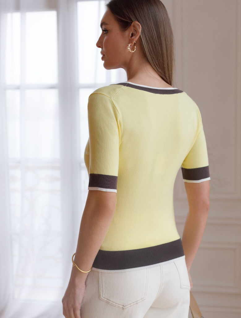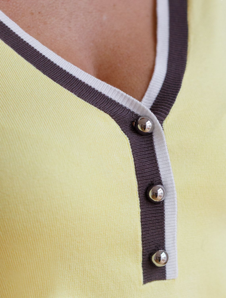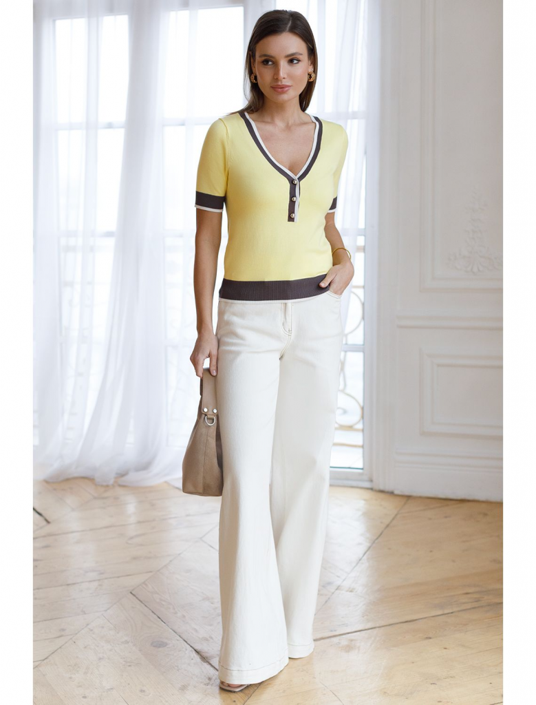 Легкий джемпер лимонного цвета с V-вырезом идеально подходит на весну и лето. Тонкая вязка из вискозы дарит приятный комфорт и ощущение свежести в теплую погоду. Полуприлегающий крой подчеркивает силуэт, а универсальная длина позволяет сочетать джемпер с разными элементами гардероба. V-вырез с пуговицами подчеркивает зону декольте и визуально вытягивает шею, делая фигуру более изящной. Контрастная отделка добавляет стильный акцент, создавая выразительный образ. Джемпер отлично смотрится на больших размерах благодаря продуманному крою и полуприлегающему фасону. Этот джемпер с коротким рукавом станет незаменимой частью гардероба в сезоны, когда хочется легкости и элегантности одновременно. Лаконичный дизайн обеспечивает простоту комбинирования с другими вещами и будет универсальной базой для создания разнообразных комплектов — от офисного до непринужденного городского стиля.