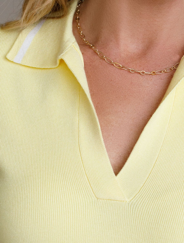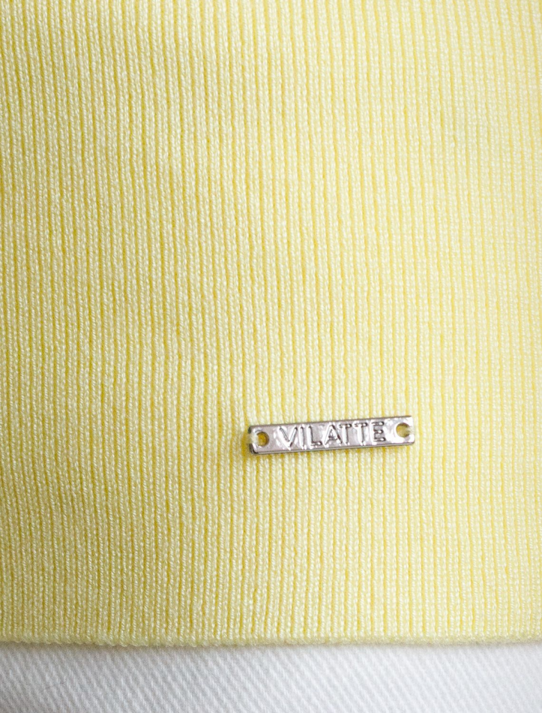Легкий джемпер лимонного цвета с V-вырезом и отложным воротником идеально подходит на весну и лето. Вязка в тонкий рубчик из вискозы дарит приятный комфорт и ощущение свежести в теплую погоду. Полуприлегающий крой подчеркивает силуэт, а универсальная длина позволяет сочетать джемпер с разными элементами гардероба. Контрастная отделка в виде тонких полосок добавляет стильный акцент, создавая выразительный образ. V-вырез подчеркивает зону декольте и визуально вытягивает шею, делая фигуру более изящной, а классический отложной воротник делает внешний вид более аккуратным и завершенным. Джемпер отлично смотрится на больших размерах благодаря продуманному крою и полуприлегающему фасону. Этот джемпер с коротким рукавом станет незаменимой частью гардероба в сезоны, когда хочется легкости и элегантности одновременно. Лаконичный дизайн обеспечивает простоту комбинирования с другими вещами и будет универсальной базой для создания разнообразных комплектов — от офисного до непринужденного городского стиля.