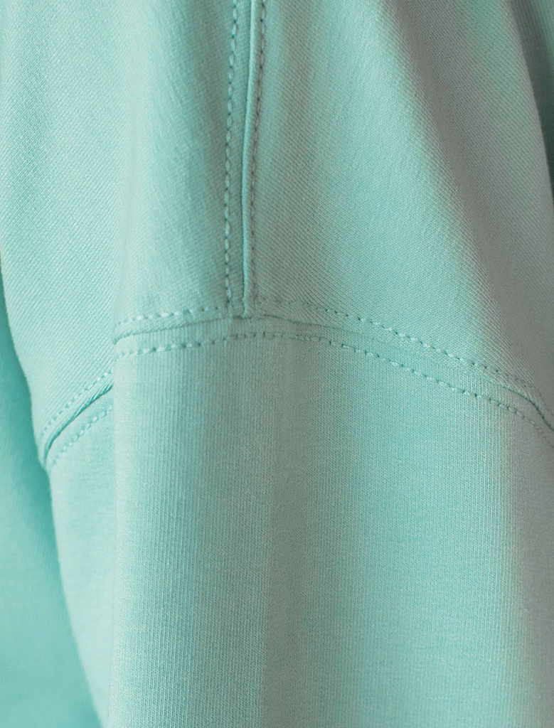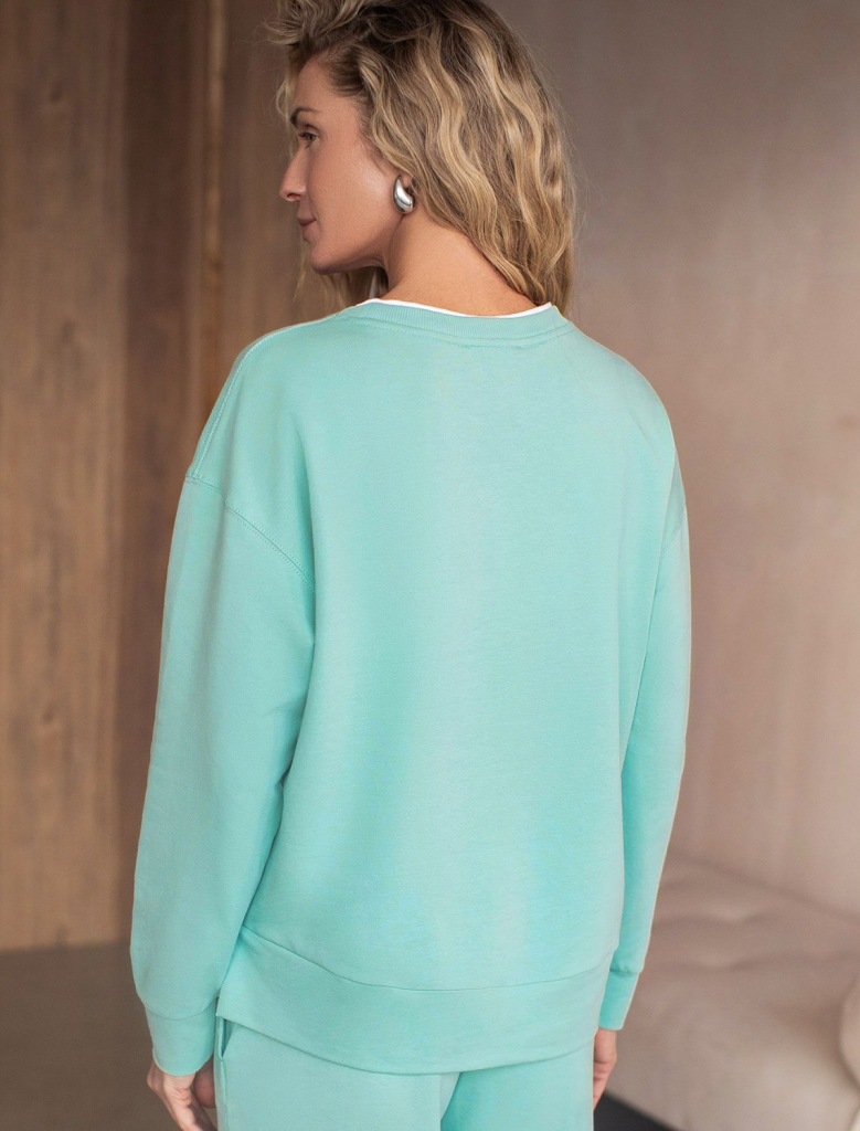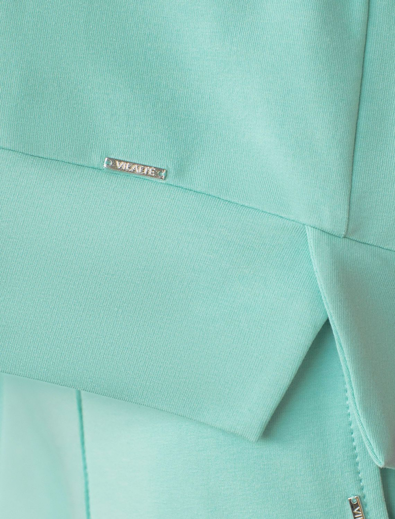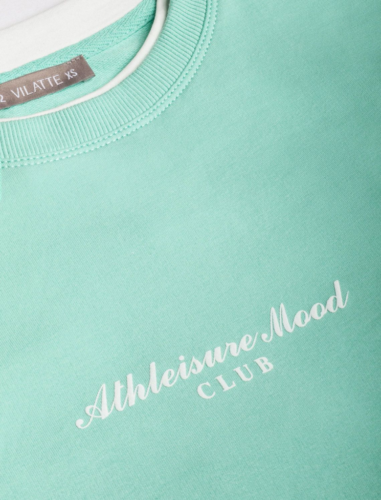 Стильный свитшот мятного цвета из премиального футера двухнитки с эластаном сочетает в себе комфорт и оригинальность. Джемпер выполнен из натурального хлопка, который обеспечивает мягкость и дышащие свойства ткани. Нежный материал дарит ощущение уюта в любое время года, а премиальное качество изготовления гарантирует долговечность и сохранение формы после множества стирок. Особенность изделия — спущенная линия плеча и аккуратные разрезы, которые добавляют современный акцент и делают образ более выразительным. Эффект имитации футболки в виде белой отделки на вороте делает дизайн динамичным и повышает градус стиля. Принт в виде надписи придает индивидуальность, позволяя выделиться без лишней вычурности. Перевод надписи Athleisure mood club - Клуб спортивного настроения. Дополнен металлическим логотипом бренда. Представлена широкая размерная линейка, включая маленькие и большие размеры, что позволяет подобрать идеальный вариант для разной фигуры и роста. Этот уютный свитшот отлично подходит для повседневной носки благодаря своей комфортной посадке и мягкой текстуре. Он станет универсальным элементом гардероба, легко сочетающимся с различными стилями одежды. Свободный джемпер из футера станет отличным выбором для активного отдыха, обеспечивая стильный внешний вид и удобство весной, летом или в прохладную погоду.Рекомендуем сочетать с артикулами: D44.135, D44.166