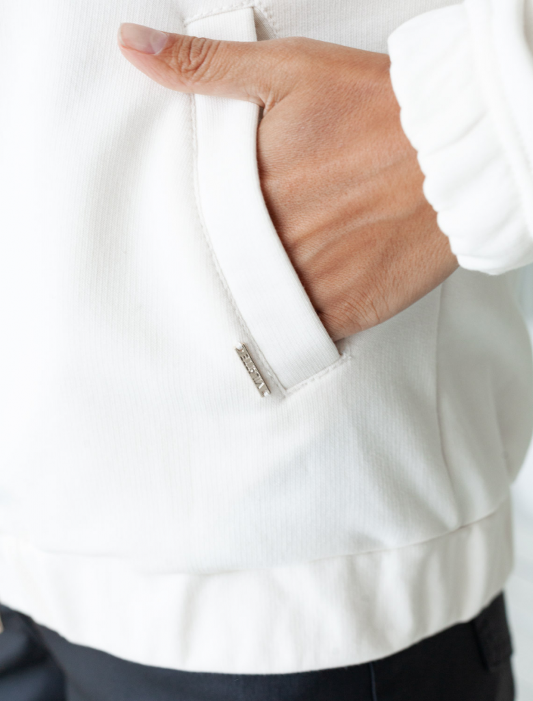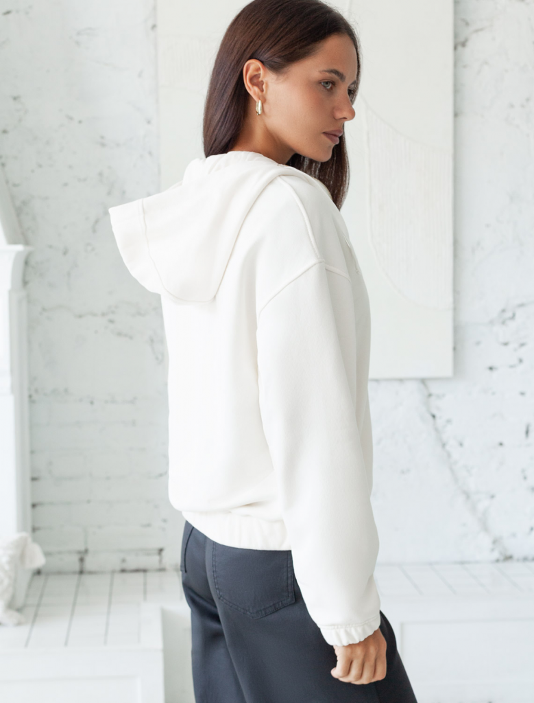 Уютное и стильное зип худи белого цвета на молнии и с капюшоном — идеальный выбор для создания модного повседневного образа в прохладную погоду. Выполнено из эластичного футера двухнитки, натуральный материал дарит комфортное ощущение на протяжении всего дня и отличную воздухопроницаемость. Модель дополнена вышитым логотипом бренда и боковыми карманами. Капюшон со шнуром, резинка по низу и манжеты на рукавах придают джемперу комфорт. Практичная молния делает худи удобным для быстрого переодевания и добавляет нотку спорт шика вашему стилю.Свободный крой подходит для девушек и женщин с фигурой плюс сайз, при этом подчеркивая достоинства и современный образ обладательницы этого спортивного джемпера.Зипка гармонично сочетается с джинсами, брюками или леггинсами, помогая легко составить как расслабленный городской аутфит, так и актуальный спортивный лук для прогулок или встреч с друзьями. Универсальность модели позволяет вписать ее в любой гардероб — она станет базовой вещью для тех, кто ценит практичность вмес