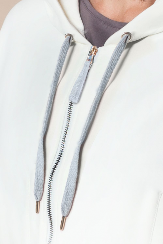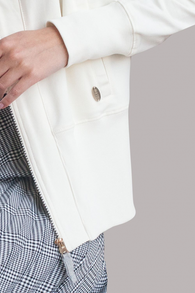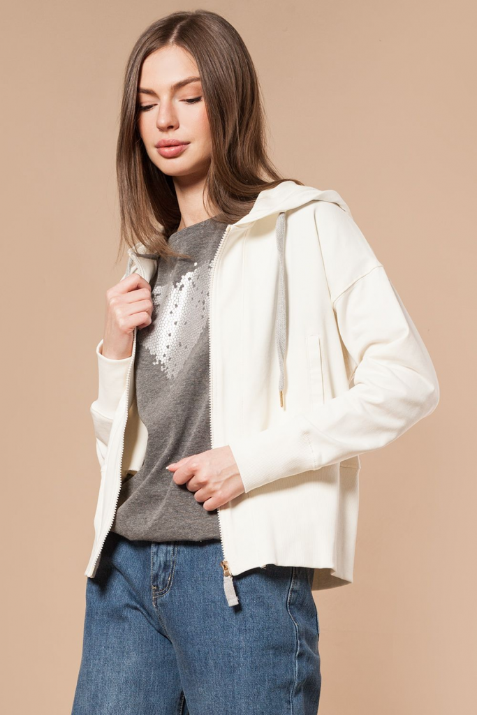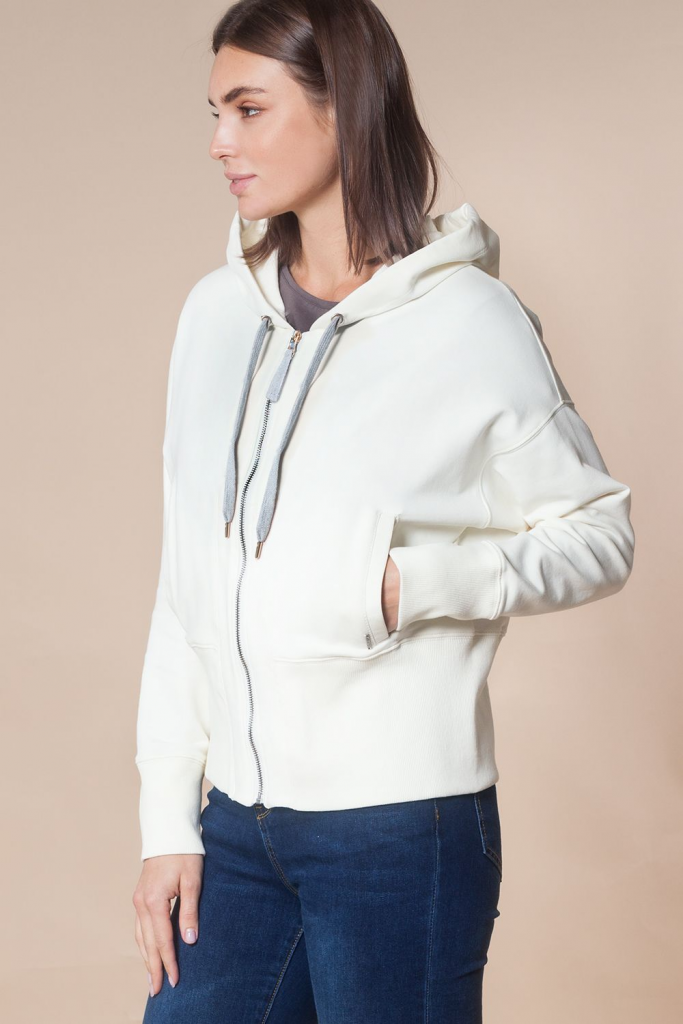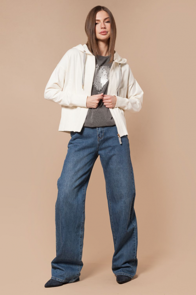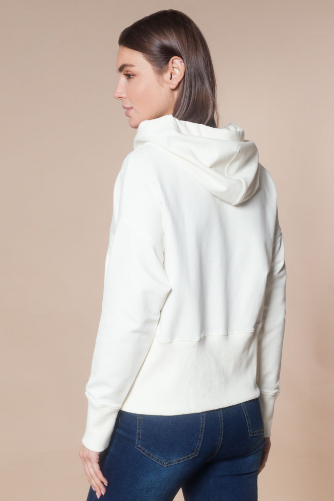 Худи выполнено из футера двухнитки средней плотности с высоким содержанием эластана. Металлическая фурнитура - блестящего золотистого цвета. В качестве шнура использована эффектная лента, что уводит стиль от спорта в повседневно-нарядный. Высокая рибана акцентирует талию.