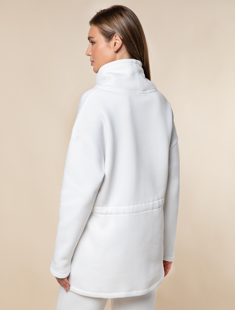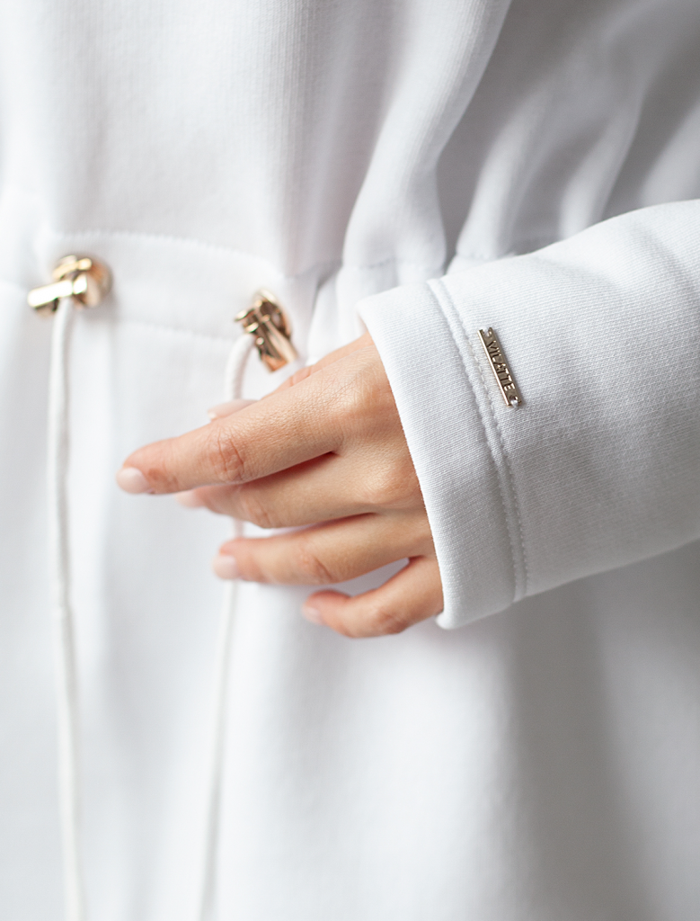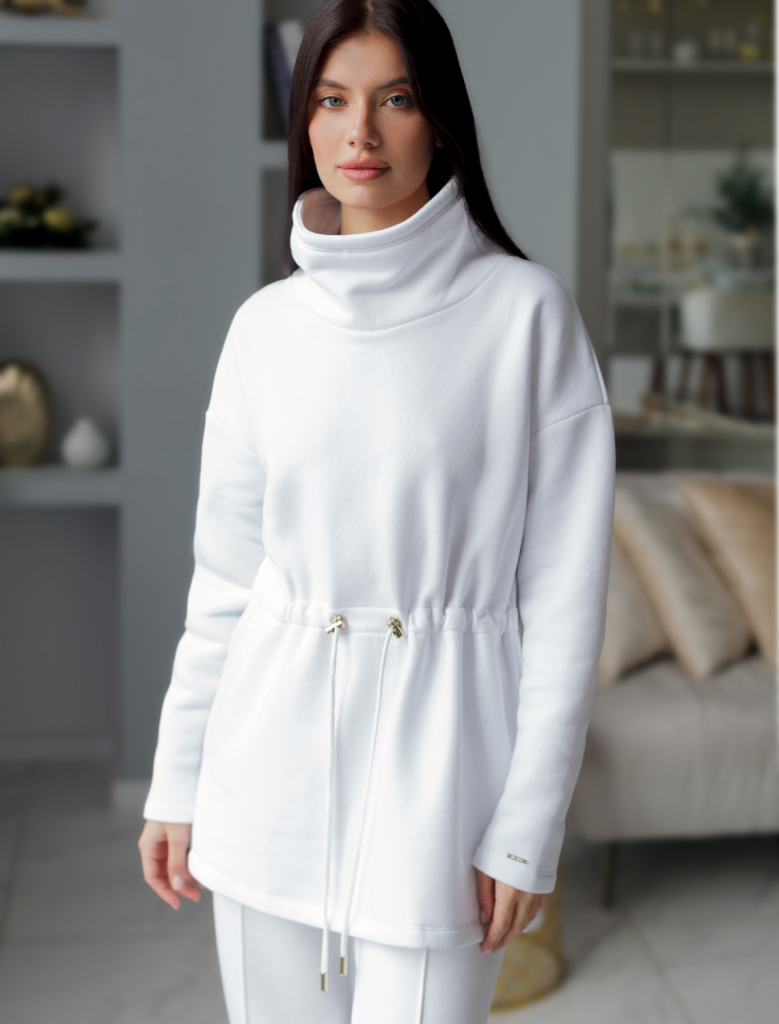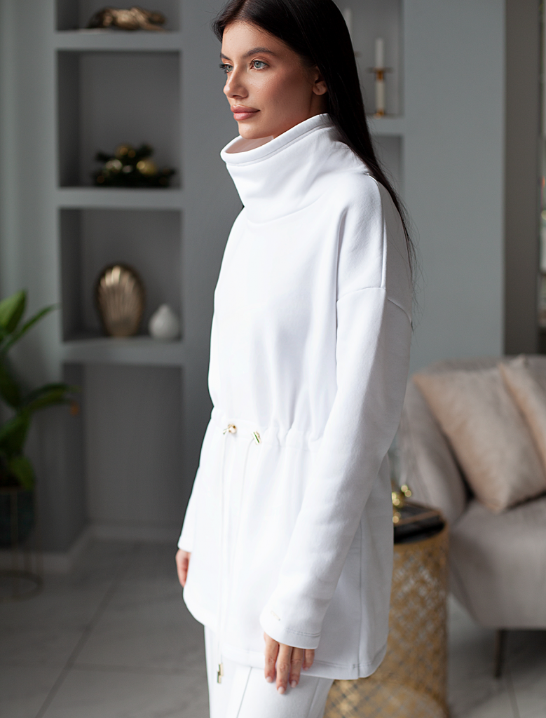 Джемпер выполнен из премиального футера-трехнитки. Модель с начесом дополнена хлопковым шнуром на талии регулируемым стопперами. Регулируя шнурок можно получить сразу две модели, свободный джемпер прямого кроя и дизайнерское решение с акцентом на талии. Соберите костюм вместе с брюками D44.129