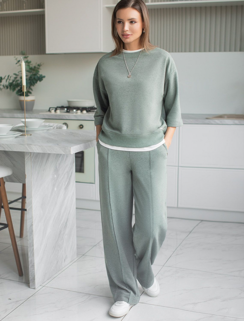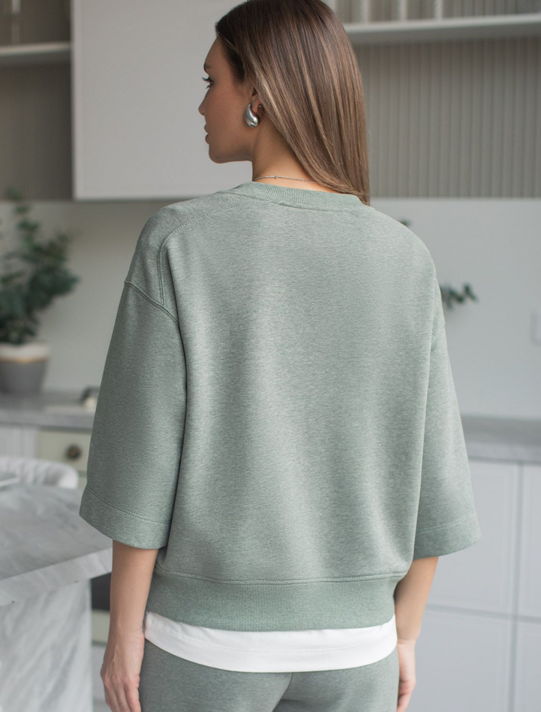 Свободный свитшот оливкового цвета с эффектом меланж выполнен из мягкого петельчатого футера двухнитки с добавлением эластана, что обеспечивает комфортную посадку и комфорт. Материал отличается мягкостью и приятной текстурой, позволяя коже дышать и обеспечивая максимальное удобство при носке, а так же хорошей износостойкостью и сохраняет форму даже после многочисленных стирок. Круглый ворот и широкие рукава средней длины придают свитшоту стильный и современный вид и делают образ расслабленным и непринужденным, такой вариант отлично сядет на большие размеры, подчеркивая достоинства фигуры. .Джемпер идеально подходит для повседневной носки и отлично подойдет тем, кто ценит удобство и свободу движений без компромиссов по стилю. Этот свитшот станет отличным выбором в прохладную погоду в комплекте с бомбером D49,141 или уютным дополнением к домашнему образу в комплекте с брюками D44.157