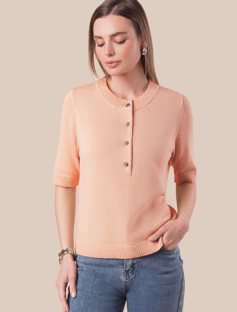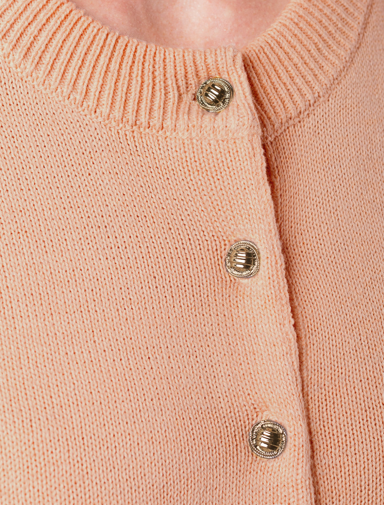 Джемпер тонкой вязки выполнен из хлопка с добавлением кашемира. Модель с круглым вырезом дополнена золотистыми пуговицами. Мягкая и очень приятная пряжа совершенно не колется, сохраняет тепло при этом не перегревая, гарантируя безупречный комфорт.