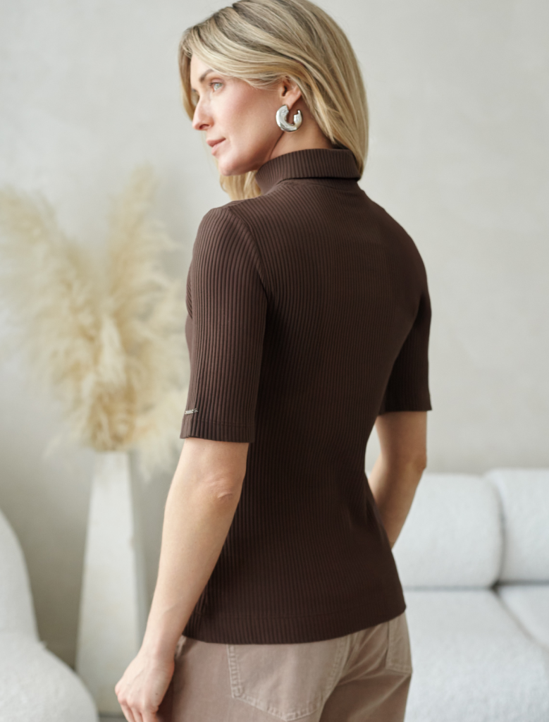 Водолазка с коротким рукавом выполнена из фактурного трикотажа в рубчик. Модель идеально сидит по фигуре не сковывая движения. Хлопковый трикотаж поддерживает оптимальную температуру тела, поэтому в изделии будет комфортно в течении всего дня. Наличие эластана в составе гарантирует формоустойчивости. Водолазка отлично впишется в деловой дресс-код и подойдет для повседневного аутфита.