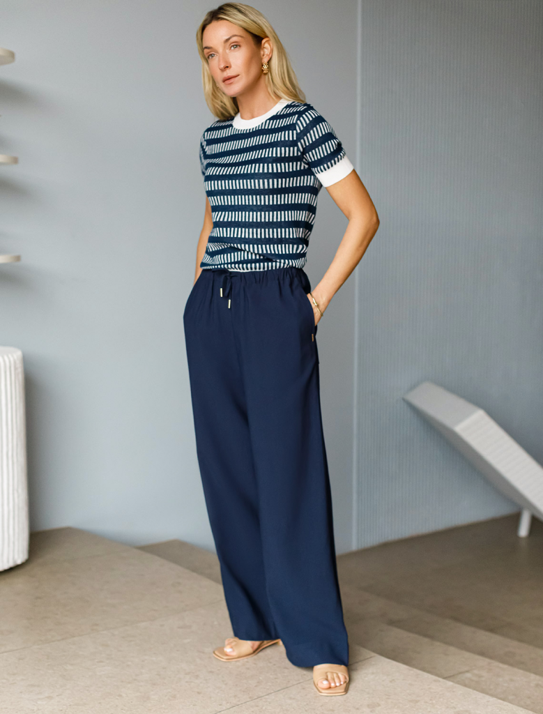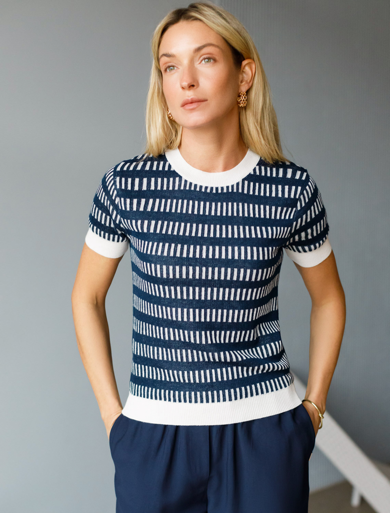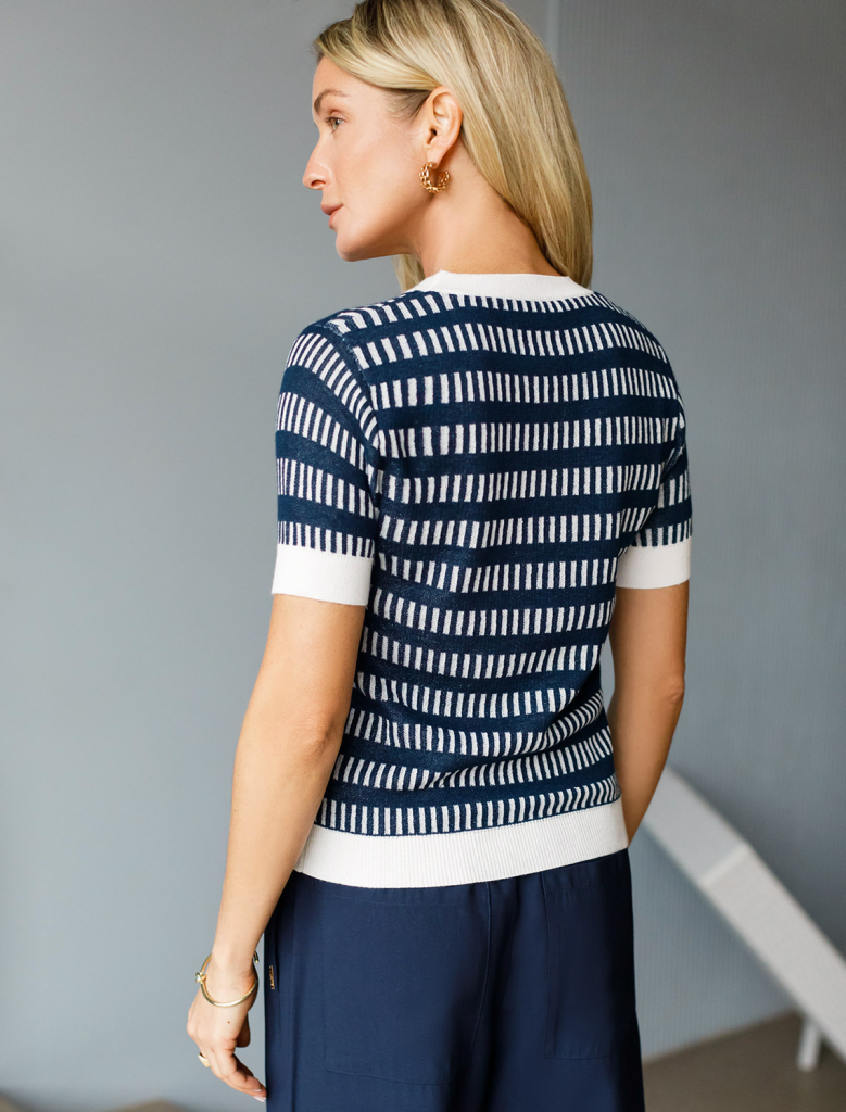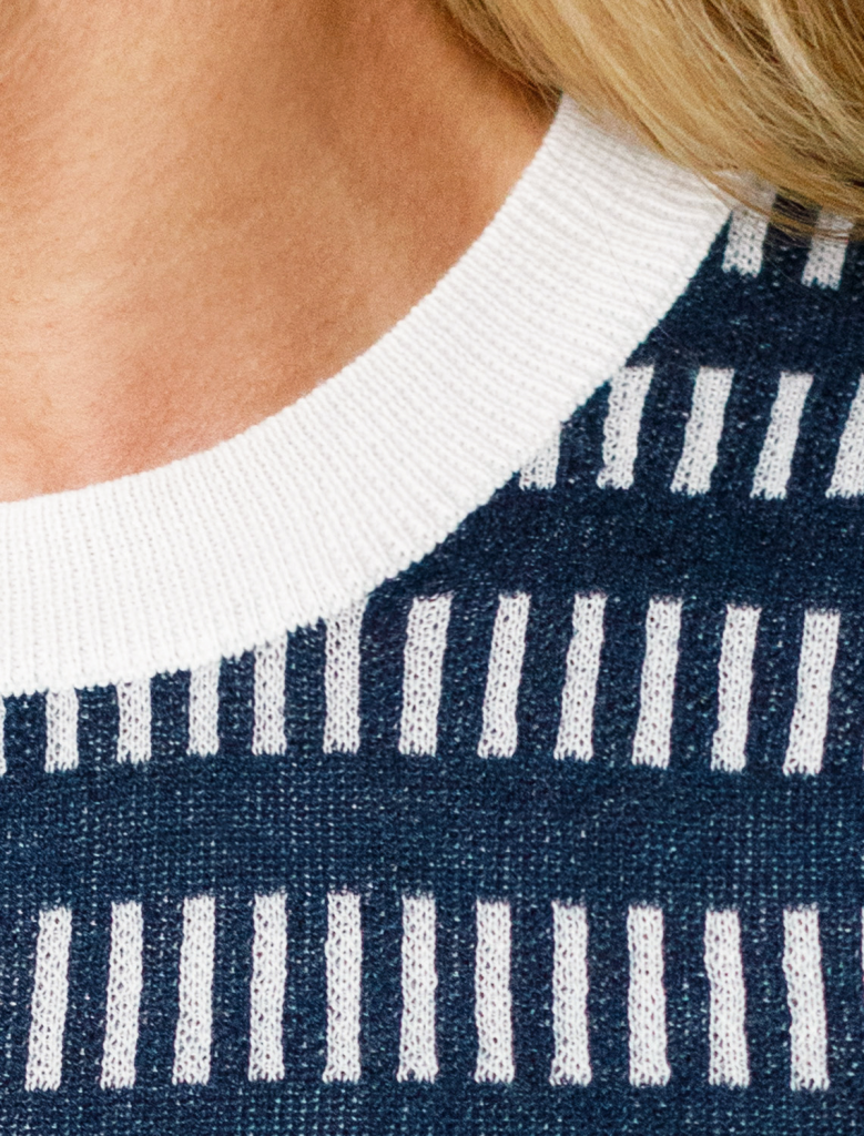 Топ тонкой вязки выполнен из вискозы. Вертикальный вывязанный принт визуально стройнит и вытягивает силуэт. Добавление в состав ПЭ способствует легкости и износостойкости изделия. Мягкая пряжа приятно ощущается на теле и дарит настоящий комфорт в теплое время года. Хорошо сочетается с белыми и синими низами поддерживая морской стиль
