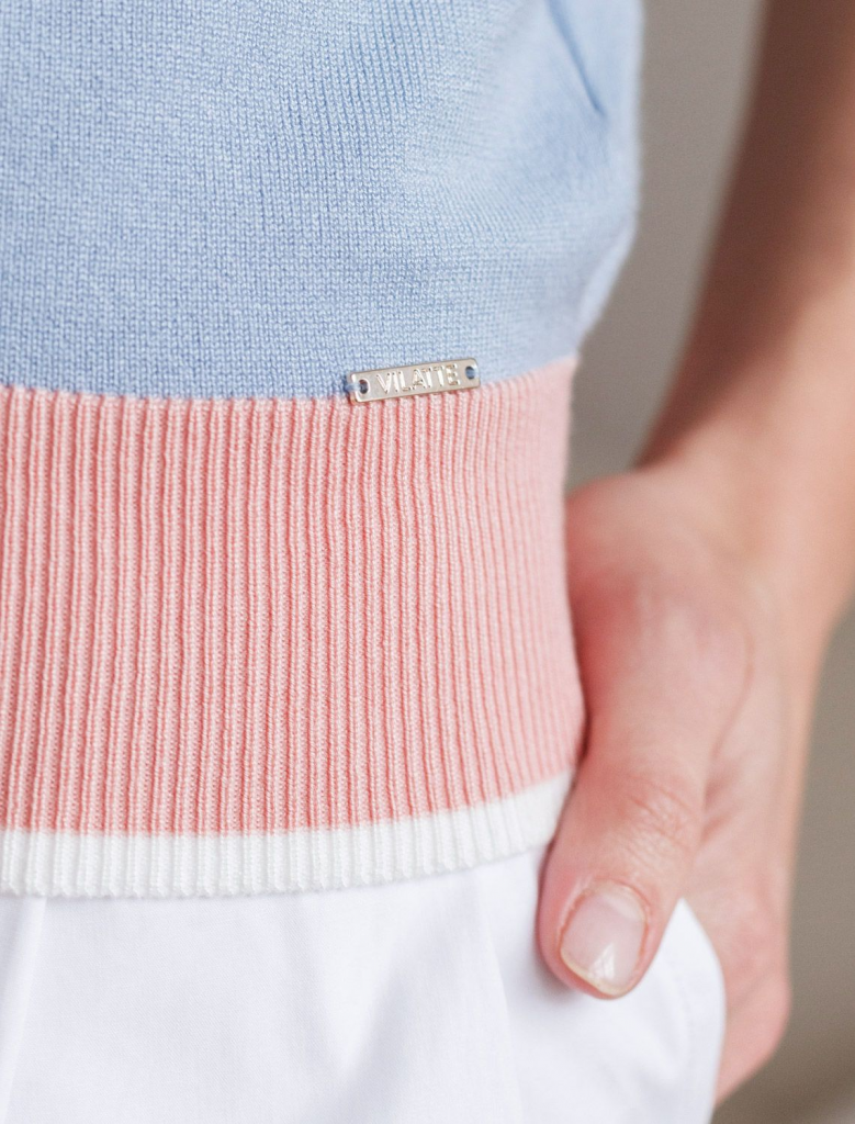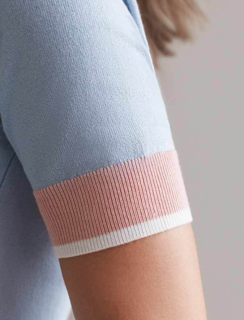 Легкий джемпер светло-голубого цвета с V-вырезом идеально подходит на весну и лето. Тонкая вязка из вискозы дарит приятный комфорт и ощущение свежести в теплую погоду. Полуприлегающий крой подчеркивает силуэт, а универсальная длина позволяет сочетать джемпер с разными элементами гардероба. V-вырез с пуговицами подчеркивает зону декольте и визуально вытягивает шею, делая фигуру более изящной. Контрастная отделка добавляет стильный акцент, создавая выразительный образ. Джемпер отлично смотрится на больших размерах благодаря продуманному крою и полуприлегающему фасону. Этот джемпер с коротким рукавом станет незаменимой частью гардероба в сезоны, когда хочется легкости и элегантности одновременно. Лаконичный дизайн обеспечивает простоту комбинирования с другими вещами и будет универсальной базой для создания разнообразных комплектов — от офисного до непринужденного городского стиля.