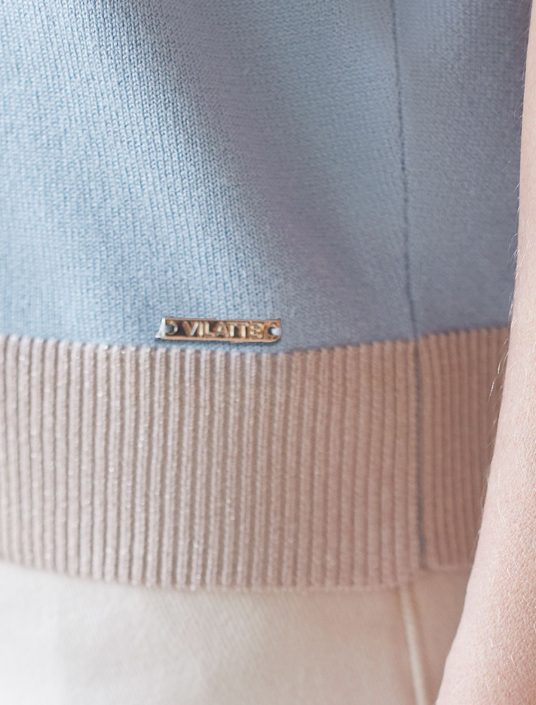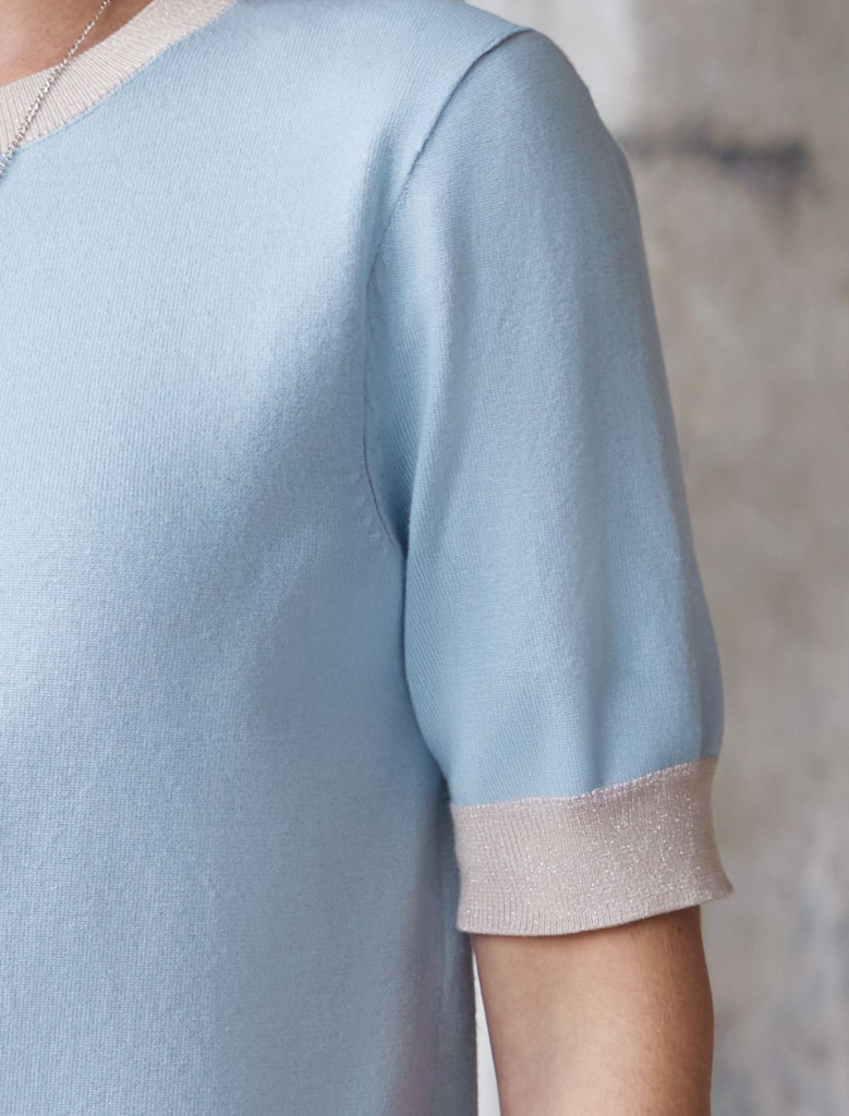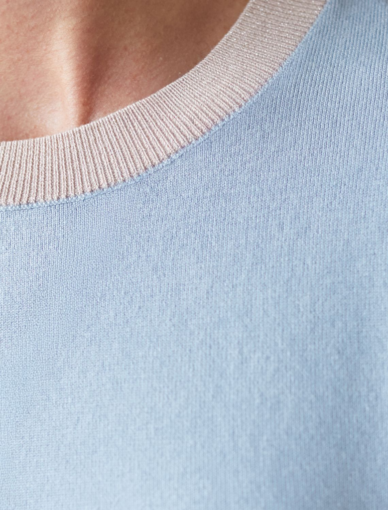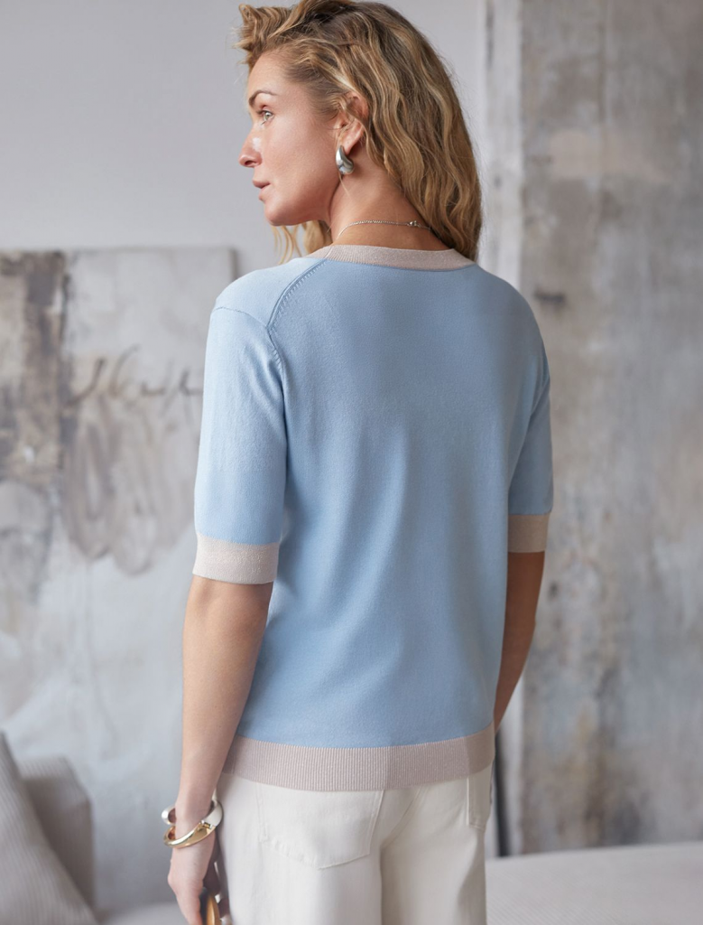 Легкий джемпер светло-голубого цвета с круглым вырезом идеально подходит на весну и лето. Тонкая вязка из вискозы дарит приятный комфорт и ощущение свежести в теплую погоду. Полуприлегающий крой подчеркивает силуэт, а универсальная длина позволяет сочетать джемпер с разными элементами гардероба. Контрастная отделка с мягким люрексом добавляет стильный акцент, создавая выразительный образ. Деликатное мерцание придает праздничное настроение, но не выглядит слишком ярко или вызывающе. Такой элемент украшения позволяет носить нарядный джемпер и на особых мероприятиях. Джемпер отлично смотрится на больших размерах благодаря продуманному крою и полуприлегающему фасону. Этот джемпер с коротким рукавом станет незаменимой частью гардероба в сезоны, когда хочется легкости и элегантности одновременно. Лаконичный дизайн обеспечивает простоту комбинирования с другими вещами и будет универсальной базой для создания разнообразных комплектов — от офисного до непринужденного городского стиля.