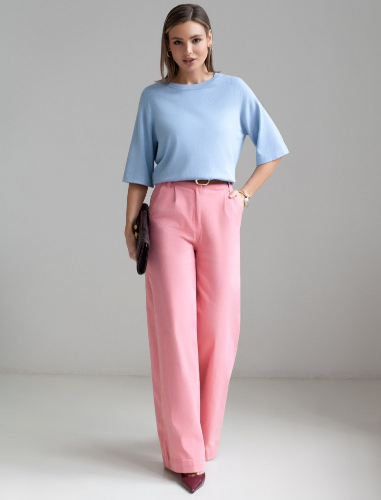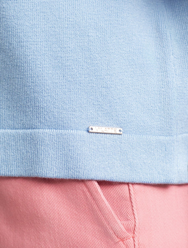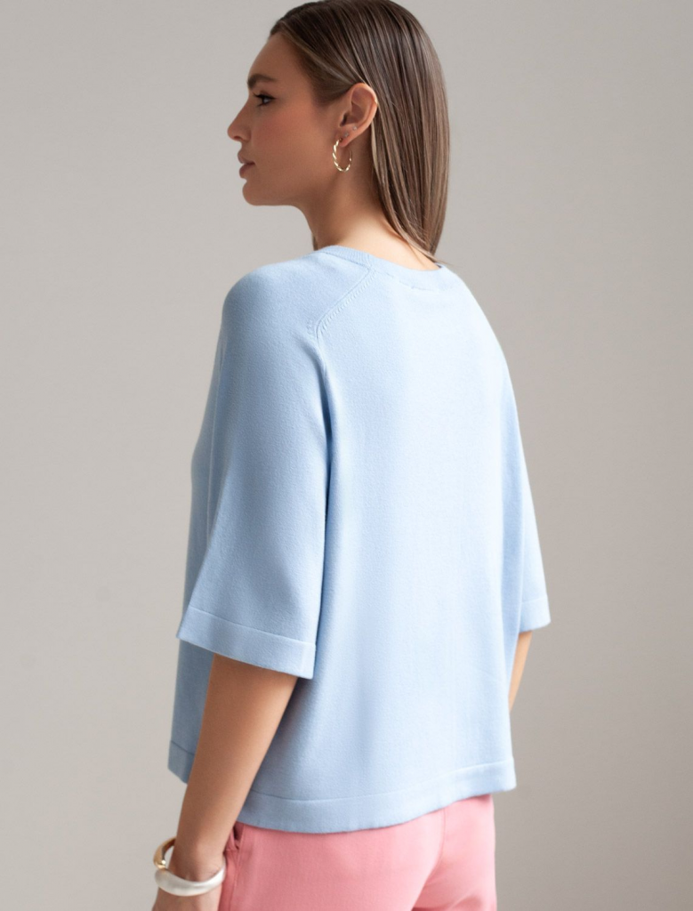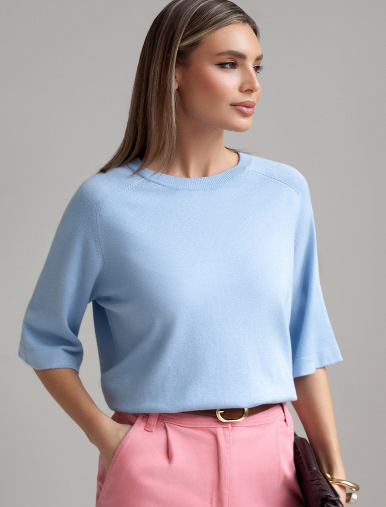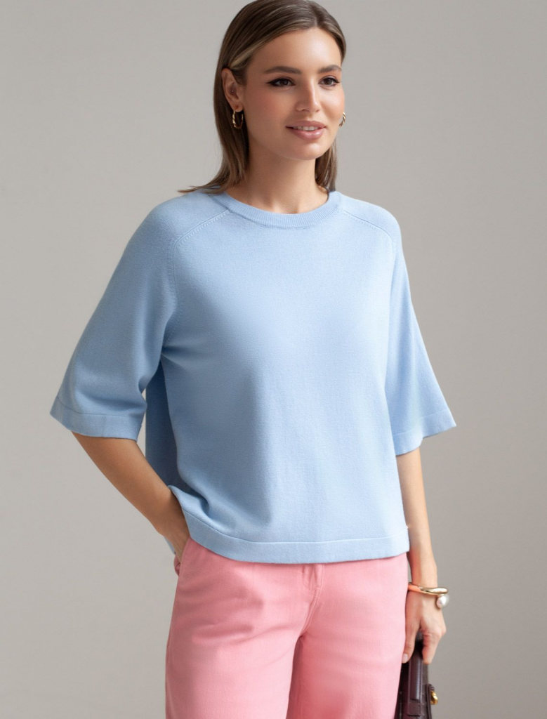 Легкий свободный джемпер светло-голубого цвета с круглым вырезом идеально подходит на весну и лето. Тонкая вязка из вискозы дарит приятный комфорт и ощущение свежести в теплую погоду. Универсальная длина позволяет сочетать джемпер с разными элементами гардероба. Джемпер отлично смотрится на больших размерах благодаря продуманному крою и свободному фасону. Широкие рукава создают воздушность и делают силуэт особенно женственным. Этот джемпер с рукавом 3/4 станет незаменимой частью гардероба в сезоны, когда хочется легкости и элегантности одновременно. Лаконичный дизайн обеспечивает простоту комбинирования с другими вещами и будет универсальной базой для создания разнообразных комплектов — от офисного до непринужденного городского стиля.