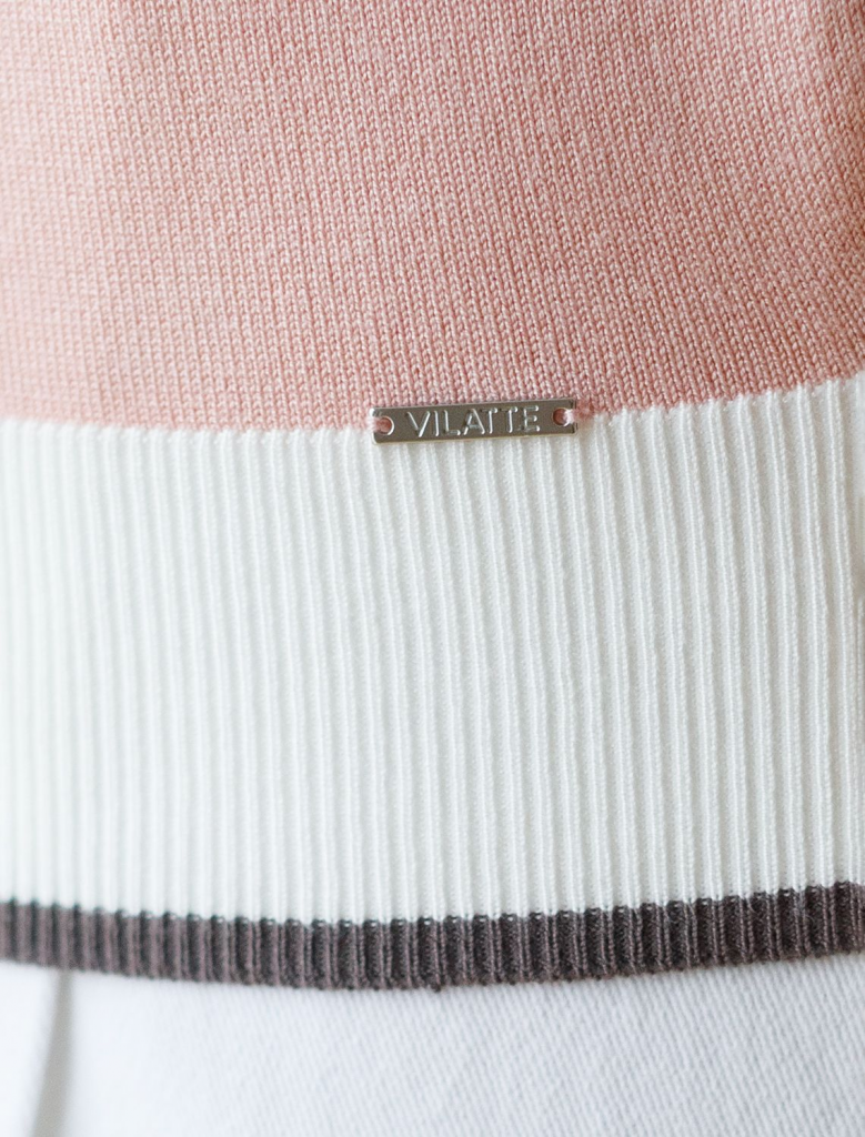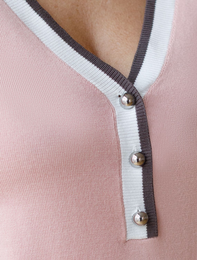 Легкий джемпер светло-розового цвета с V-вырезом идеально подходит на весну и лето. Тонкая вязка из вискозы дарит приятный комфорт и ощущение свежести в теплую погоду. Полуприлегающий крой подчеркивает силуэт, а универсальная длина позволяет сочетать джемпер с разными элементами гардероба. V-вырез с пуговицами подчеркивает зону декольте и визуально вытягивает шею, делая фигуру более изящной. Контрастная отделка добавляет стильный акцент, создавая выразительный образ. Джемпер отлично смотрится на больших размерах благодаря продуманному крою и полуприлегающему фасону. Этот джемпер с коротким рукавом станет незаменимой частью гардероба в сезоны, когда хочется легкости и элегантности одновременно. Лаконичный дизайн обеспечивает простоту комбинирования с другими вещами и будет универсальной базой для создания разнообразных комплектов — от офисного до непринужденного городского стиля.