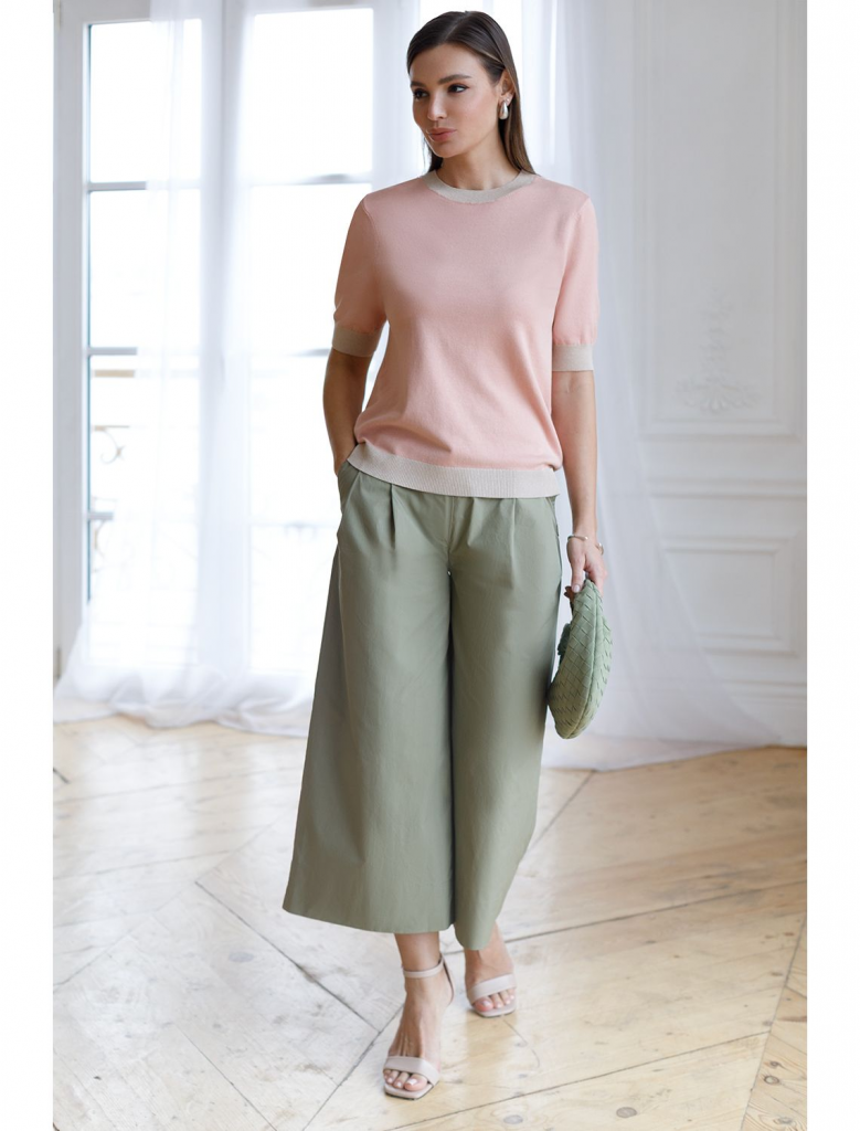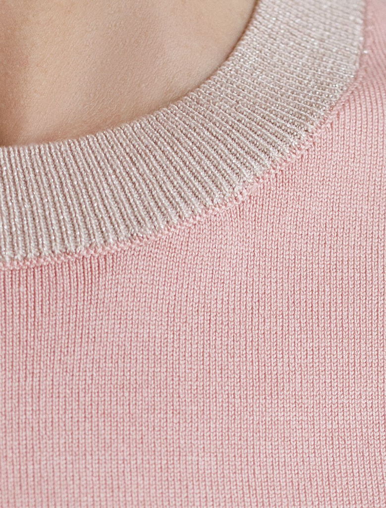 Легкий джемпер светло-розового цвета с круглым вырезом идеально подходит на весну и лето. Тонкая вязка из вискозы дарит приятный комфорт и ощущение свежести в теплую погоду. Полуприлегающий крой подчеркивает силуэт, а универсальная длина позволяет сочетать джемпер с разными элементами гардероба. Контрастная отделка с мягким люрексом добавляет стильный акцент, создавая выразительный образ. Деликатное мерцание придает праздничное настроение, но не выглядит слишком ярко или вызывающе. Такой элемент украшения позволяет носить нарядный джемпер и на особых мероприятиях. Джемпер отлично смотрится на больших размерах благодаря продуманному крою и полуприлегающему фасону. Этот джемпер с коротким рукавом станет незаменимой частью гардероба в сезоны, когда хочется легкости и элегантности одновременно. Лаконичный дизайн обеспечивает простоту комбинирования с другими вещами и будет универсальной базой для создания разнообразных комплектов — от офисного до непринужденного городского стиля.