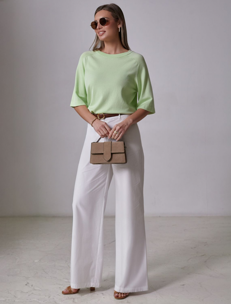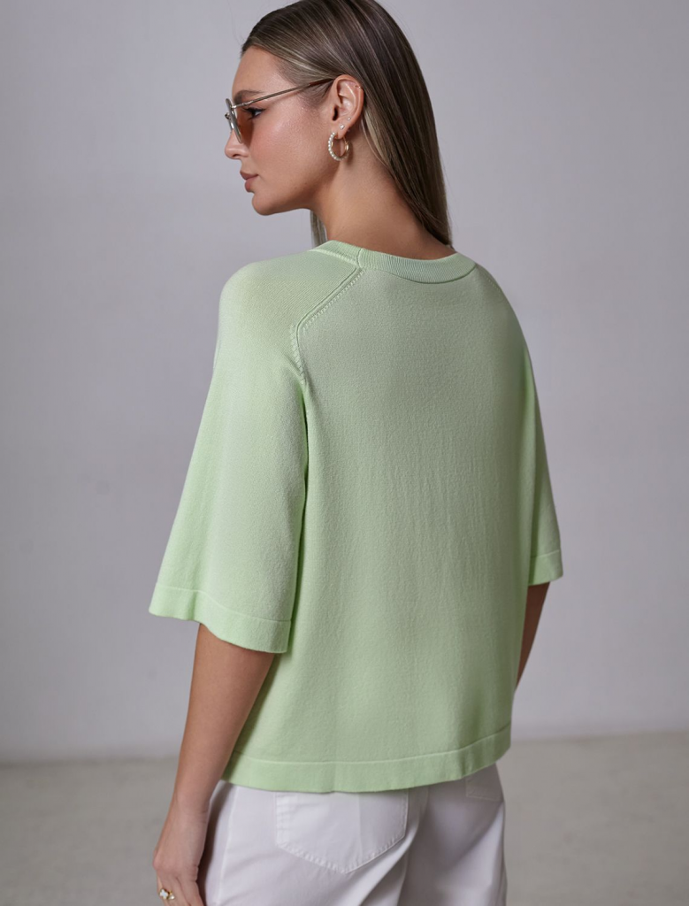 Легкий свободный джемпер светло-зеленого цвета с круглым вырезом идеально подходит на весну и лето. Тонкая вязка из вискозы дарит приятный комфорт и ощущение свежести в теплую погоду. Универсальная длина позволяет сочетать джемпер с разными элементами гардероба. Джемпер отлично смотрится на больших размерах благодаря продуманному крою и свободному фасону. Широкие рукава создают воздушность и делают силуэт особенно женственным. Этот джемпер с рукавом 3/4 станет незаменимой частью гардероба в сезоны, когда хочется легкости и элегантности одновременно. Лаконичный дизайн обеспечивает простоту комбинирования с другими вещами и будет универсальной базой для создания разнообразных комплектов — от офисного до непринужденного городского стиля.